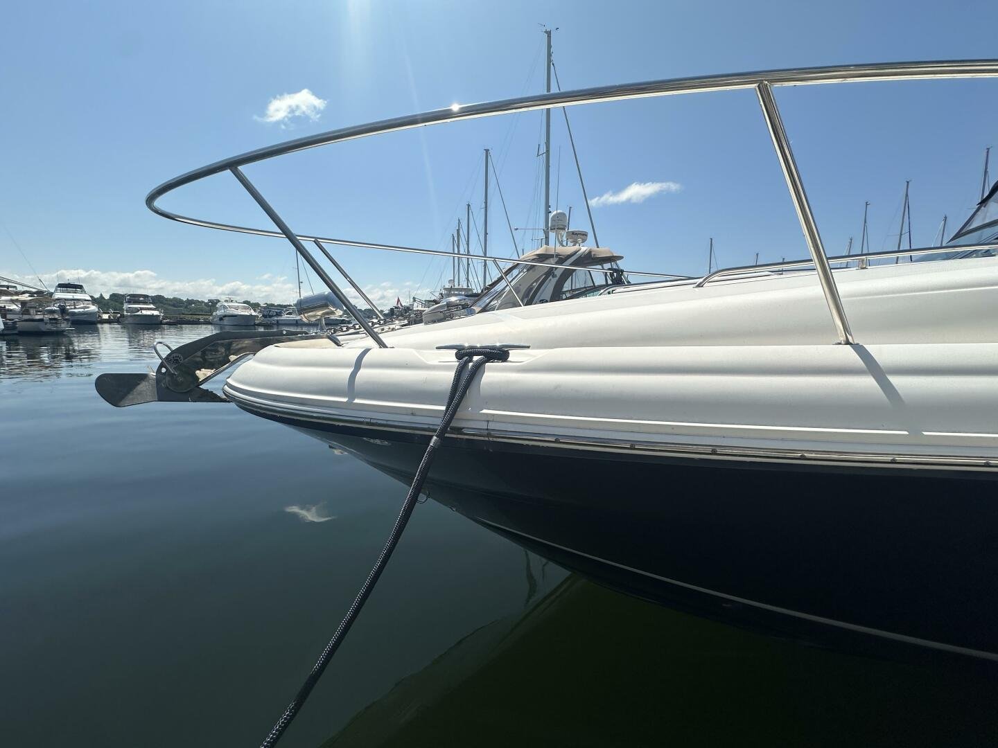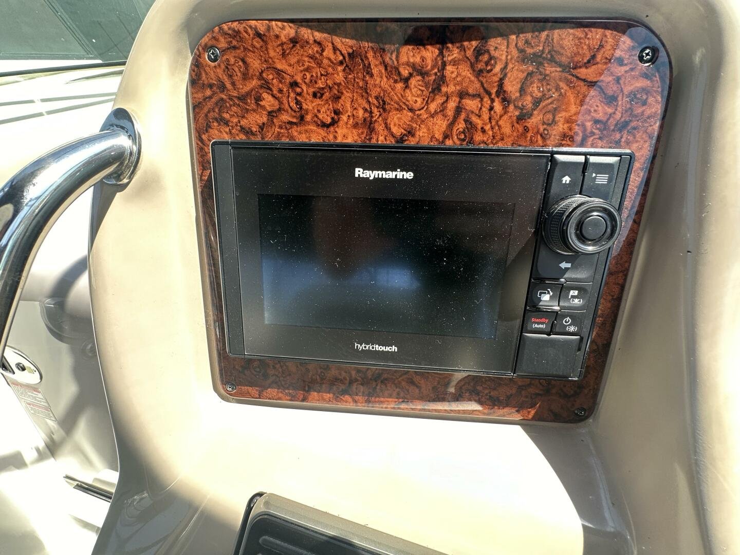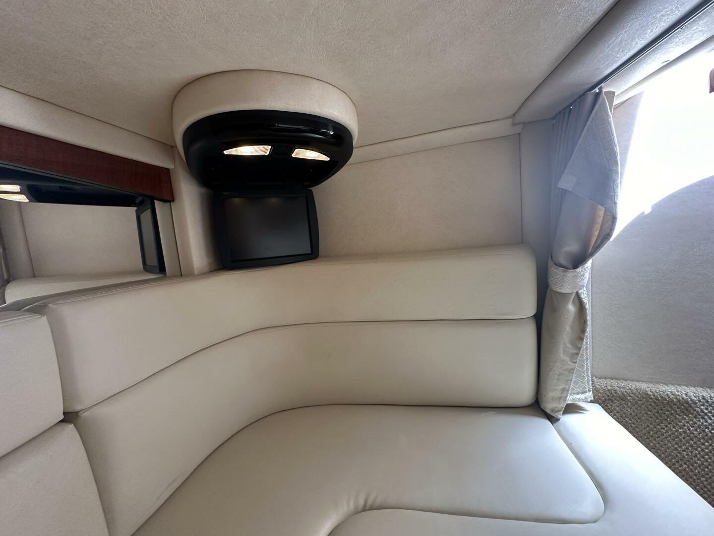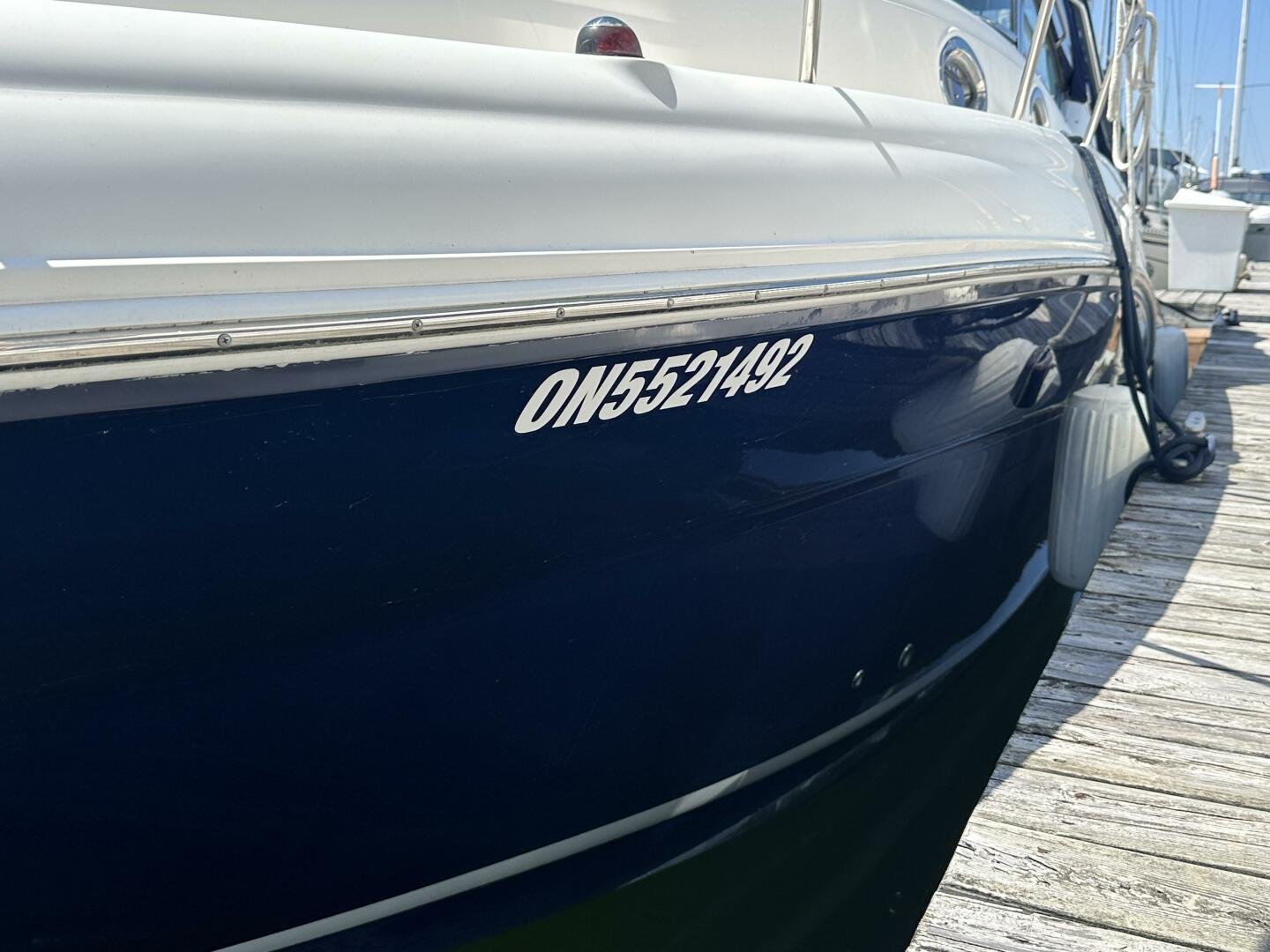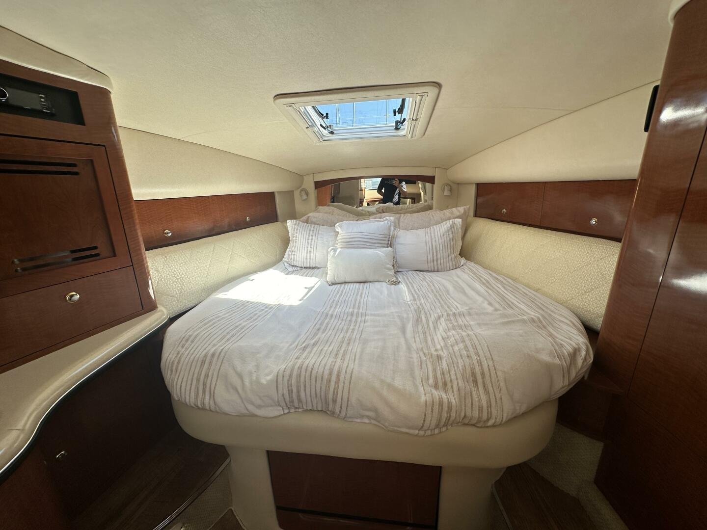 Down below, you have an aft U-shaped lounge that converts into a double berth, a large salon settee w/dinette, a vacuum-flush head with shower, and a fully appointed galley. There are also more speakers down below, clean upholstery, and cabinetry, and clean bilges! The interior finish is high gloss cherry paneling, with no delamination!