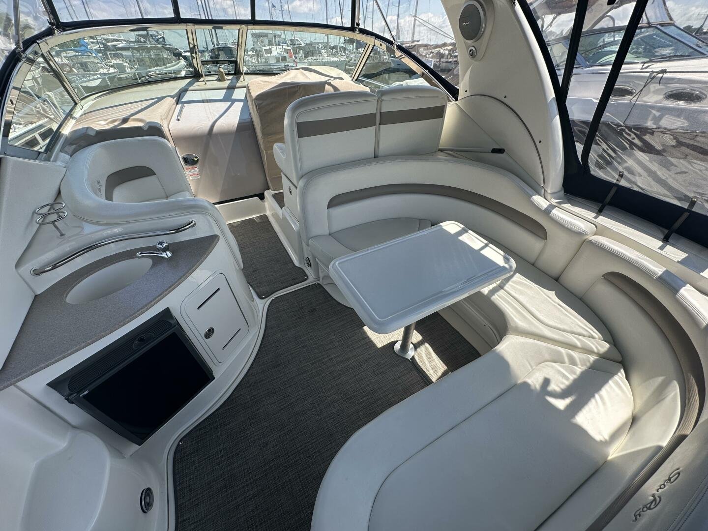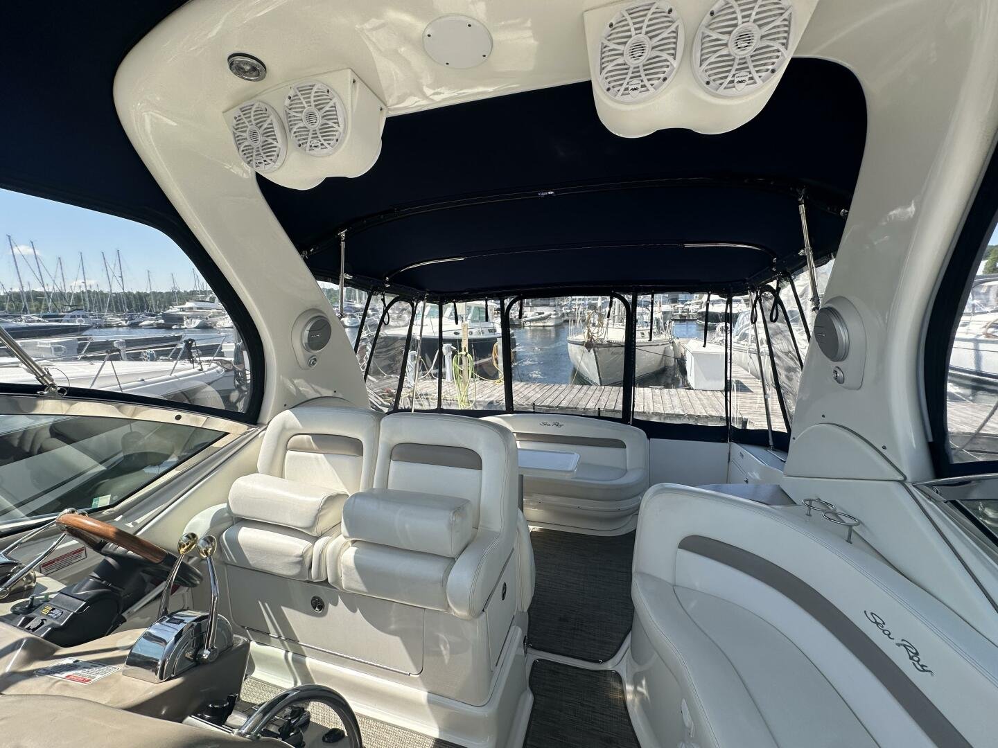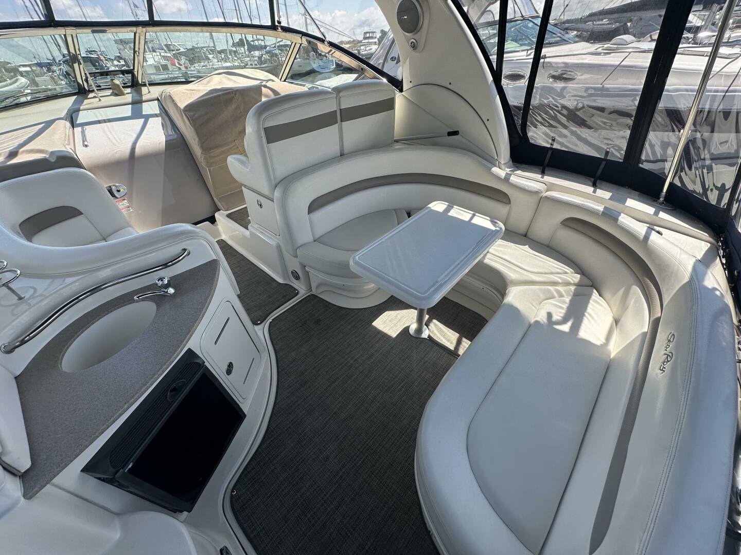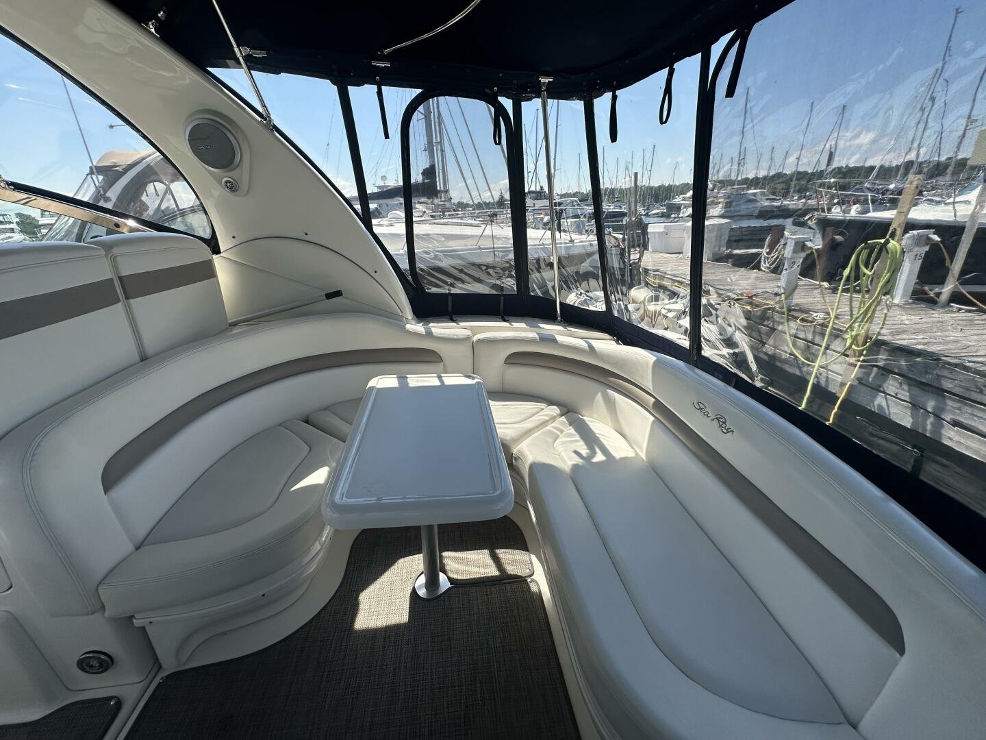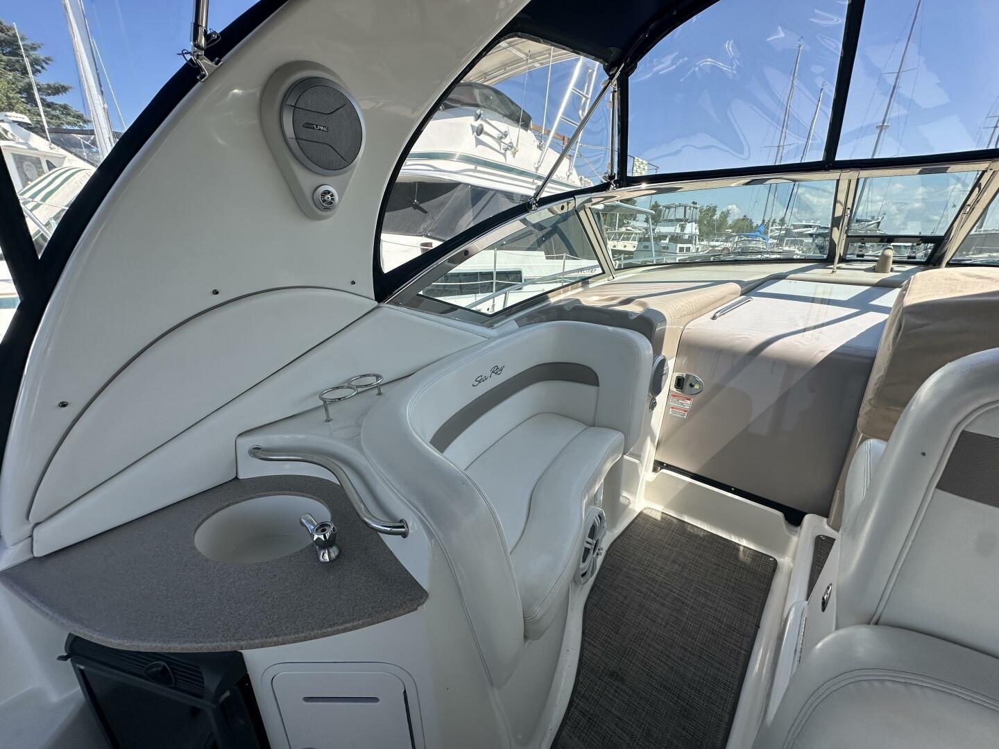 The Sea Ray 320 Sundancer was one of Sea Ray's most popular models for good reason! This example was just updated with a fresh full enclosure canvas from AMR Tops. Stepping on board, there is a new seagrass snap in carpet. There is a wet bar and 12v fridge to port, and the signature Sea Ray U-shaped seating to starboard. At the helm, you'll find the controls to the top engine package for the 320, a pair of 6.2L MAG MPI's 320HP with 850 hours of freshwater use. The electronics have been updated with a Raymarine Hybrid touch chart plotter and Raymarine VHF. You will also find the controls for the stereo system. This is no regular system, with 8x Wetsound speakers on the arch, multiple subwoofers, speakers, and tweeters throughout, as well as a Fusion controller on the transom.