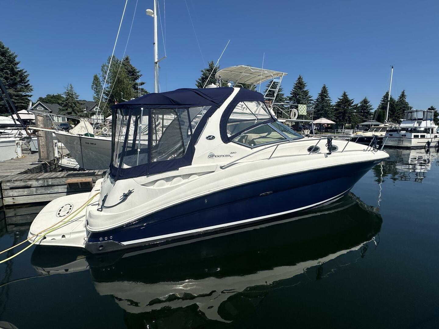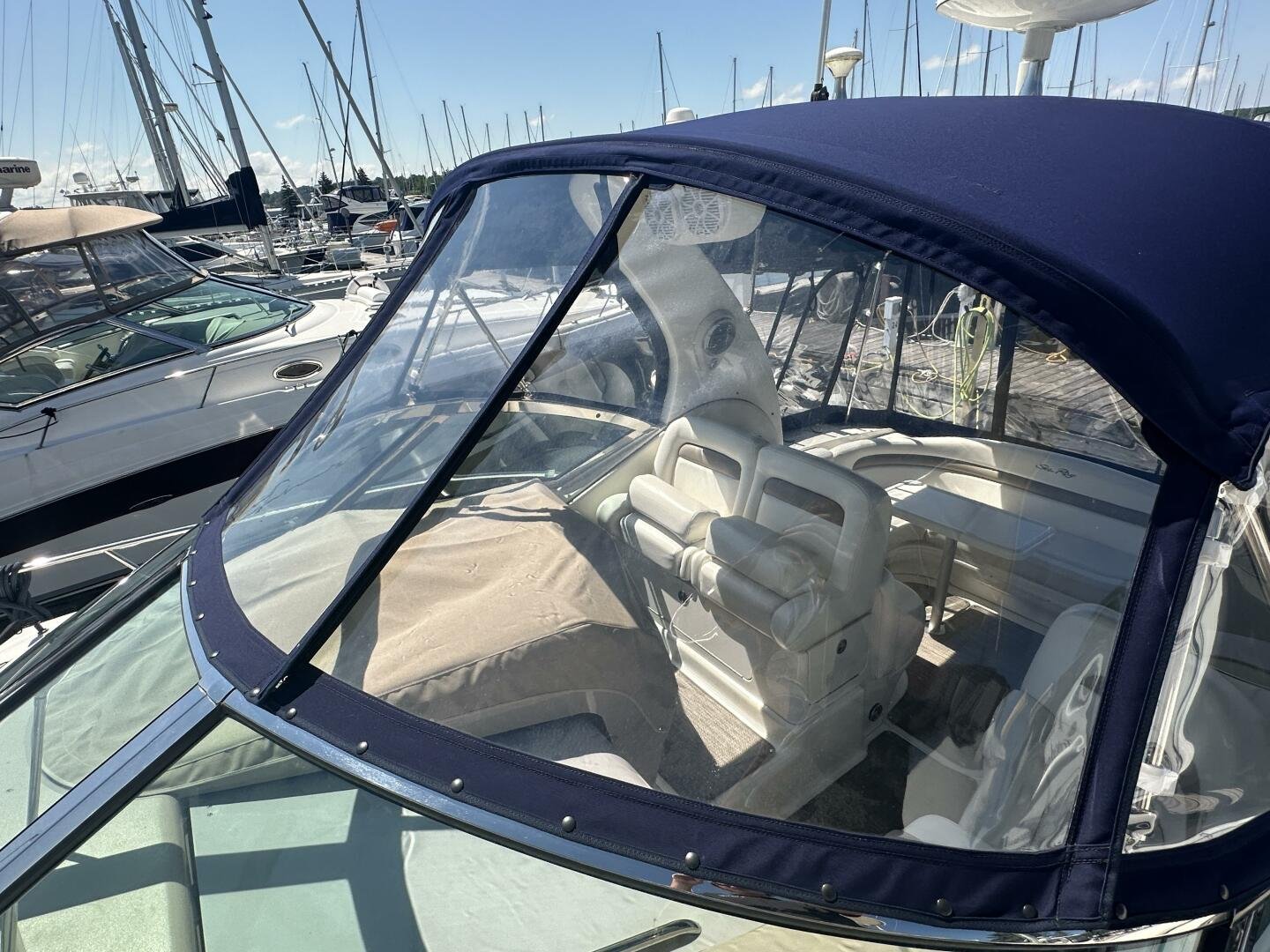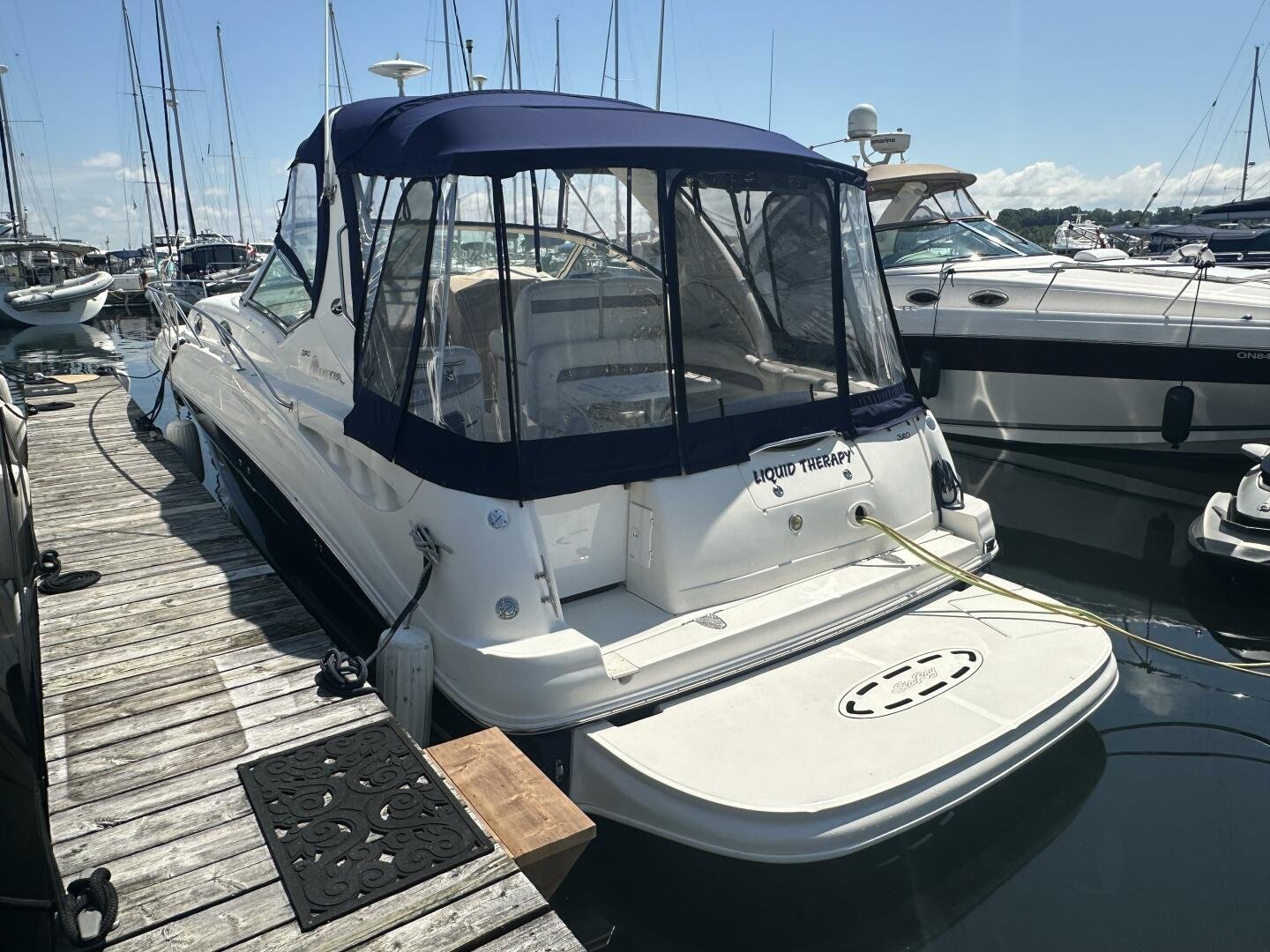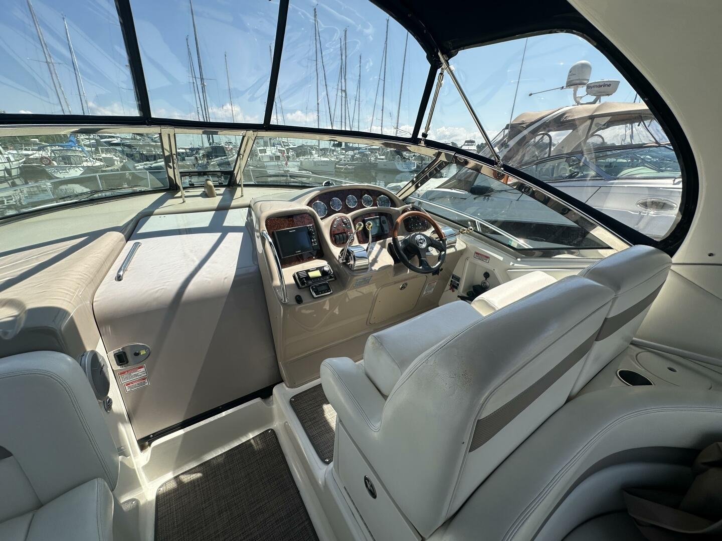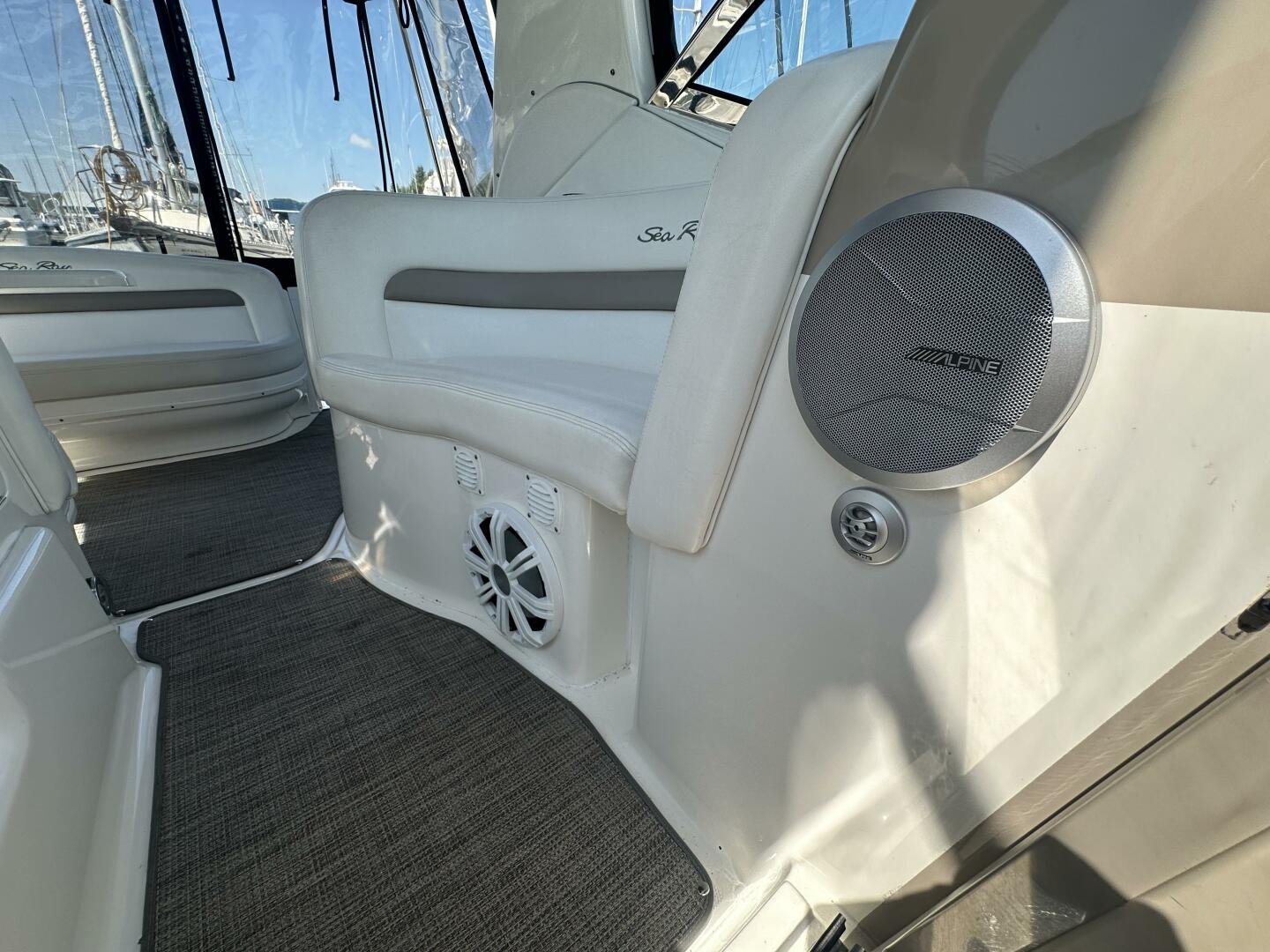 The Sea Ray 320 Sundancer was one of Sea Ray's most popular models for good reason! This example was just updated with a fresh full enclosure canvas from AMR Tops. Stepping on board, there is a new seagrass snap in carpet. There is a wet bar and 12v fridge to port, and the signature Sea Ray U-shaped seating to starboard. At the helm, you'll find the controls to the top engine package for the 320, a pair of 6.2L MAG MPI's 320HP with 850 hours of freshwater use. The electronics have been updated with a Raymarine Hybrid touch chart plotter and Raymarine VHF. You will also find the controls for the stereo system. This is no regular system, with 8x Wetsound speakers on the arch, multiple subwoofers, speakers, and tweeters throughout, as well as a Fusion controller on the transom.