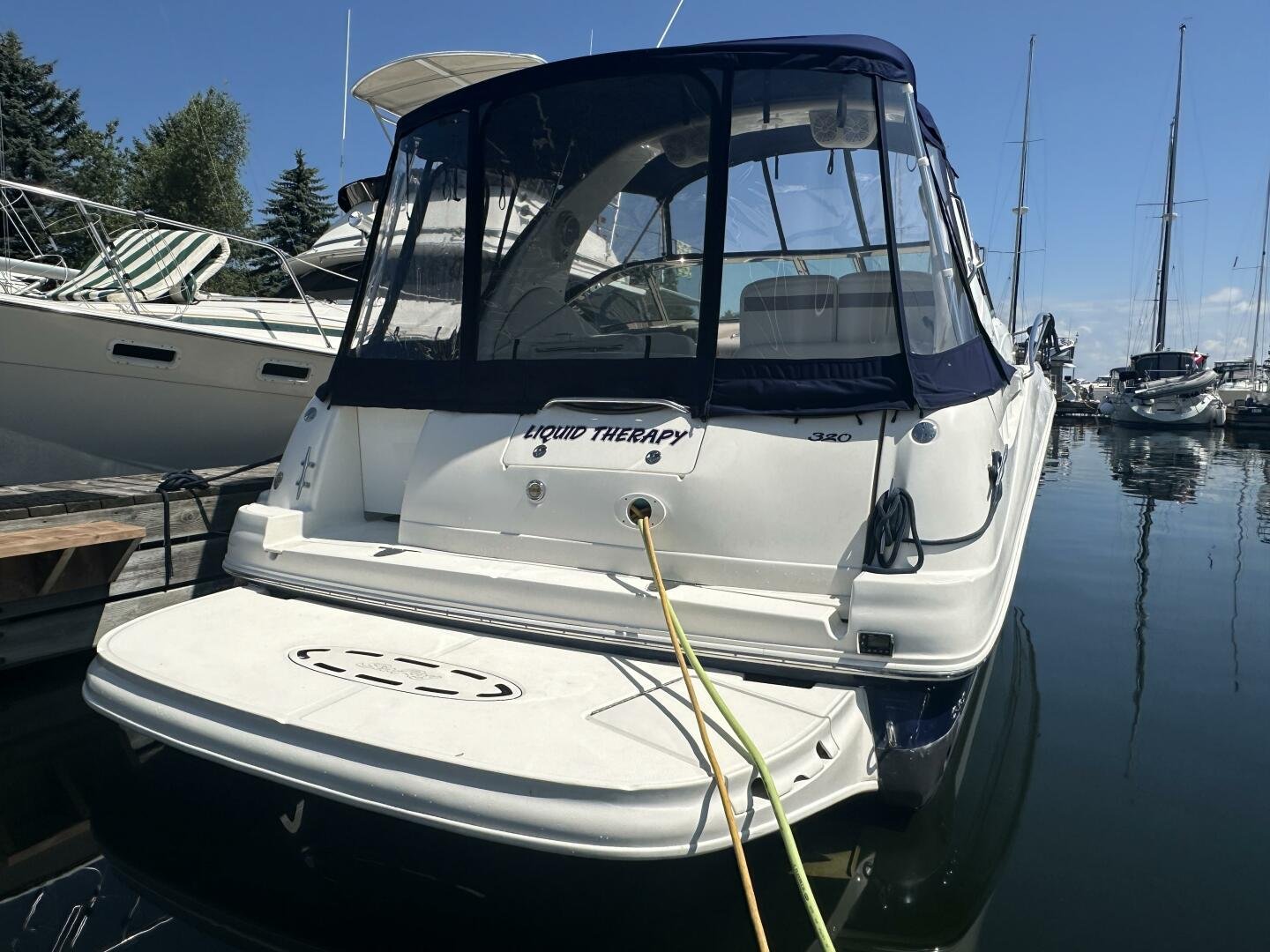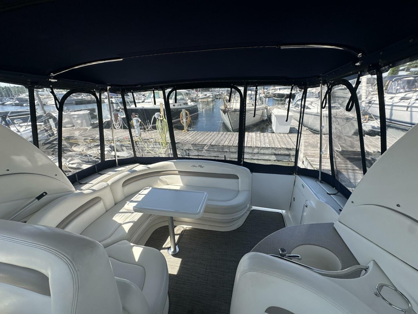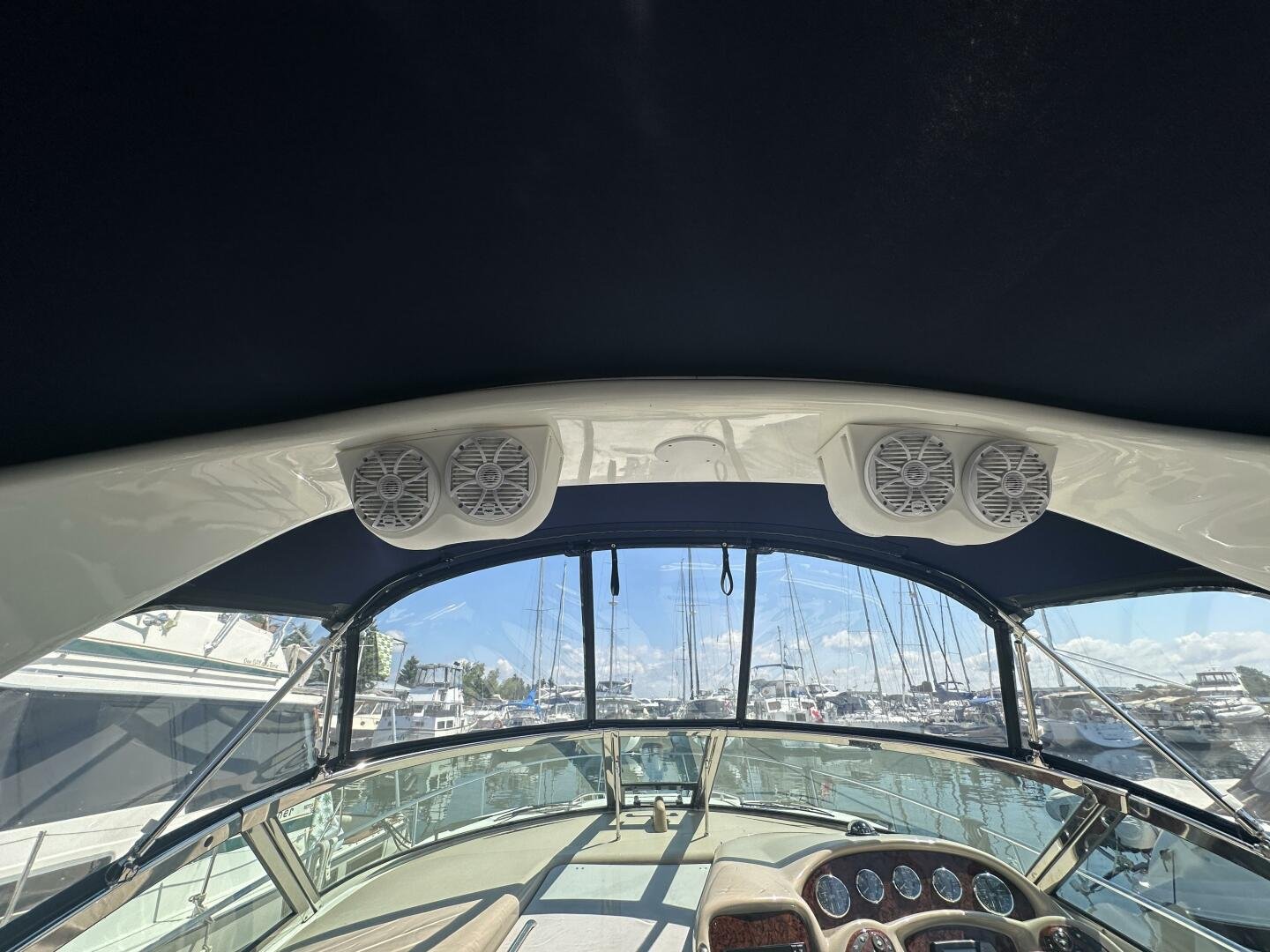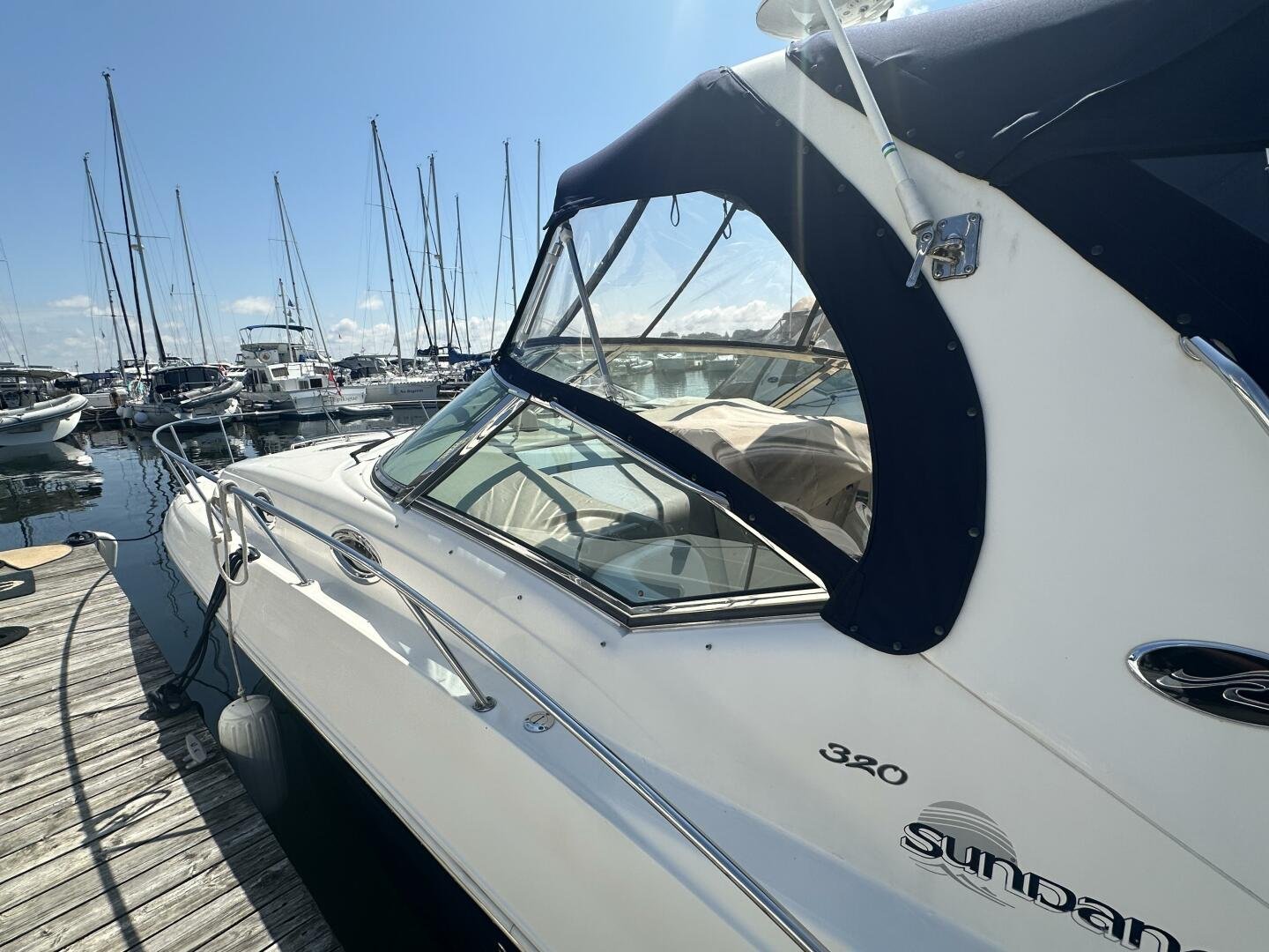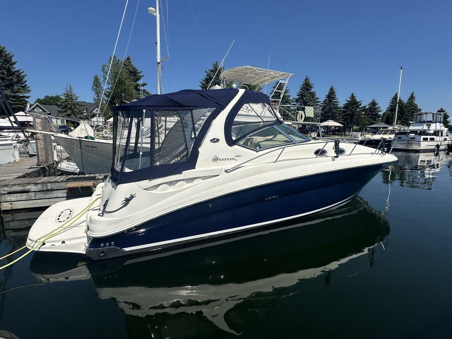 The Sea Ray 320 Sundancer was one of Sea Ray's most popular models for good reason! This example was just updated with a fresh full enclosure canvas from AMR Tops. Stepping on board, there is a new seagrass snap in carpet. There is a wet bar and 12v fridge to port, and the signature Sea Ray U-shaped seating to starboard. At the helm, you'll find the controls to the top engine package for the 320, a pair of 6.2L MAG MPI's 320HP with 850 hours of freshwater use. The electronics have been updated with a Raymarine Hybrid touch chart plotter and Raymarine VHF. You will also find the controls for the stereo system. This is no regular system, with 8x Wetsound speakers on the arch, multiple subwoofers, speakers, and tweeters throughout, as well as a Fusion controller on the transom.