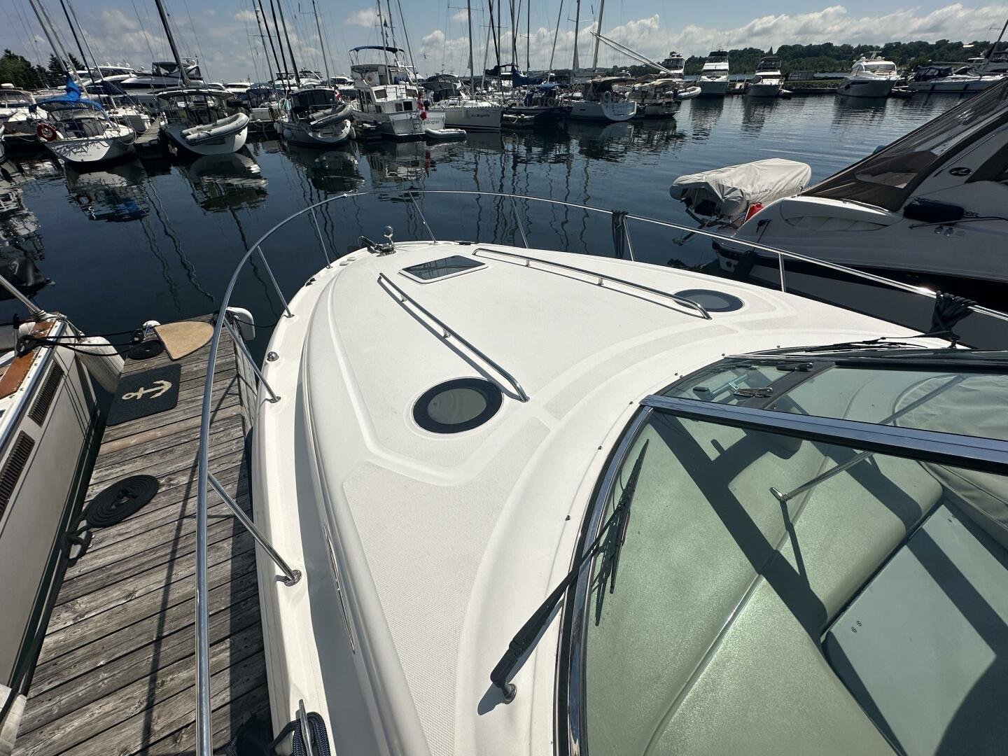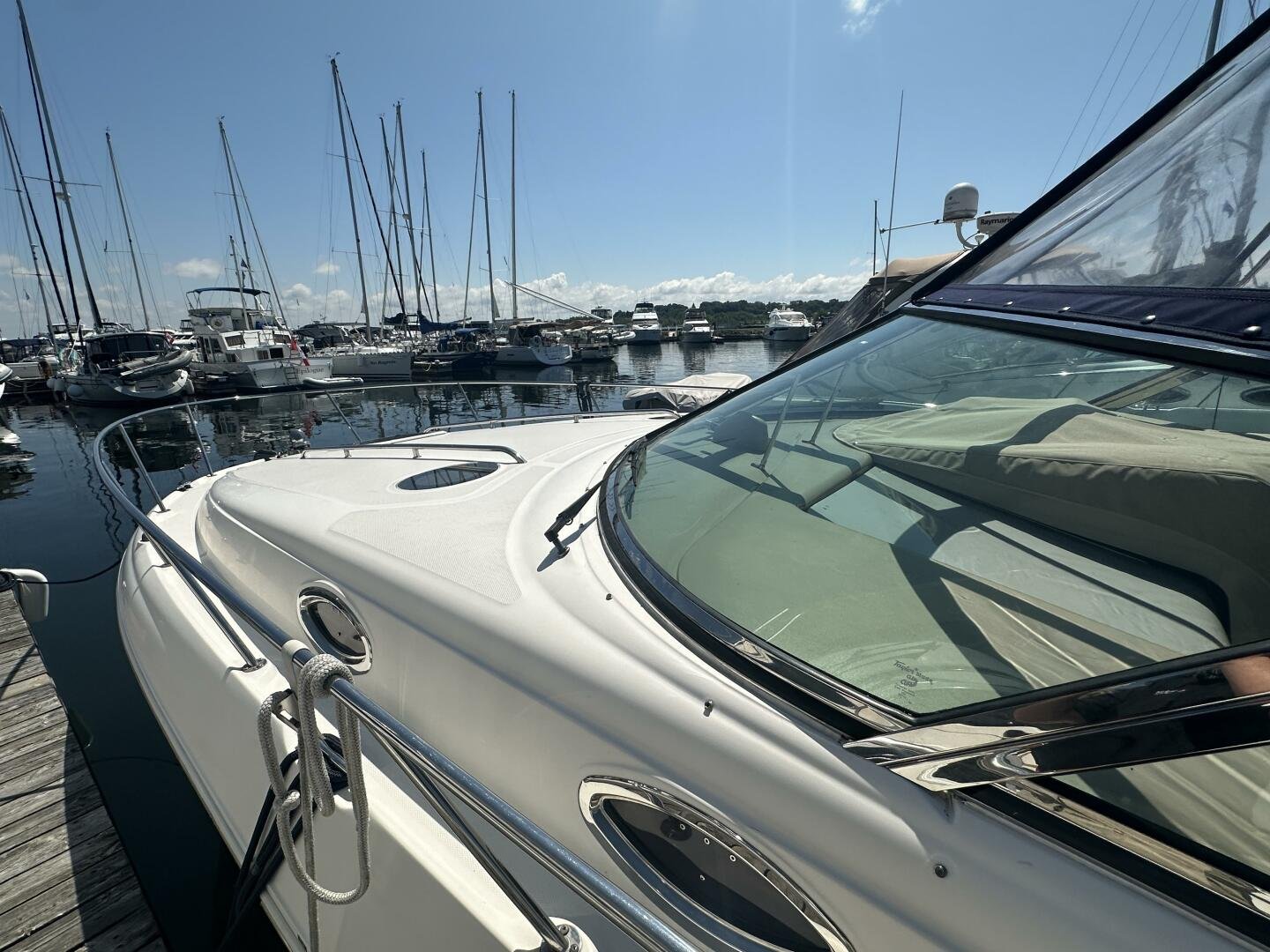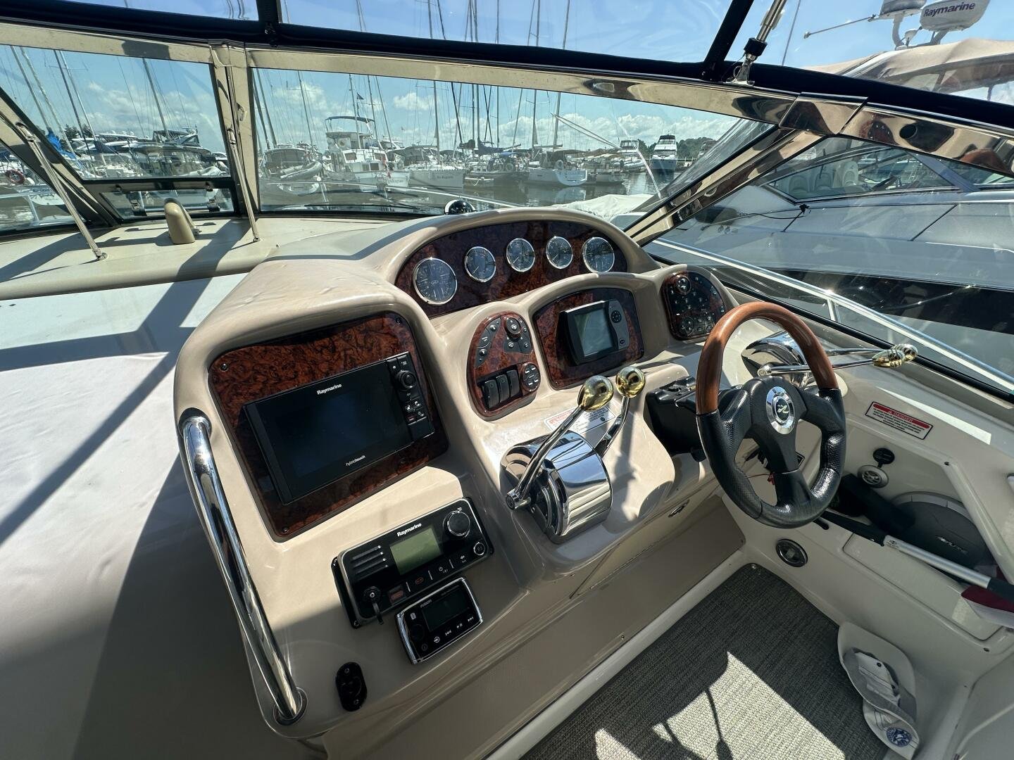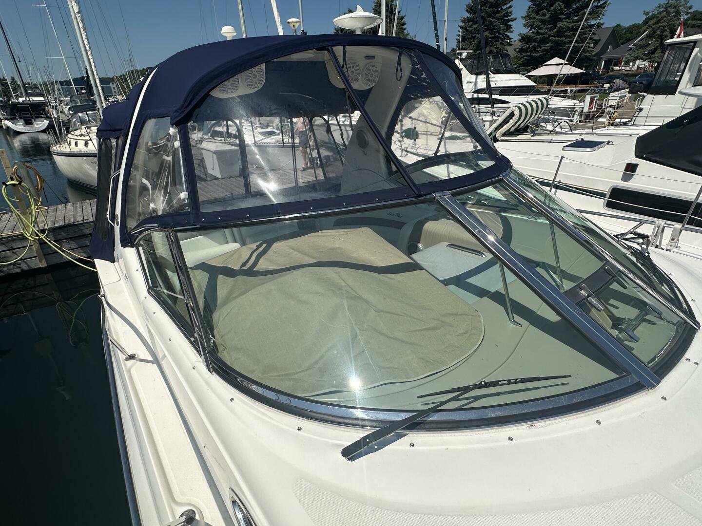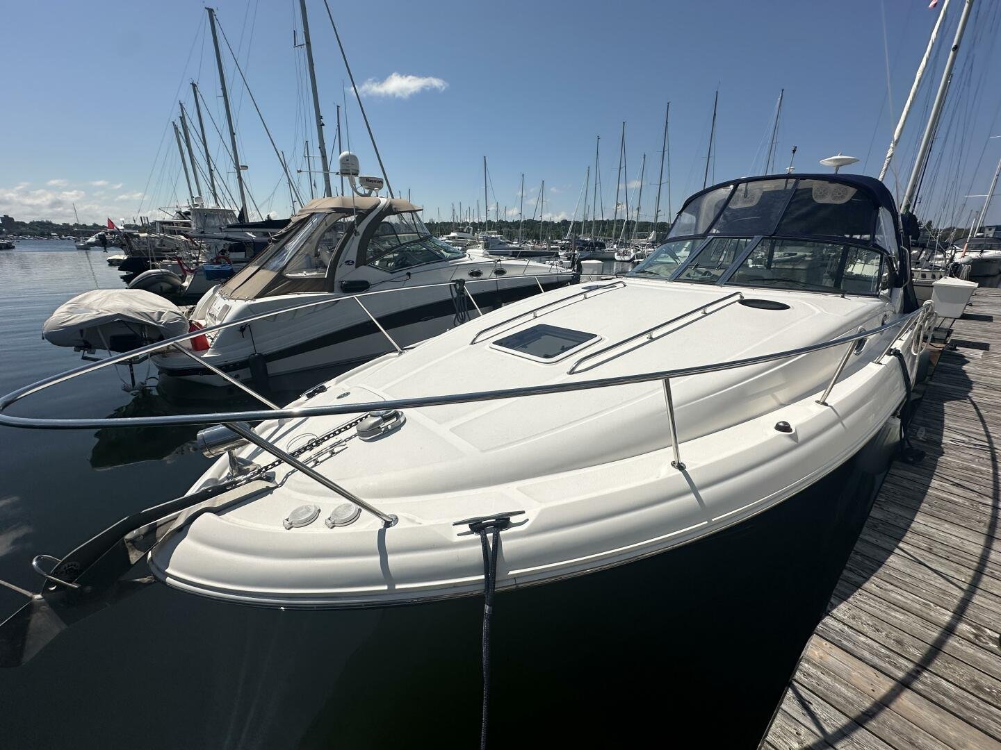 The Sea Ray 320 Sundancer was one of Sea Ray's most popular models for good reason! This example was just updated with a fresh full enclosure canvas from AMR Tops. Stepping on board, there is a new seagrass snap in carpet. There is a wet bar and 12v fridge to port, and the signature Sea Ray U-shaped seating to starboard. At the helm, you'll find the controls to the top engine package for the 320, a pair of 6.2L MAG MPI's 320HP with 850 hours of freshwater use. The electronics have been updated with a Raymarine Hybrid touch chart plotter and Raymarine VHF. You will also find the controls for the stereo system. This is no regular system, with 8x Wetsound speakers on the arch, multiple subwoofers, speakers, and tweeters throughout, as well as a Fusion controller on the transom.