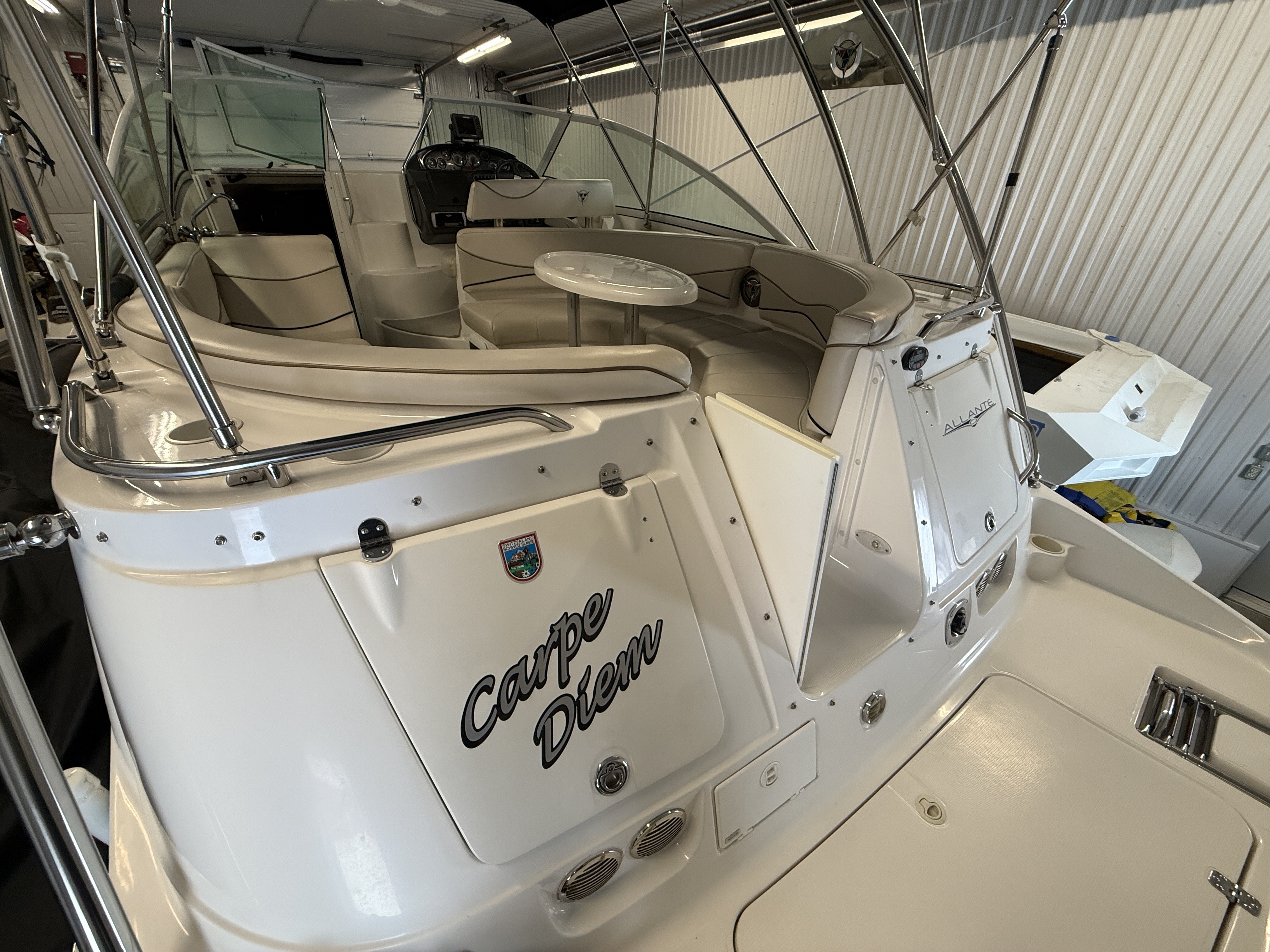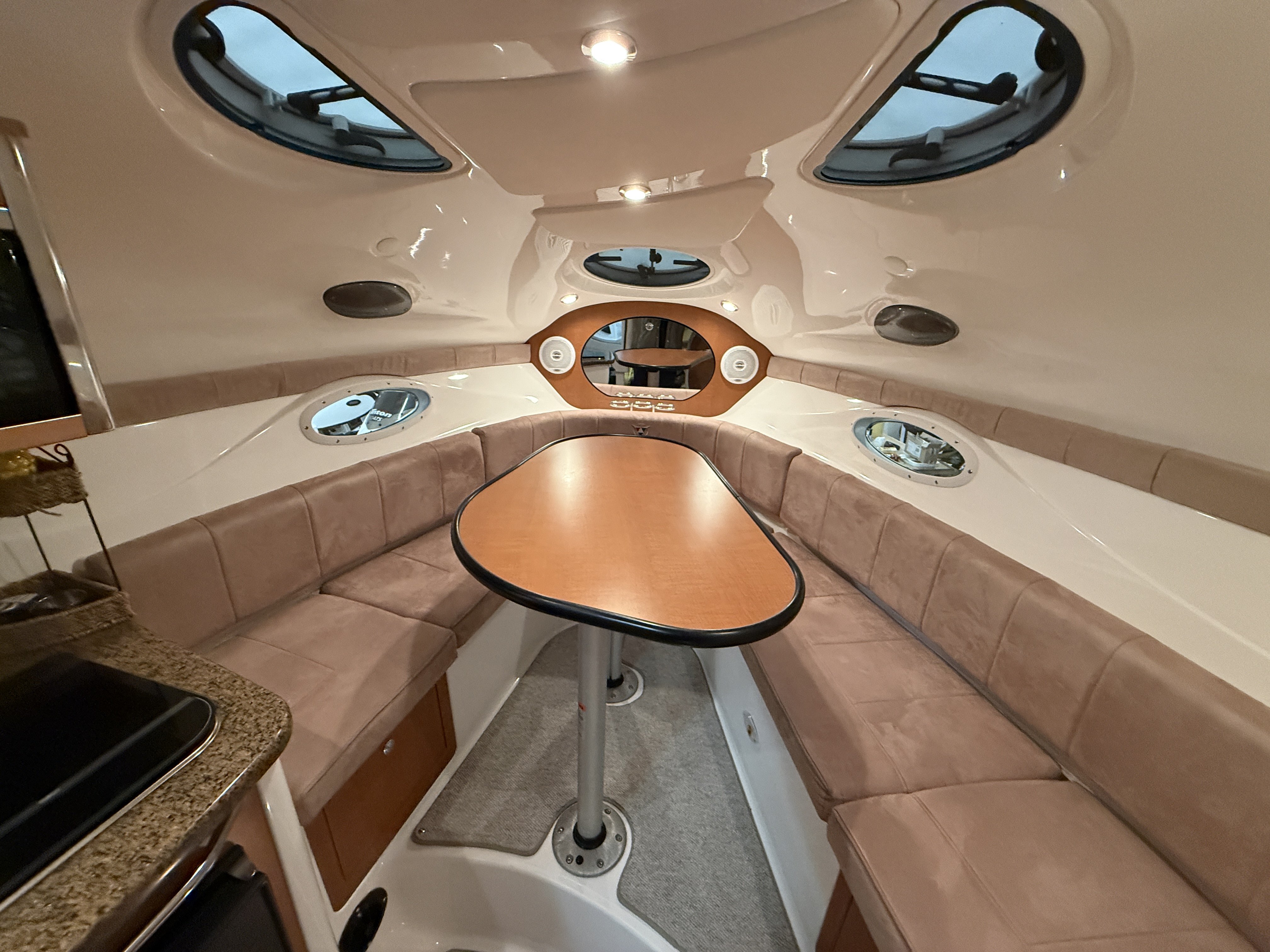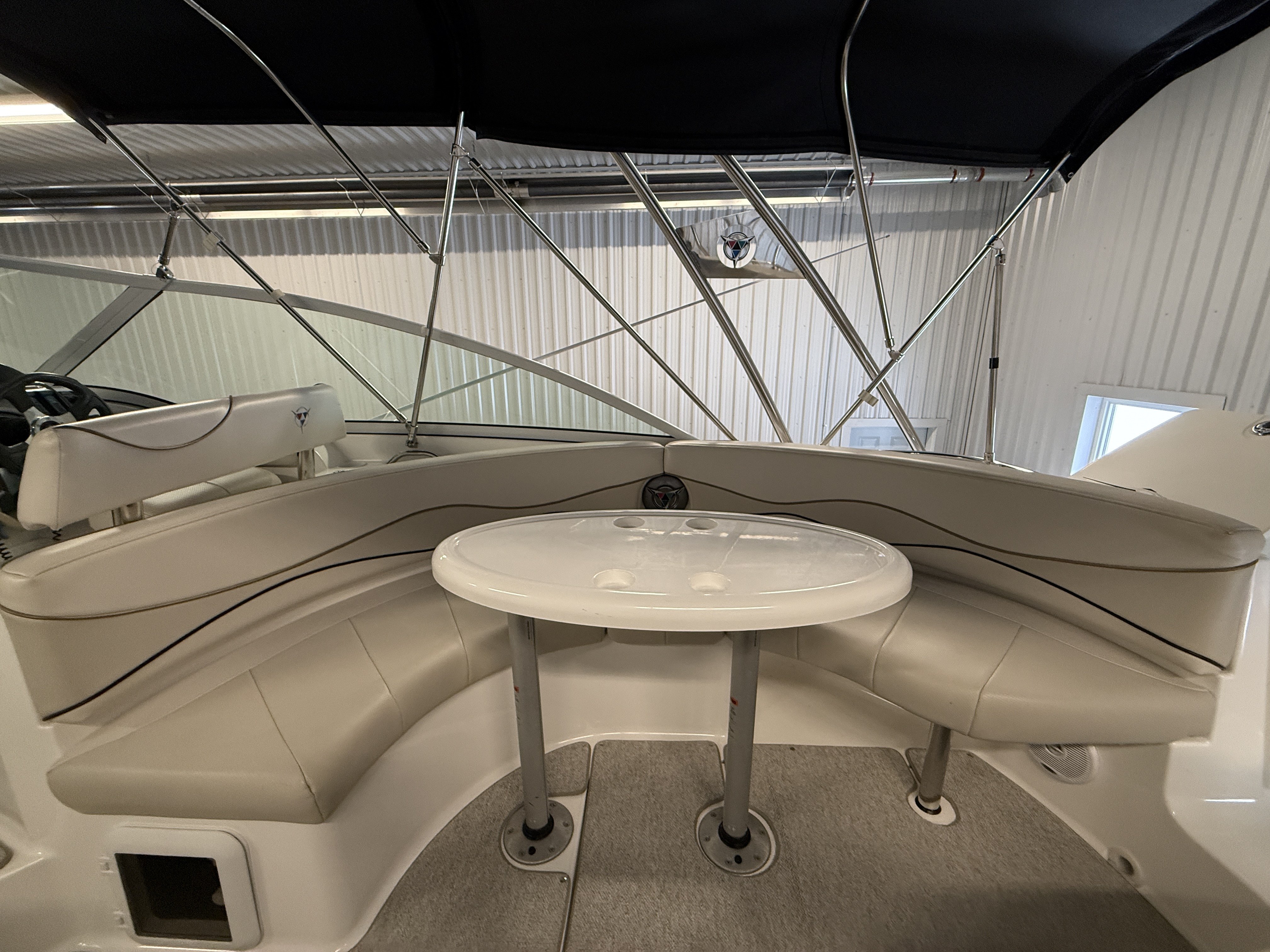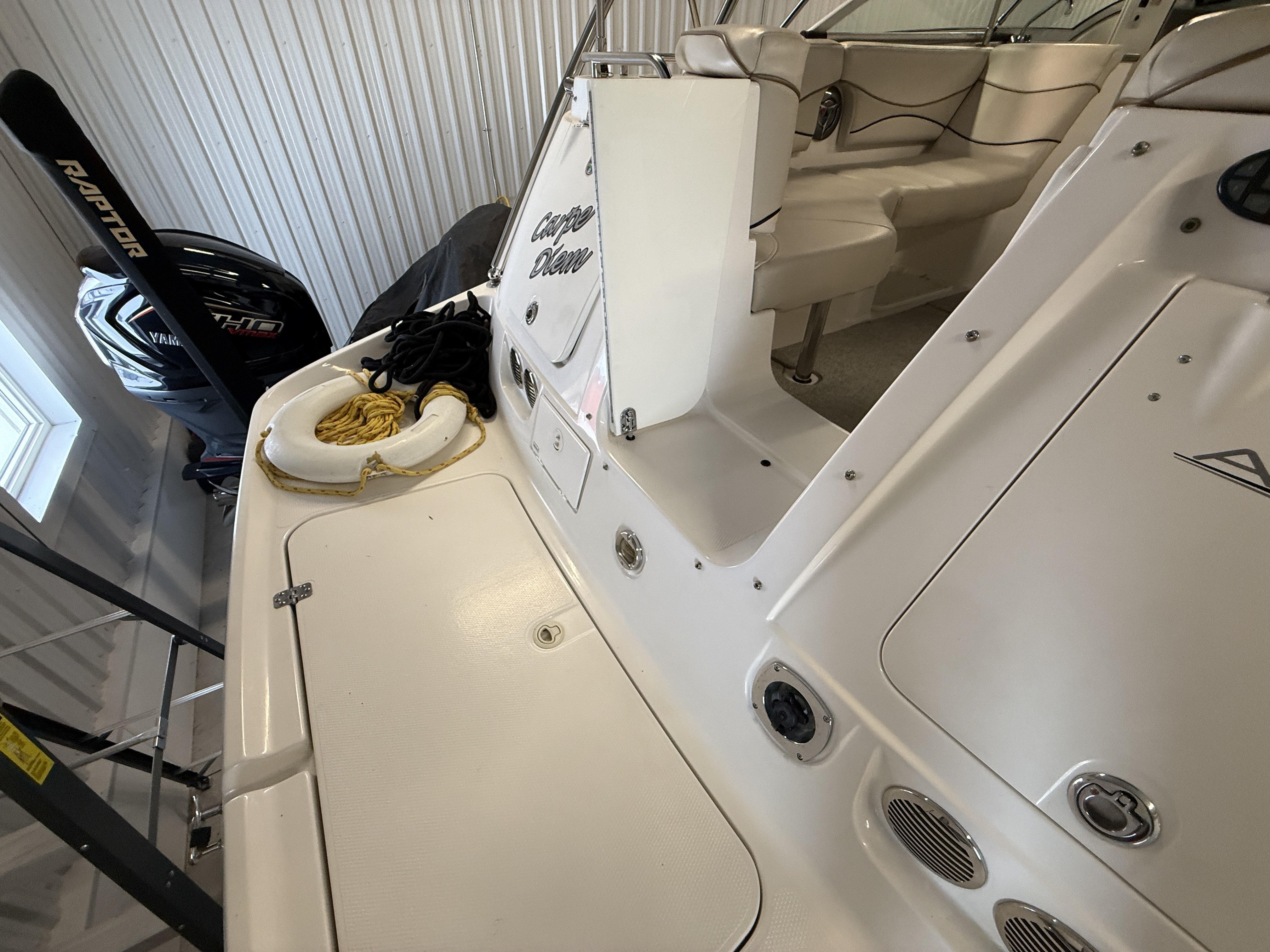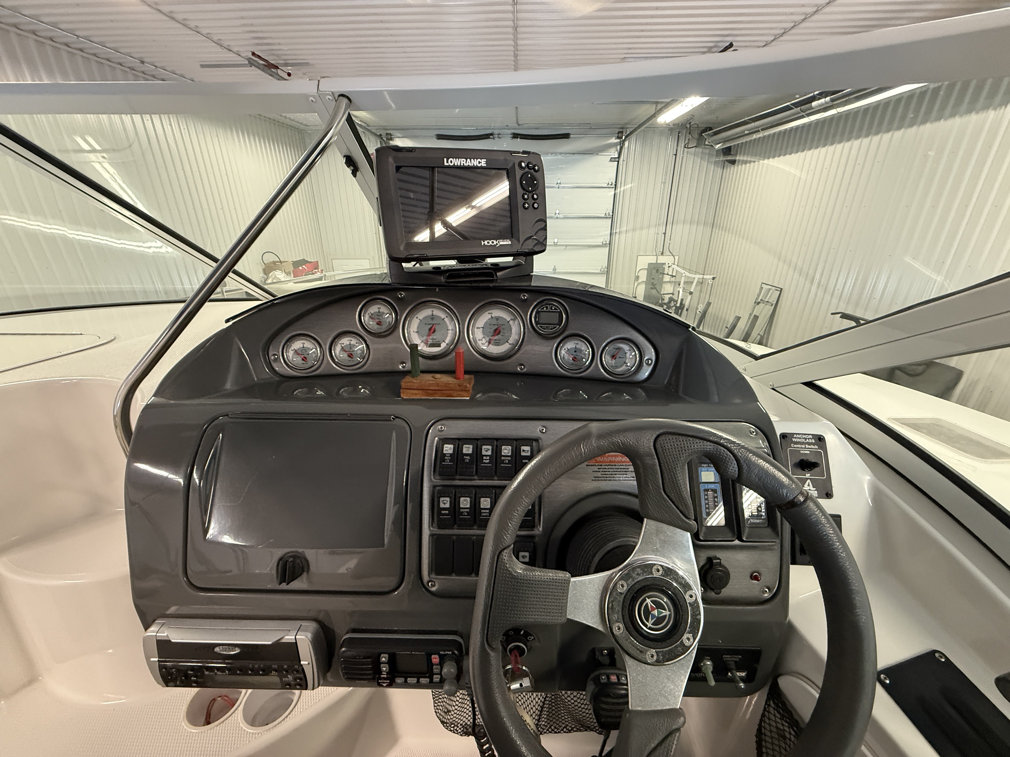 The Campion Allante 825 LX Mid-Cabin is a great combination of spaces that seem "oversized", "lighter-brighter", and much bigger than the other boat brands of similar size. The 825 was introduced in 2004 as part of Campion's 30th Anniversary of quality boat building. A beautiful blend of features and feel of a "big boat", but with the openness of the large cockpit will make you feel you are in a "sport boat". The cockpit has a large social area with seating for 8. Two of the aft seats can be removed to provide a wider open space when you want more room - possibly for fishing. Walk-thru windshield provides safe access to the bow. An additional refrigerator near the wet bar makes entertaining easy.