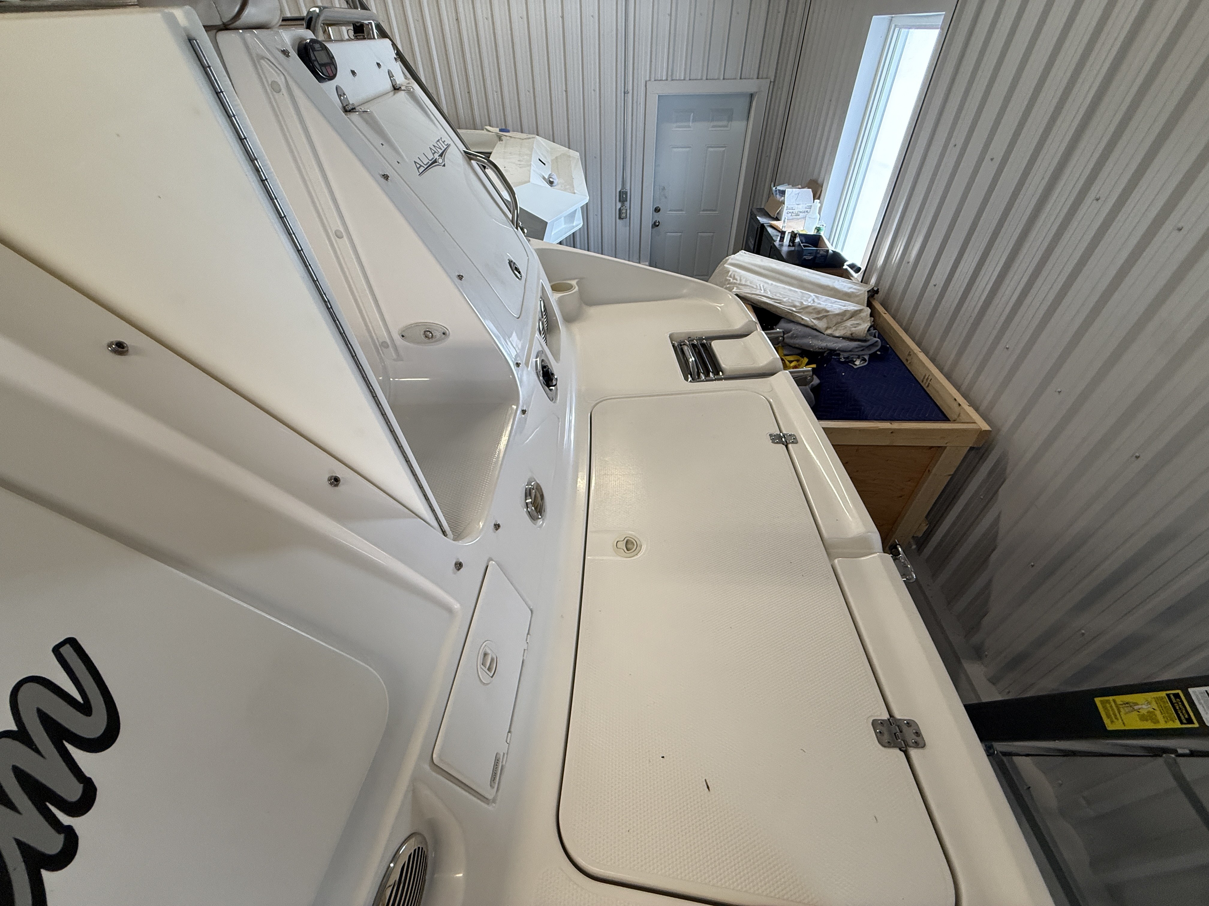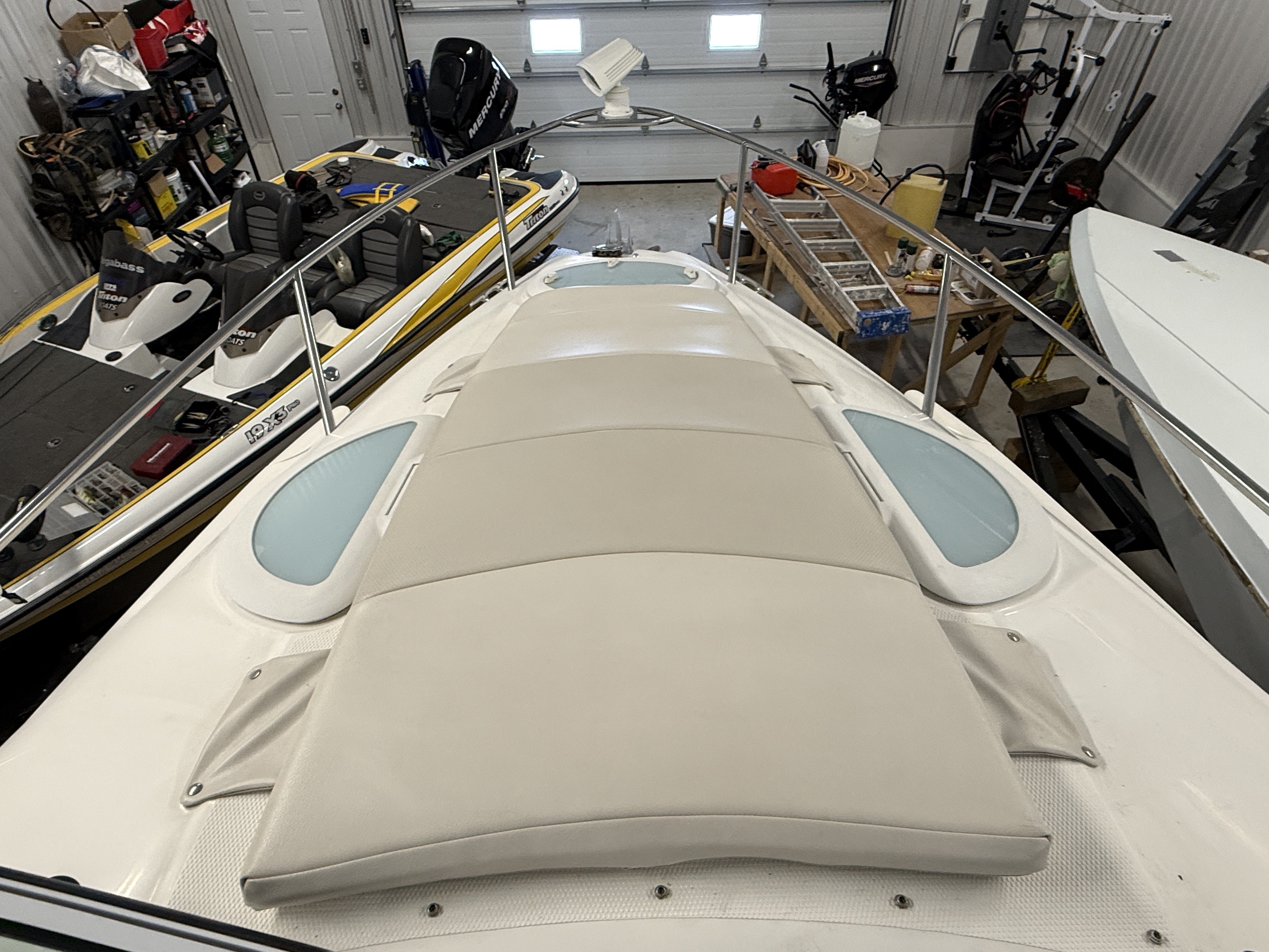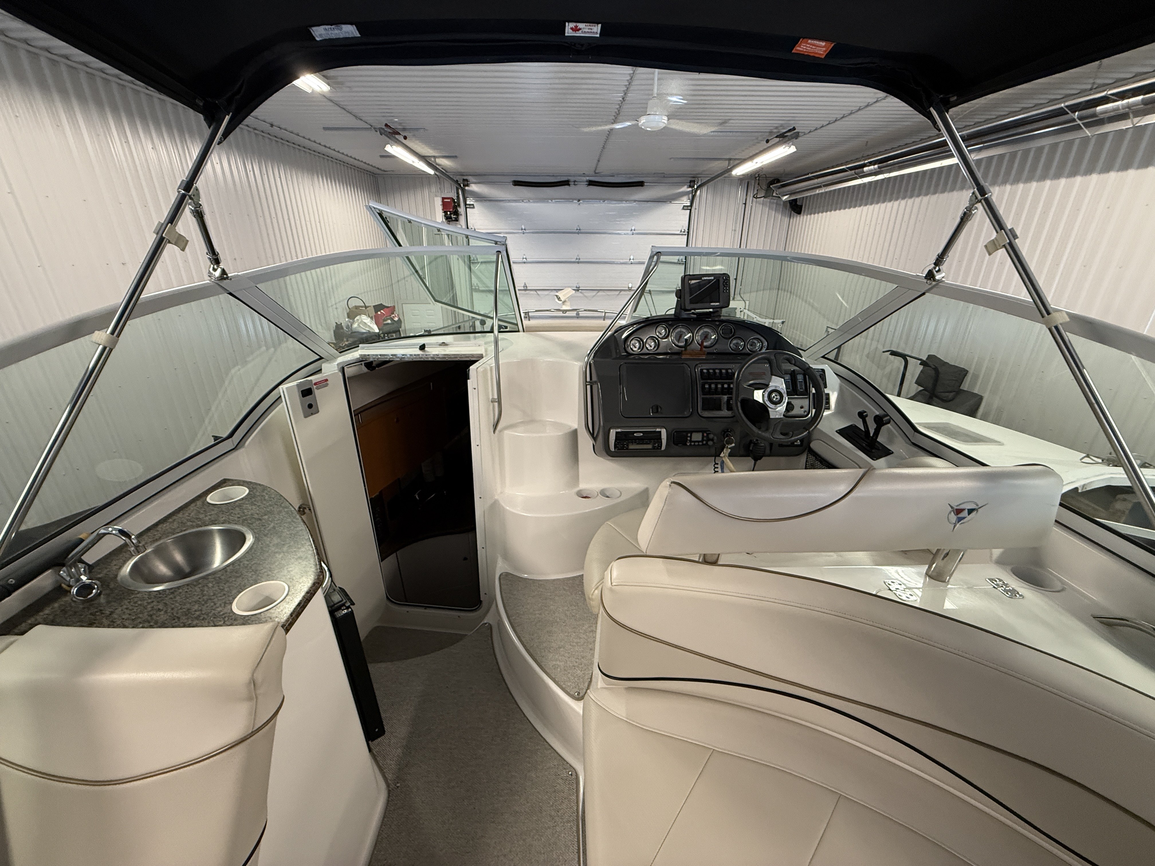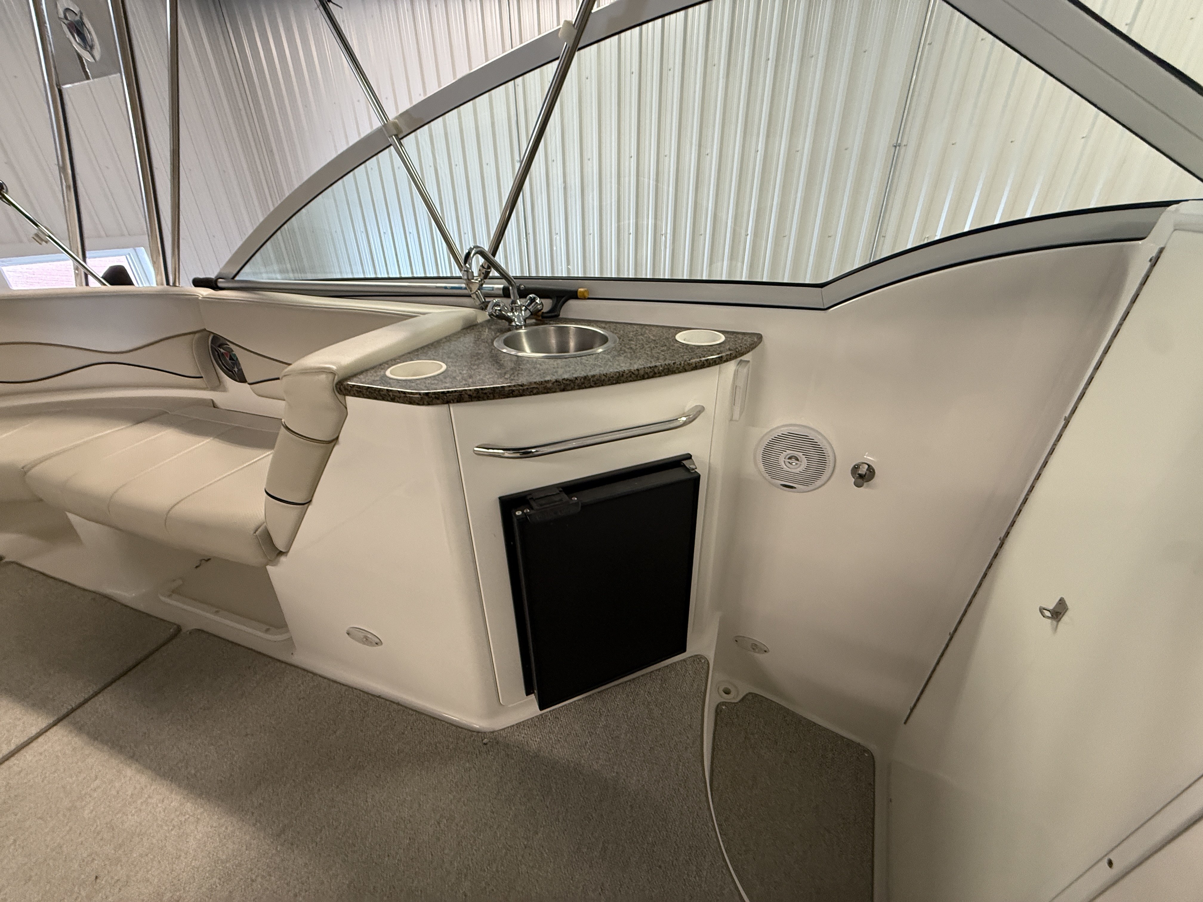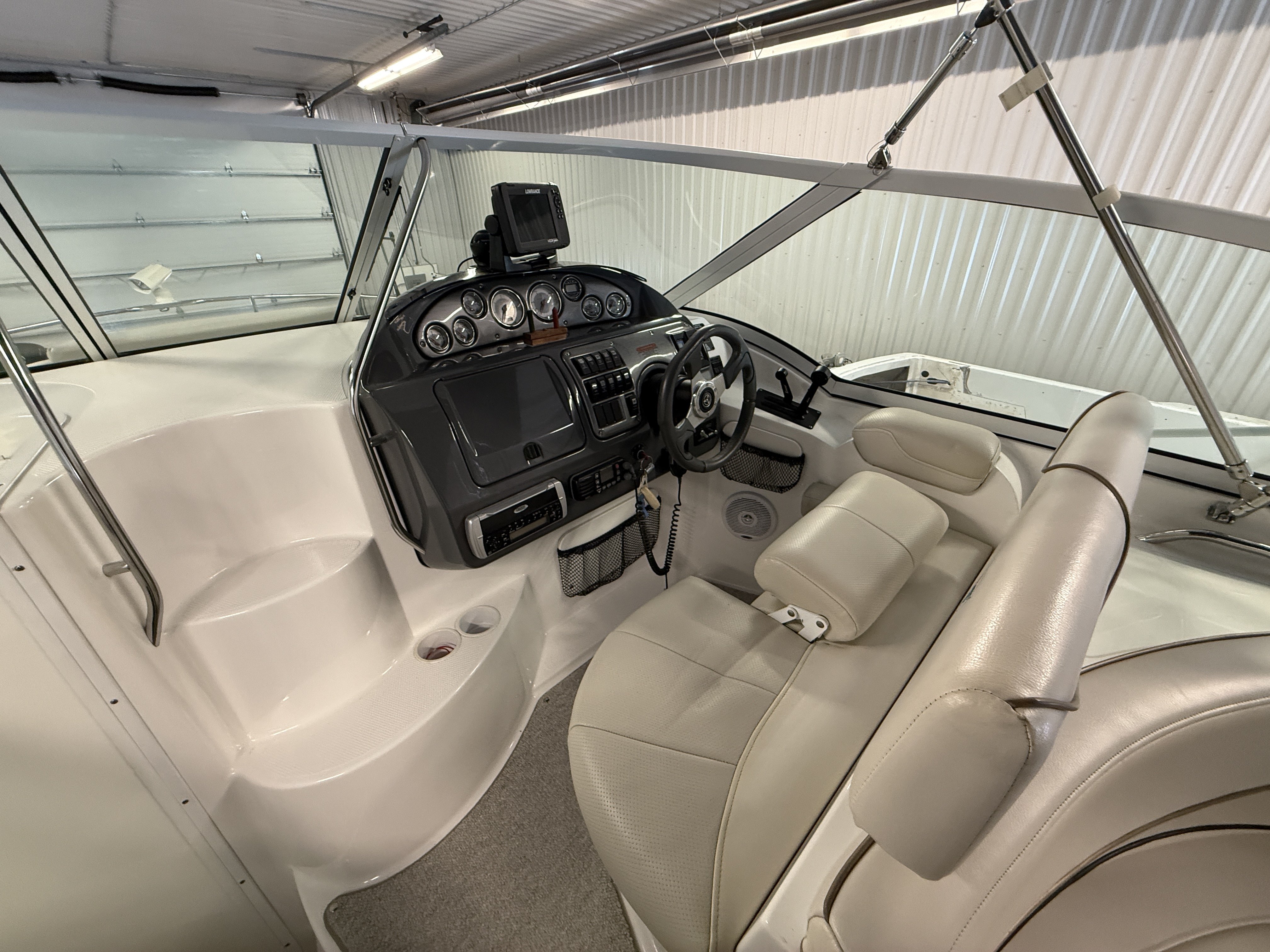 The Campion Allante 825 LX Mid-Cabin is a great combination of spaces that seem "oversized", "lighter-brighter", and much bigger than the other boat brands of similar size. The 825 was introduced in 2004 as part of Campion's 30th Anniversary of quality boat building. A beautiful blend of features and feel of a "big boat", but with the openness of the large cockpit will make you feel you are in a "sport boat". The cockpit has a large social area with seating for 8. Two of the aft seats can be removed to provide a wider open space when you want more room - possibly for fishing. Walk-thru windshield provides safe access to the bow. An additional refrigerator near the wet bar makes entertaining easy.