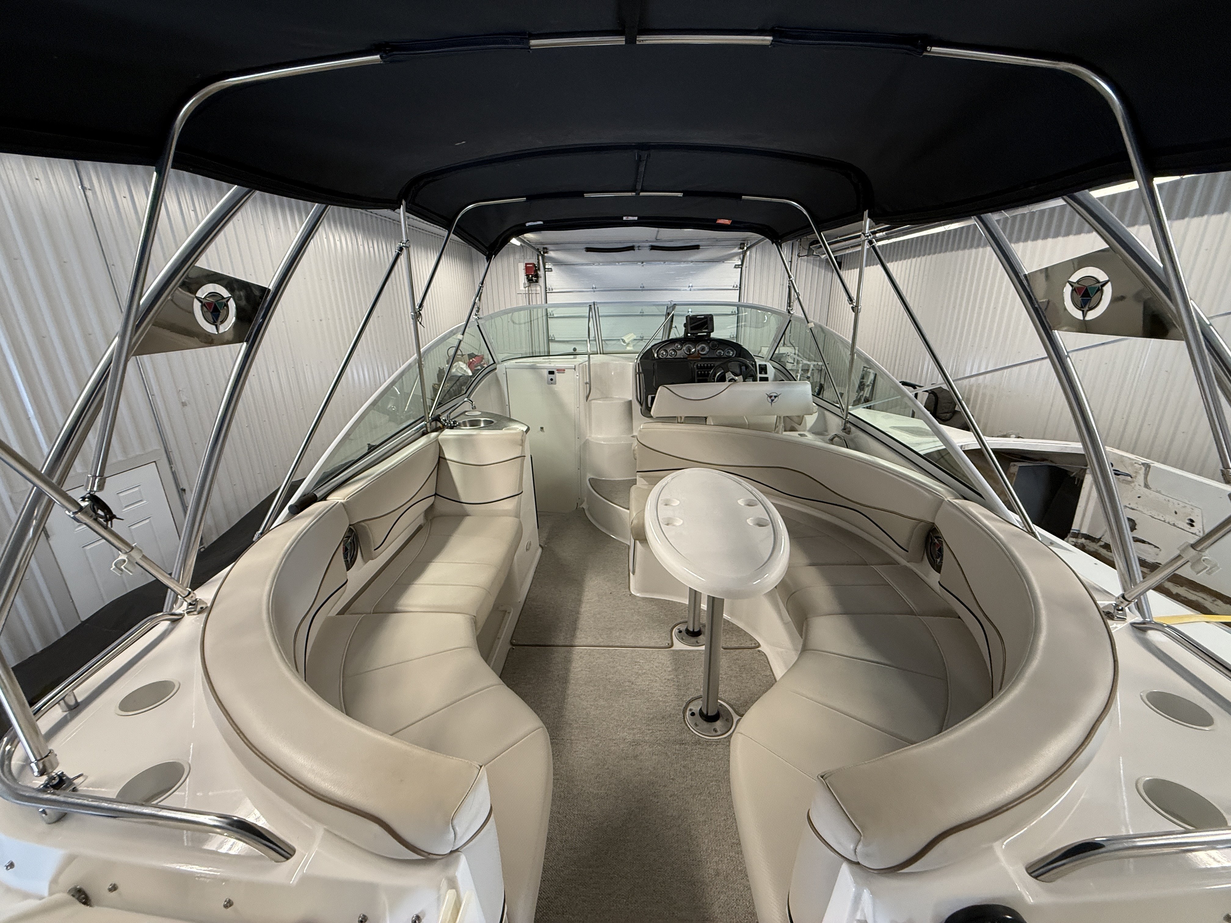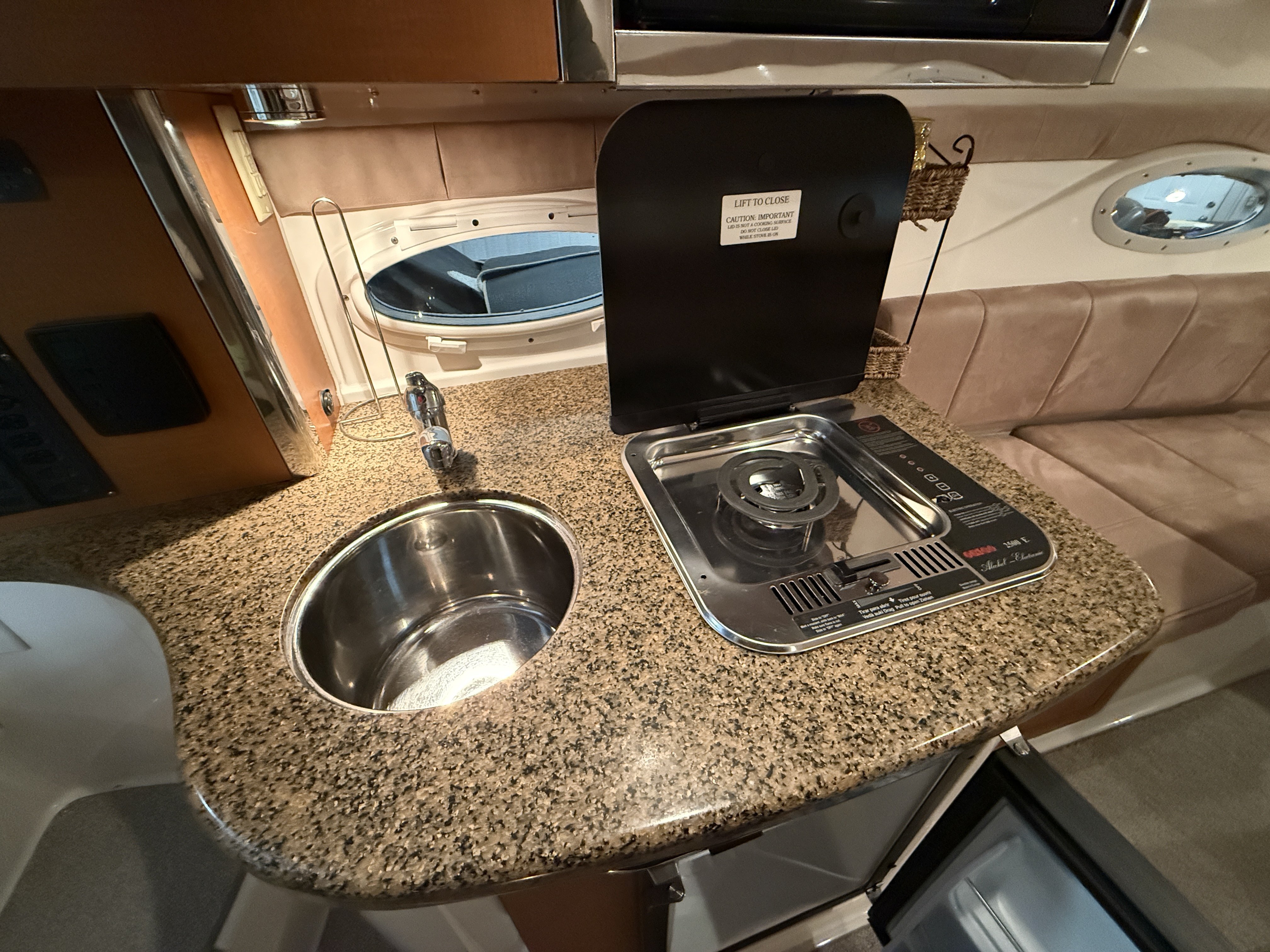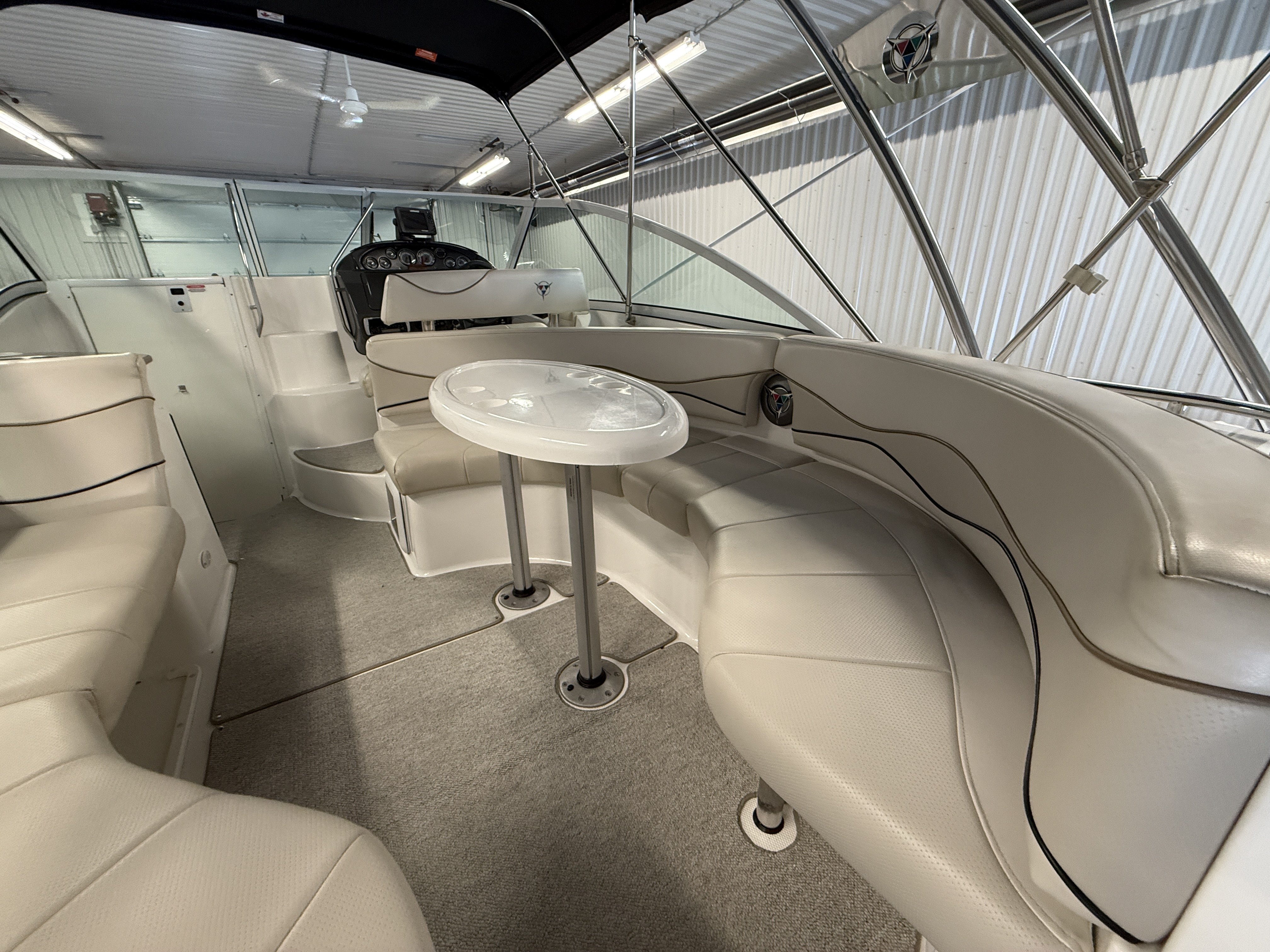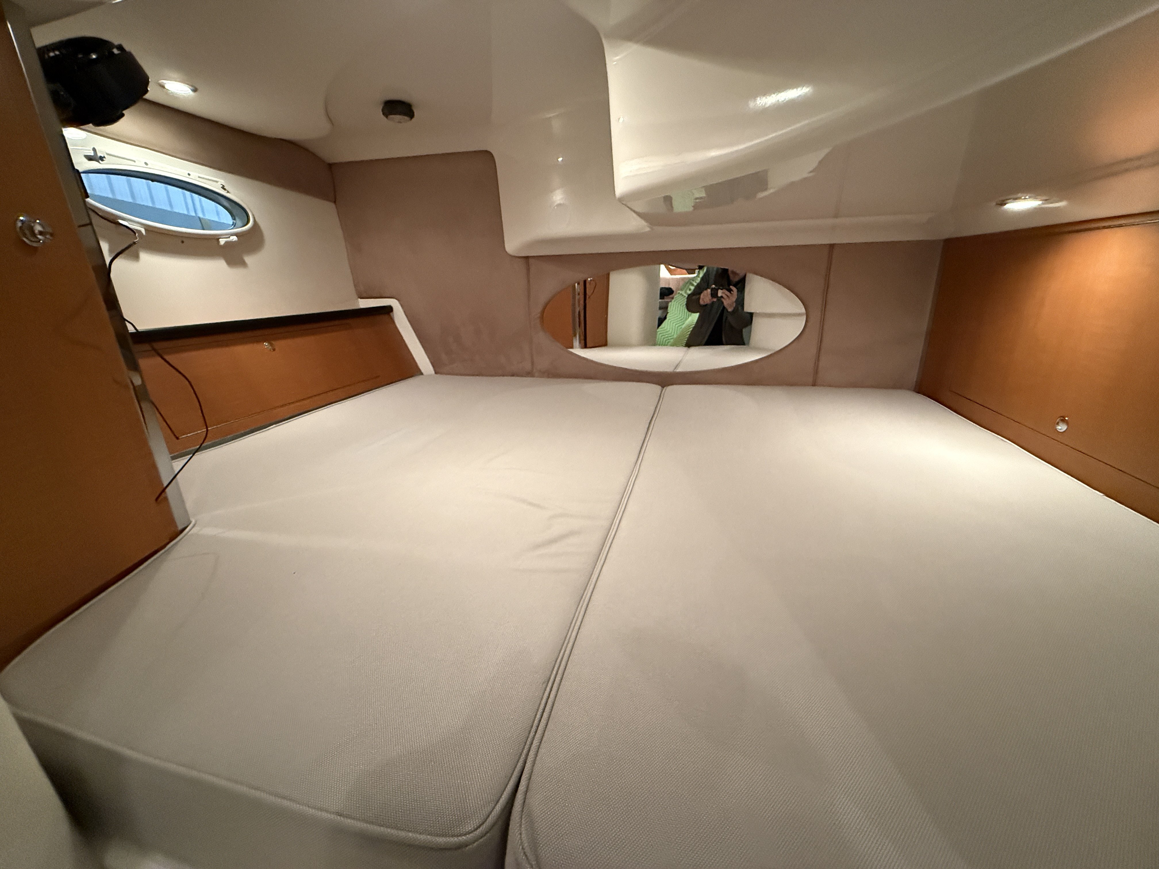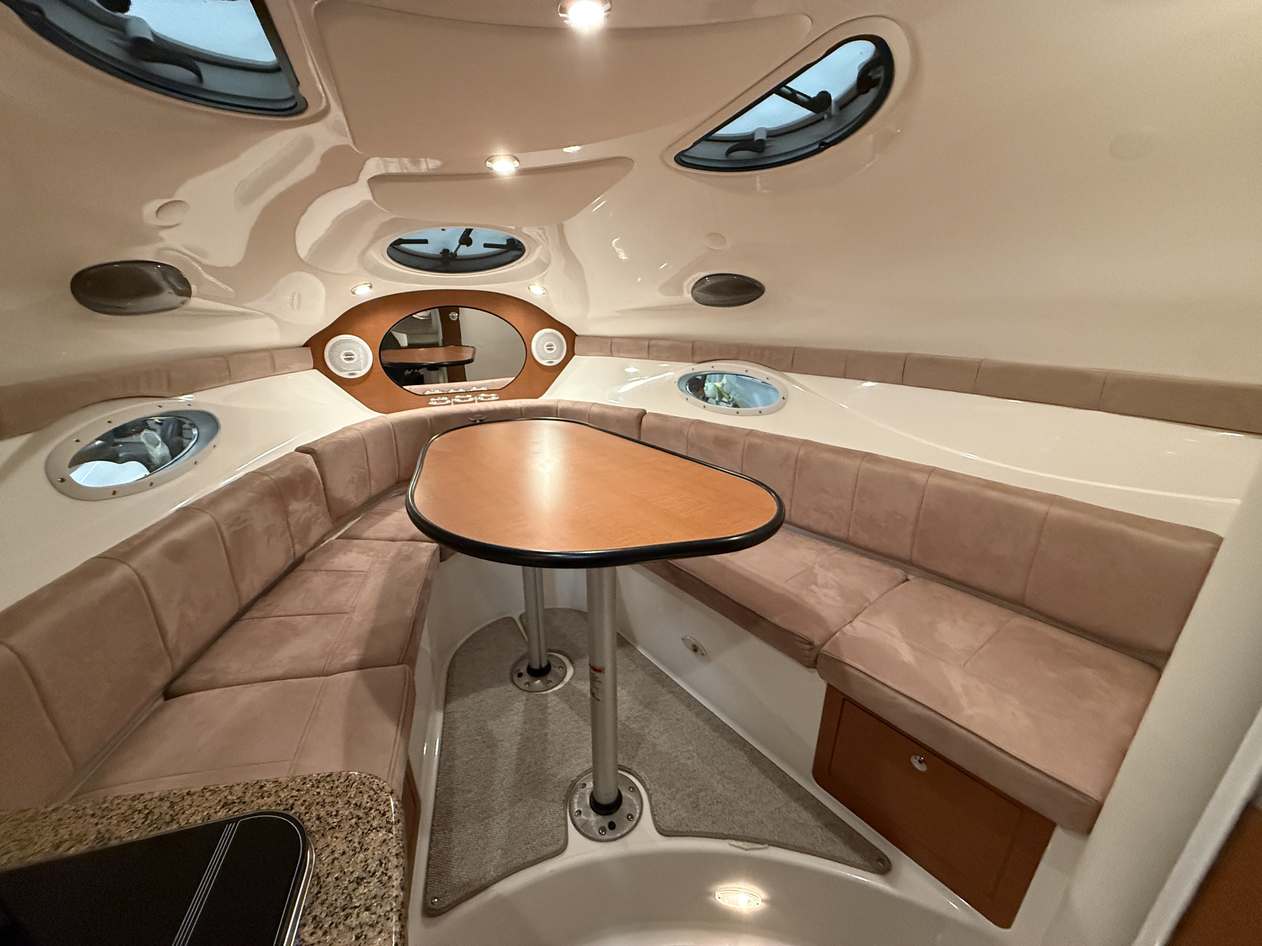 The Campion Allante 825 LX Mid-Cabin is a great combination of spaces that seem "oversized", "lighter-brighter", and much bigger than the other boat brands of similar size. The 825 was introduced in 2004 as part of Campion's 30th Anniversary of quality boat building. A beautiful blend of features and feel of a "big boat", but with the openness of the large cockpit will make you feel you are in a "sport boat". The cockpit has a large social area with seating for 8. Two of the aft seats can be removed to provide a wider open space when you want more room - possibly for fishing. Walk-thru windshield provides safe access to the bow. An additional refrigerator near the wet bar makes entertaining easy.