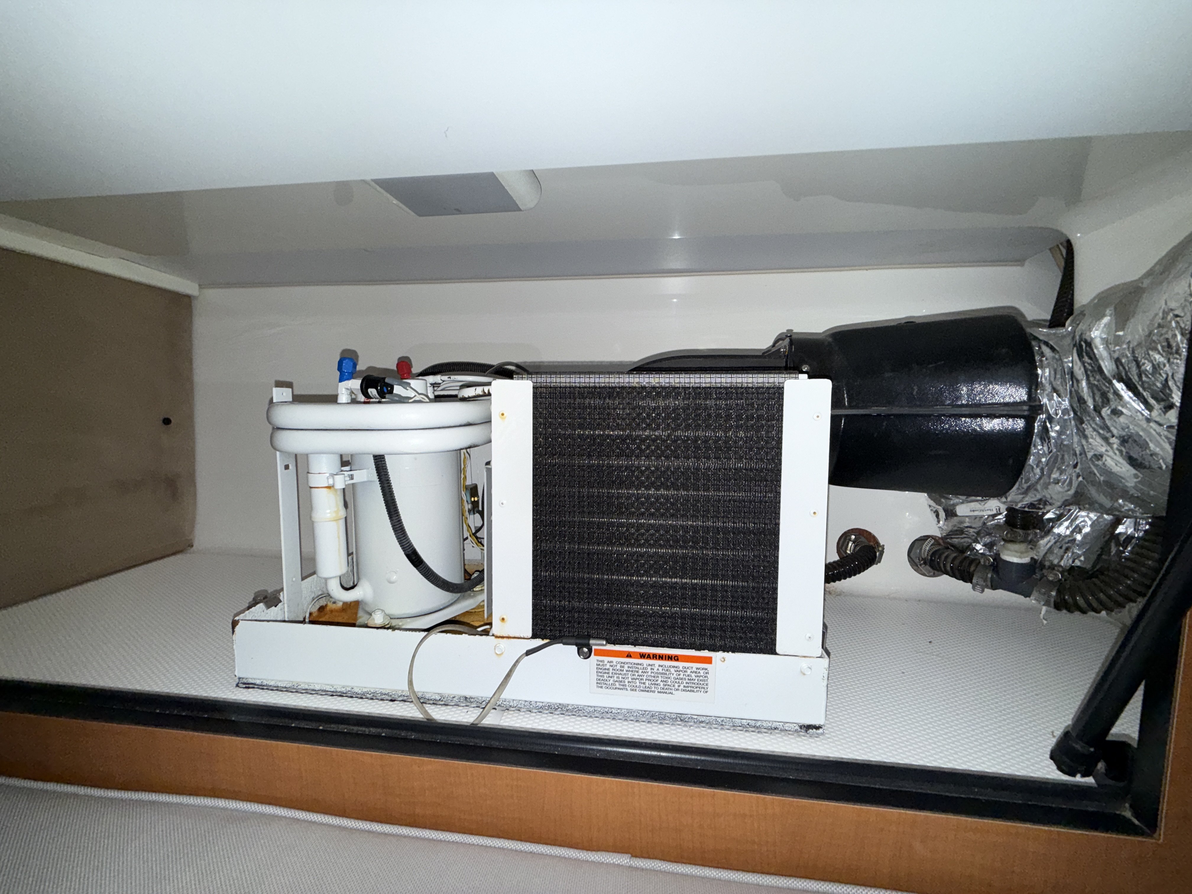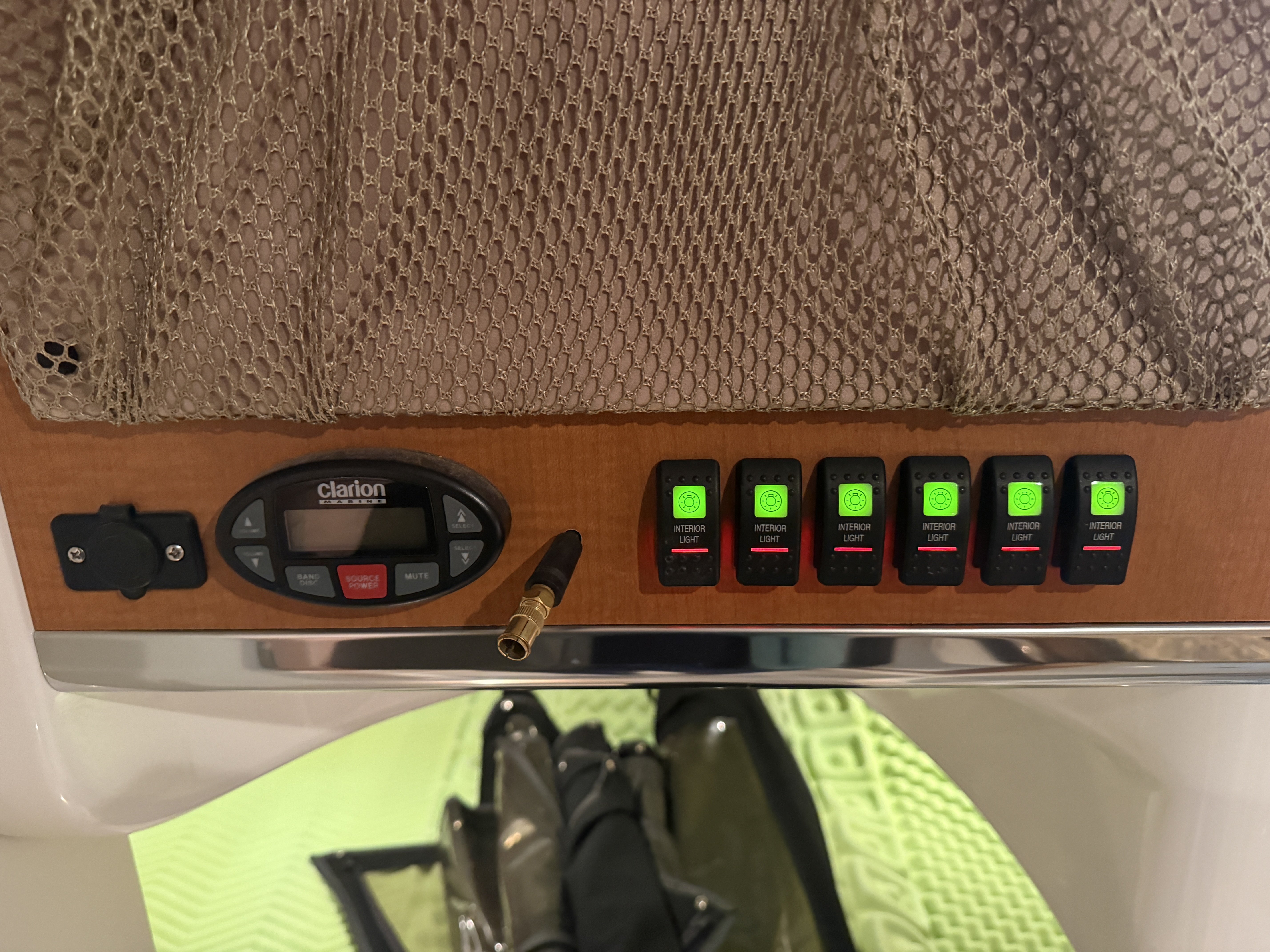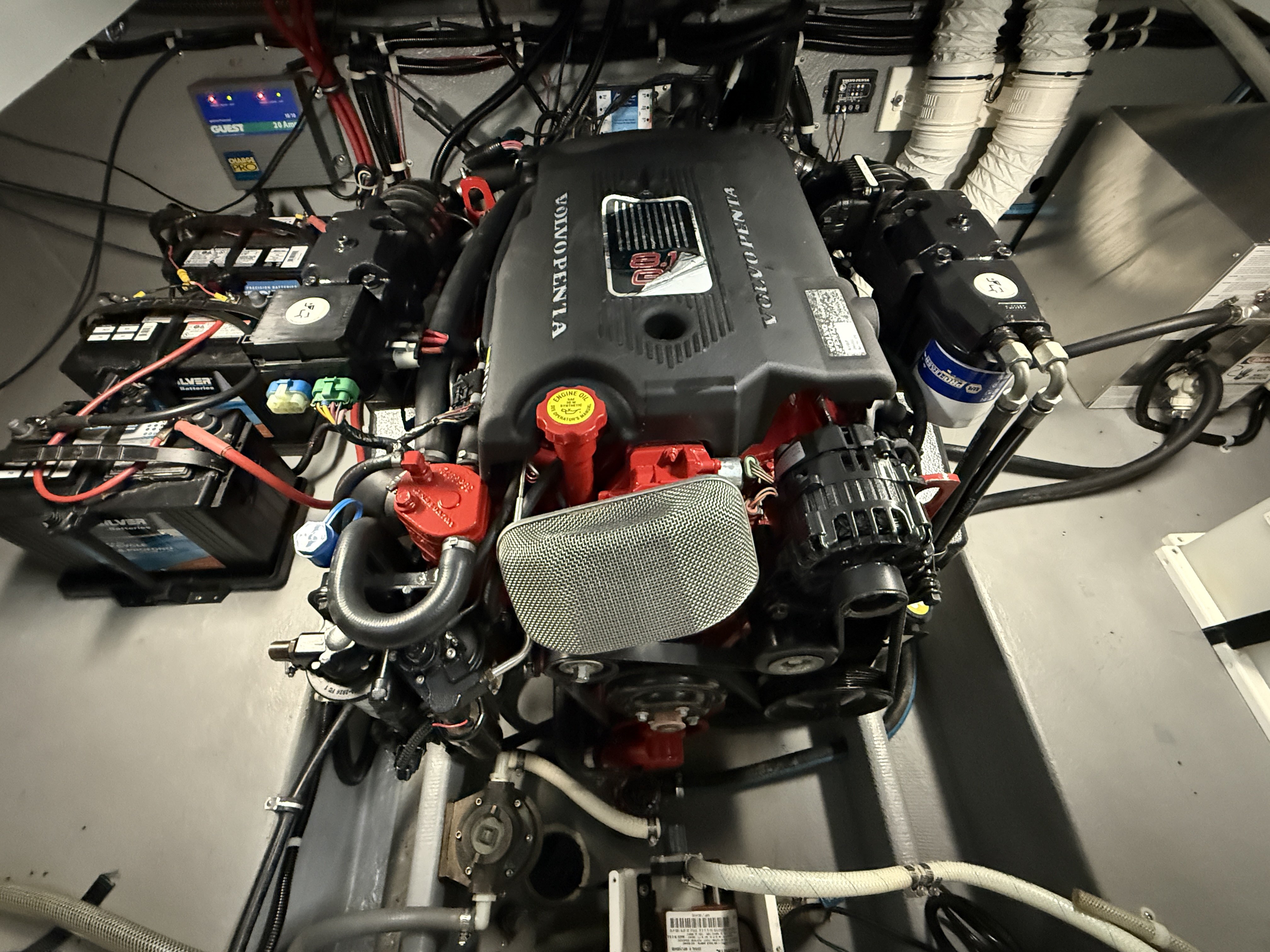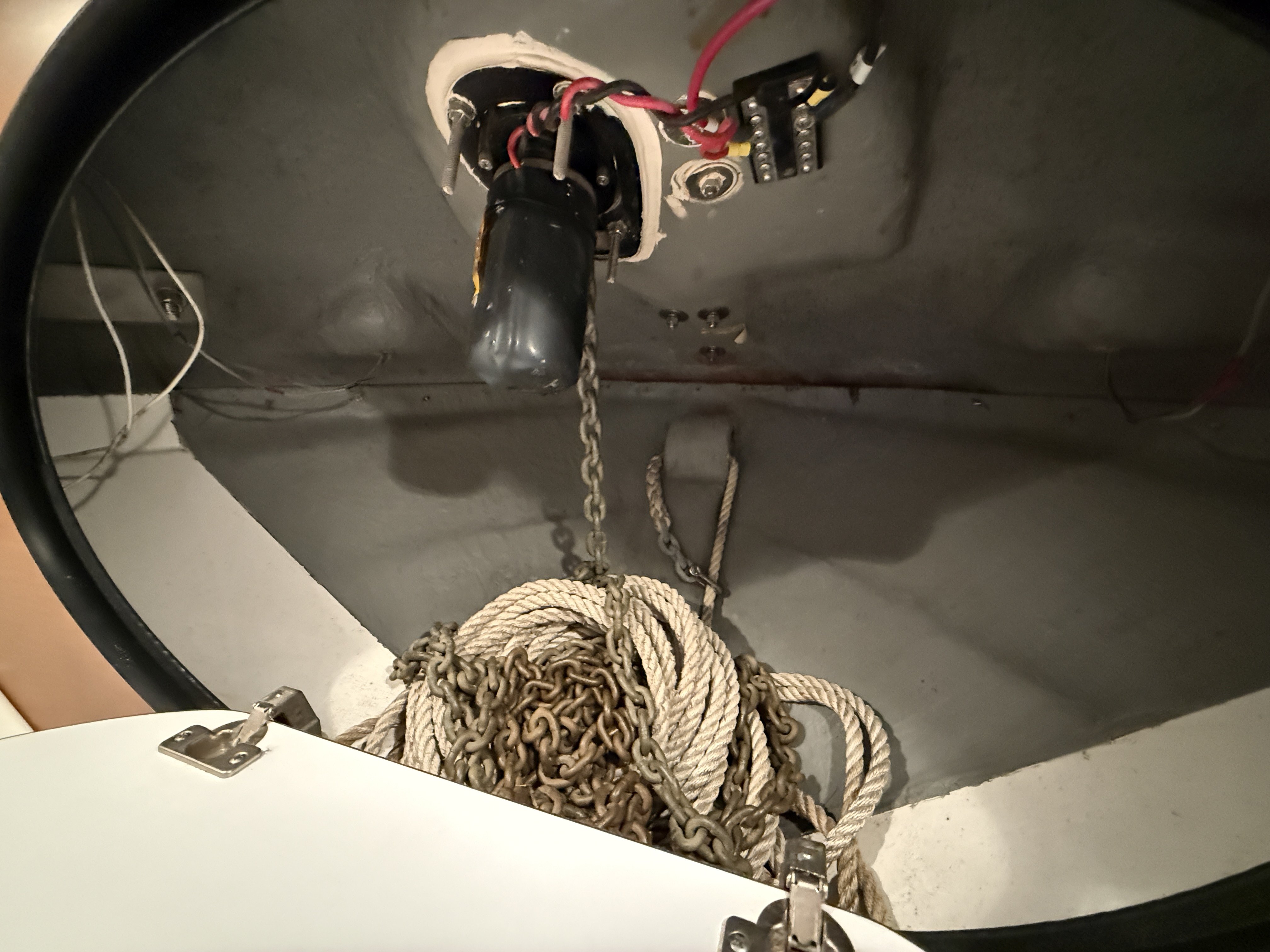 The cabin is large and bright with 6' 4" headroom. Big open double mid-cabin berth, full galley, refrigeration, head with shower. The most striking is all the large deck hatches that allow "lots of light" so it's very open and airy.
