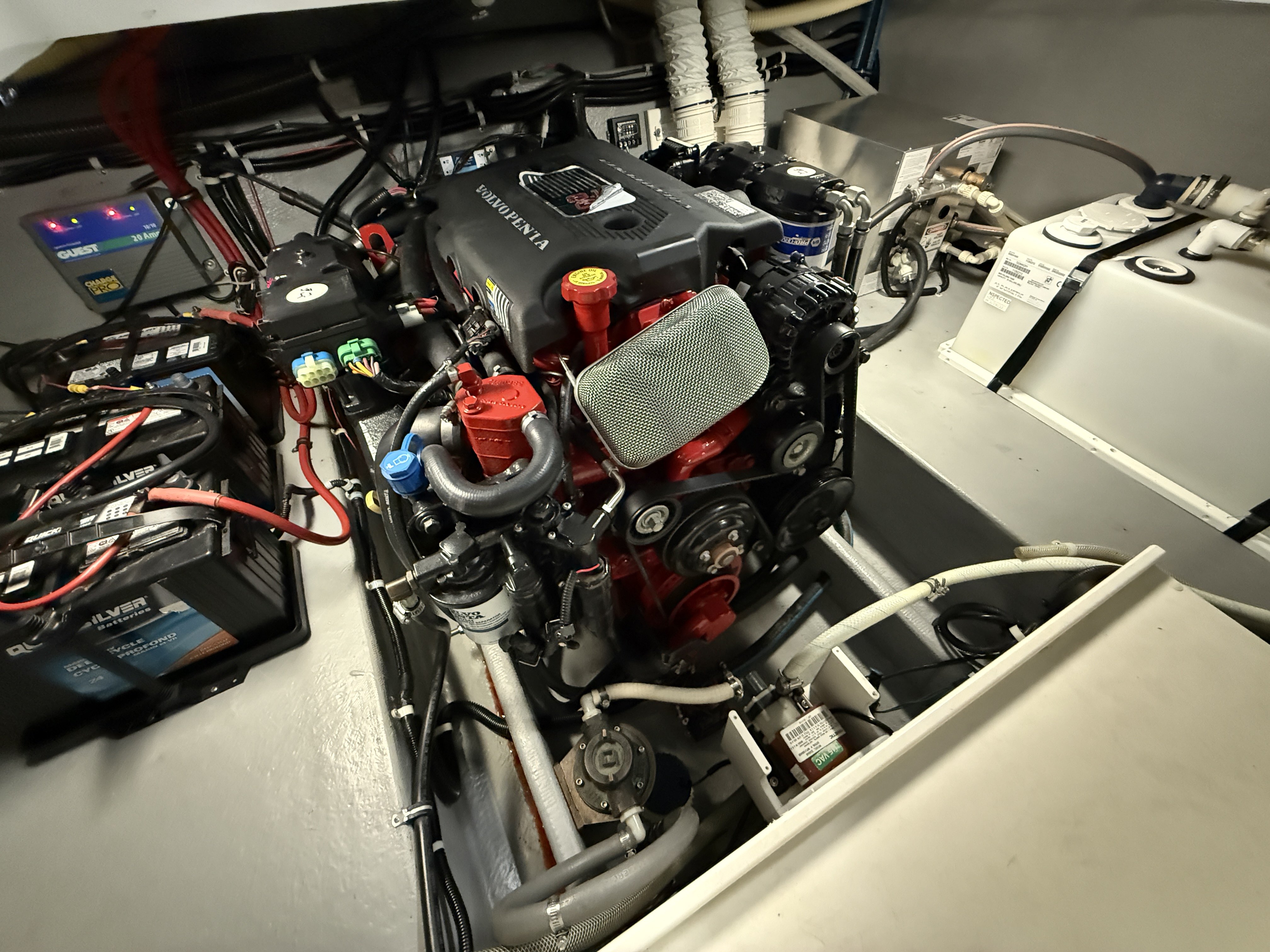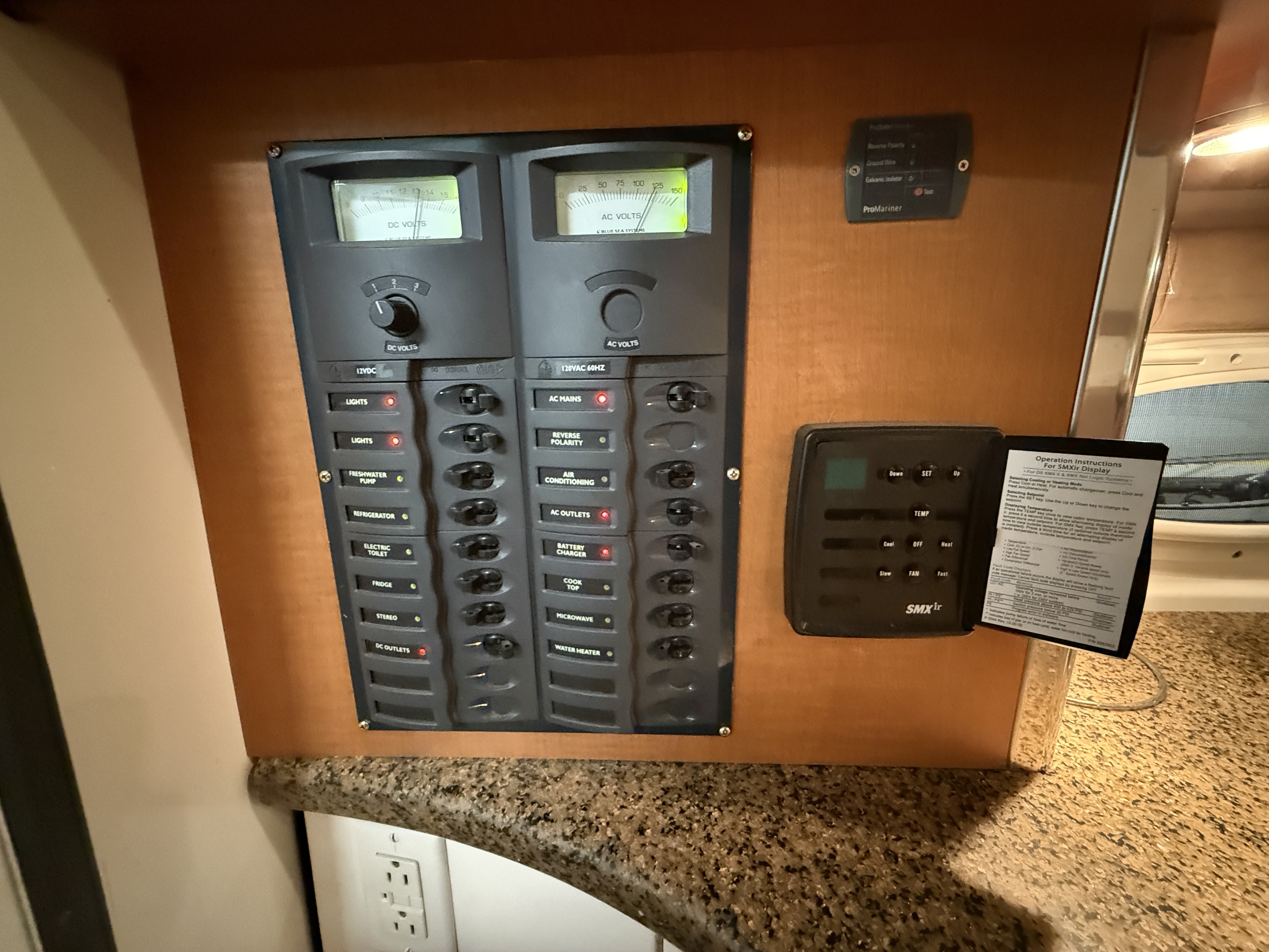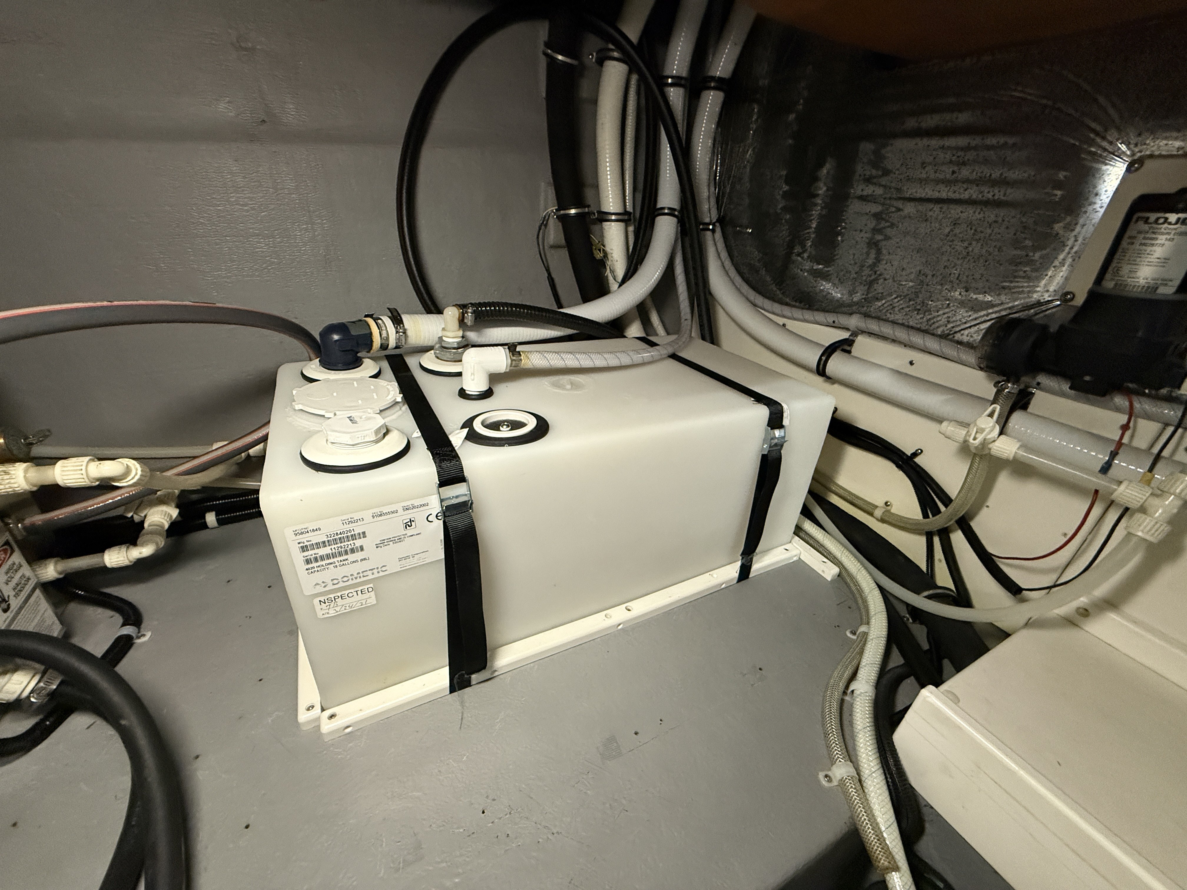 The cabin is large and bright with 6' 4" headroom. Big open double mid-cabin berth, full galley, refrigeration, head with shower. The most striking is all the large deck hatches that allow "lots of light" so it's very open and airy.