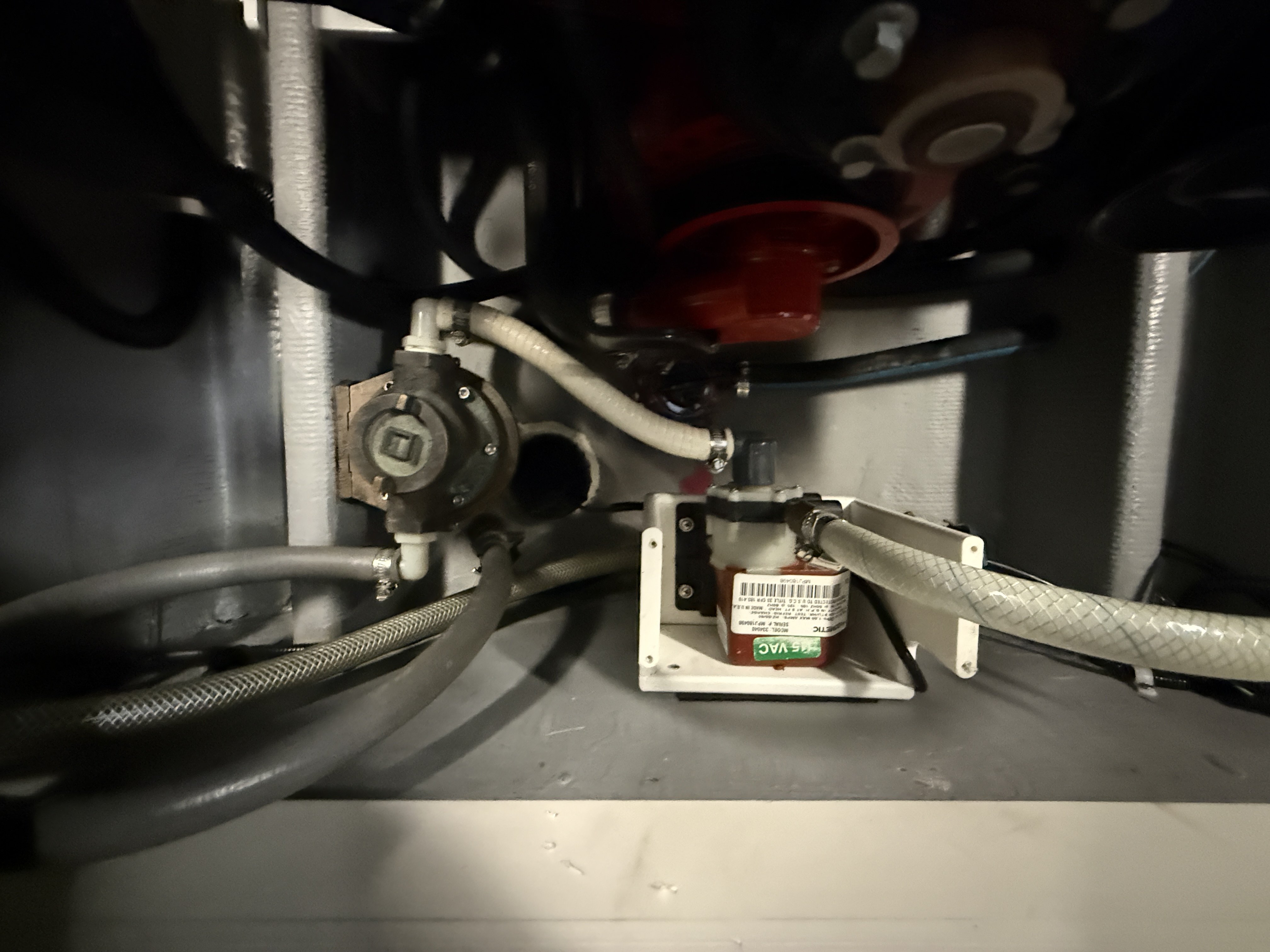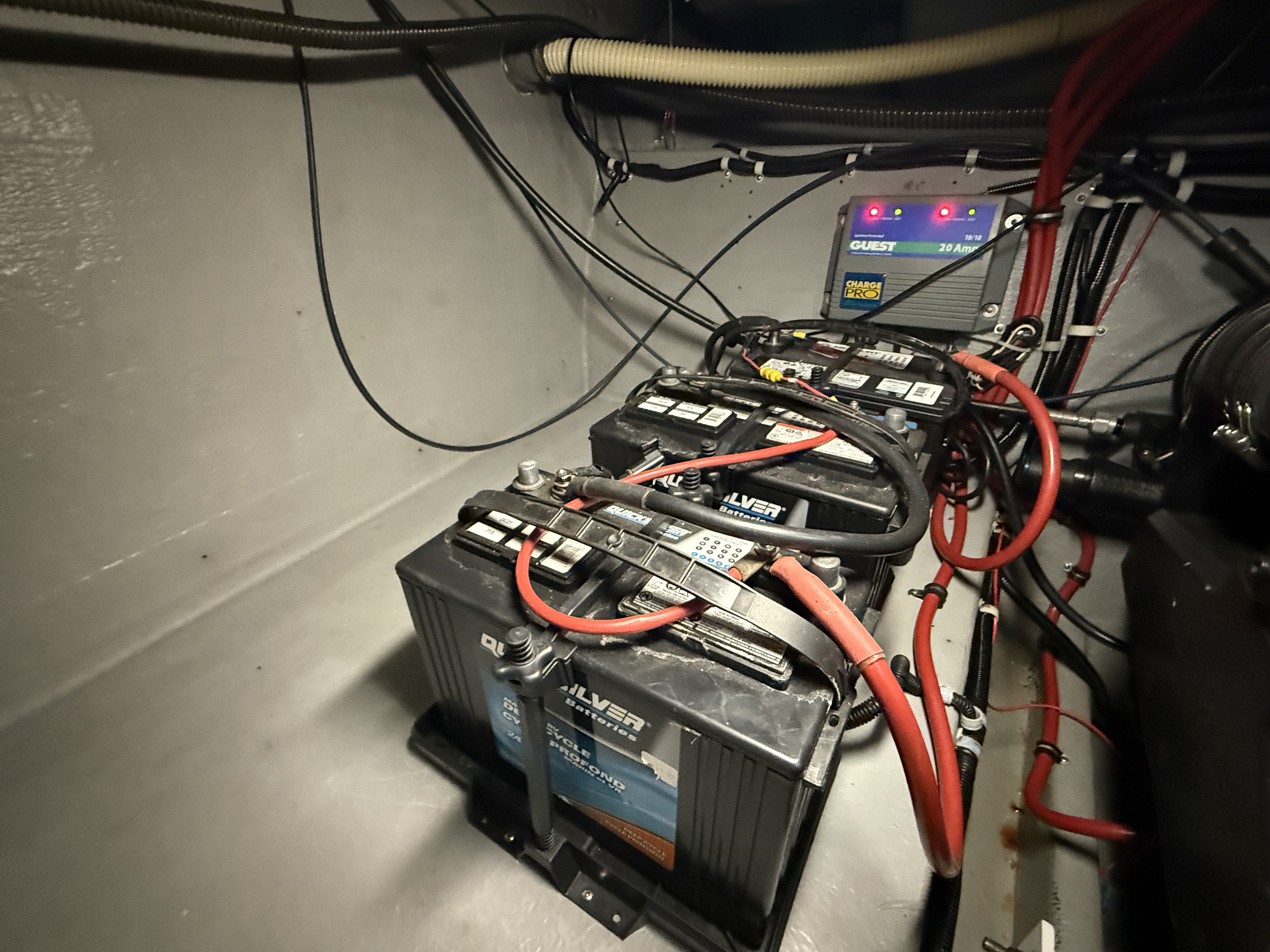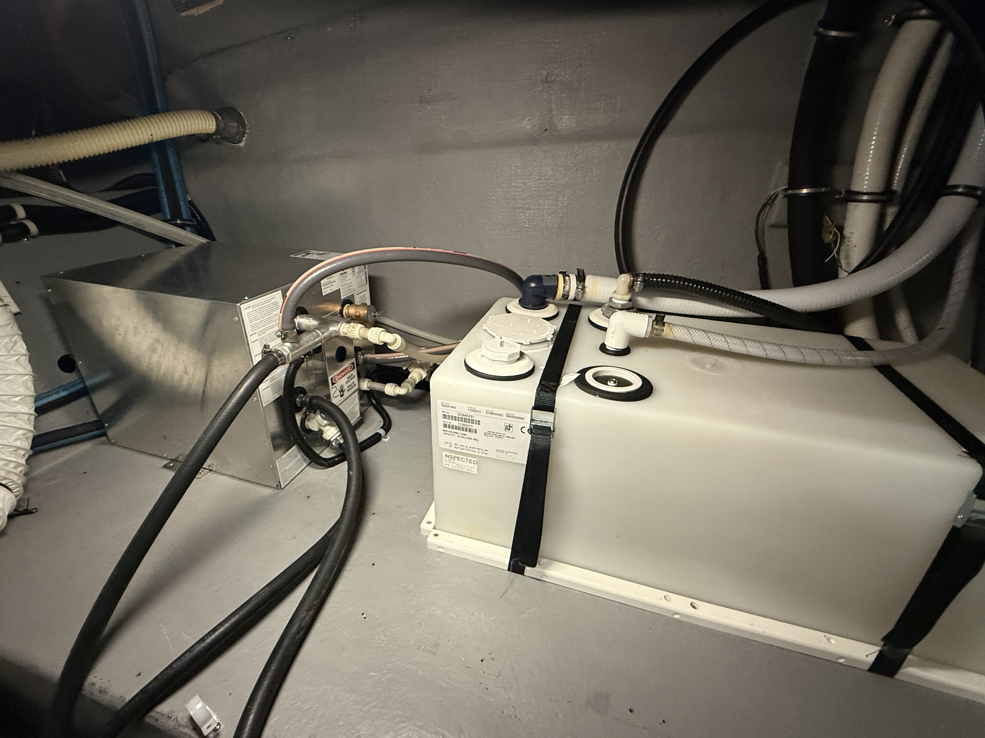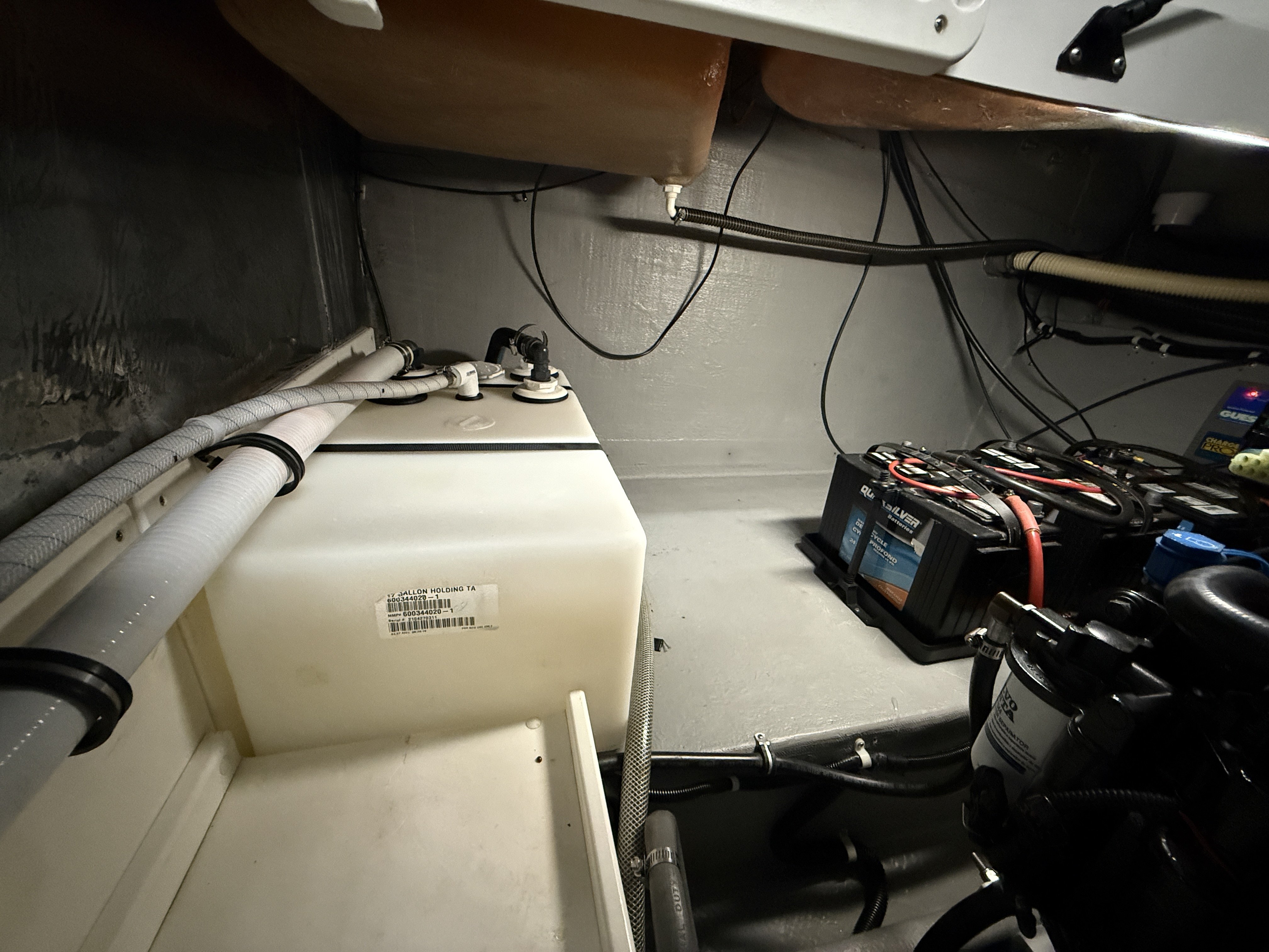 The cabin is large and bright with 6' 4" headroom. Big open double mid-cabin berth, full galley, refrigeration, head with shower. The most striking is all the large deck hatches that allow "lots of light" so it's very open and airy.