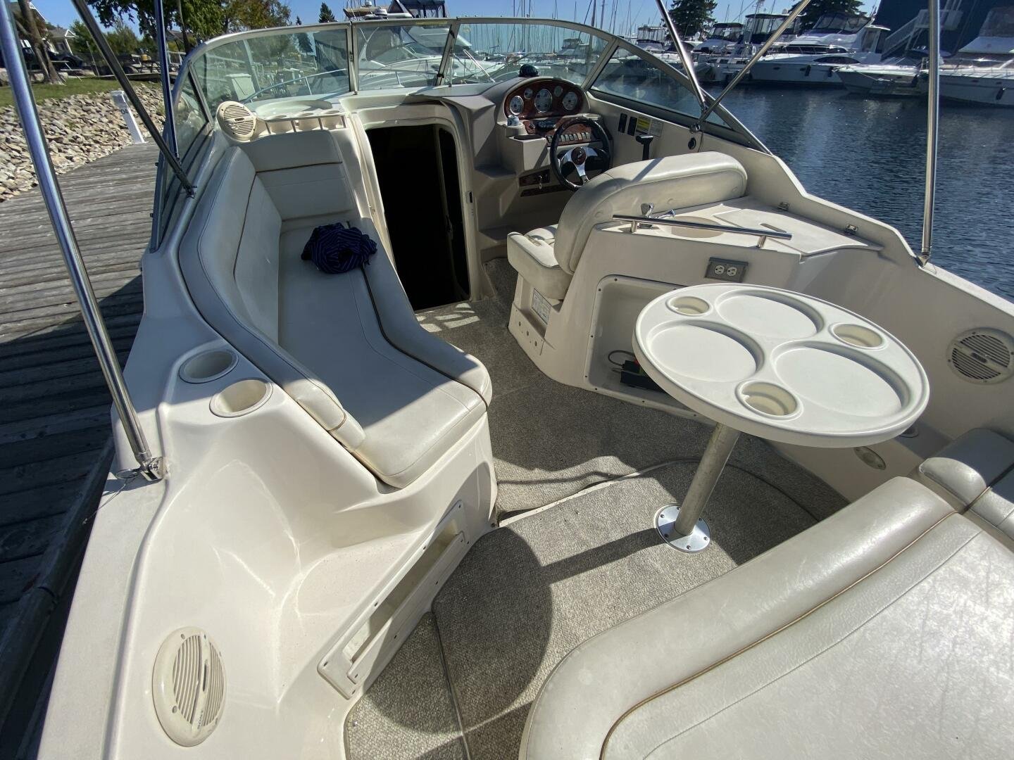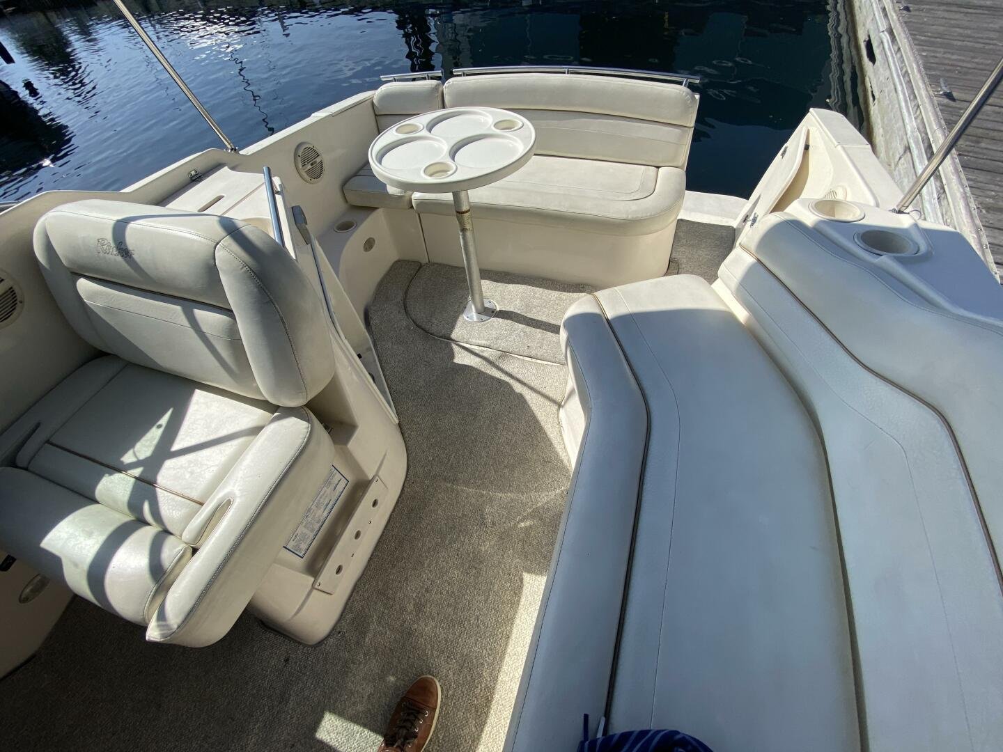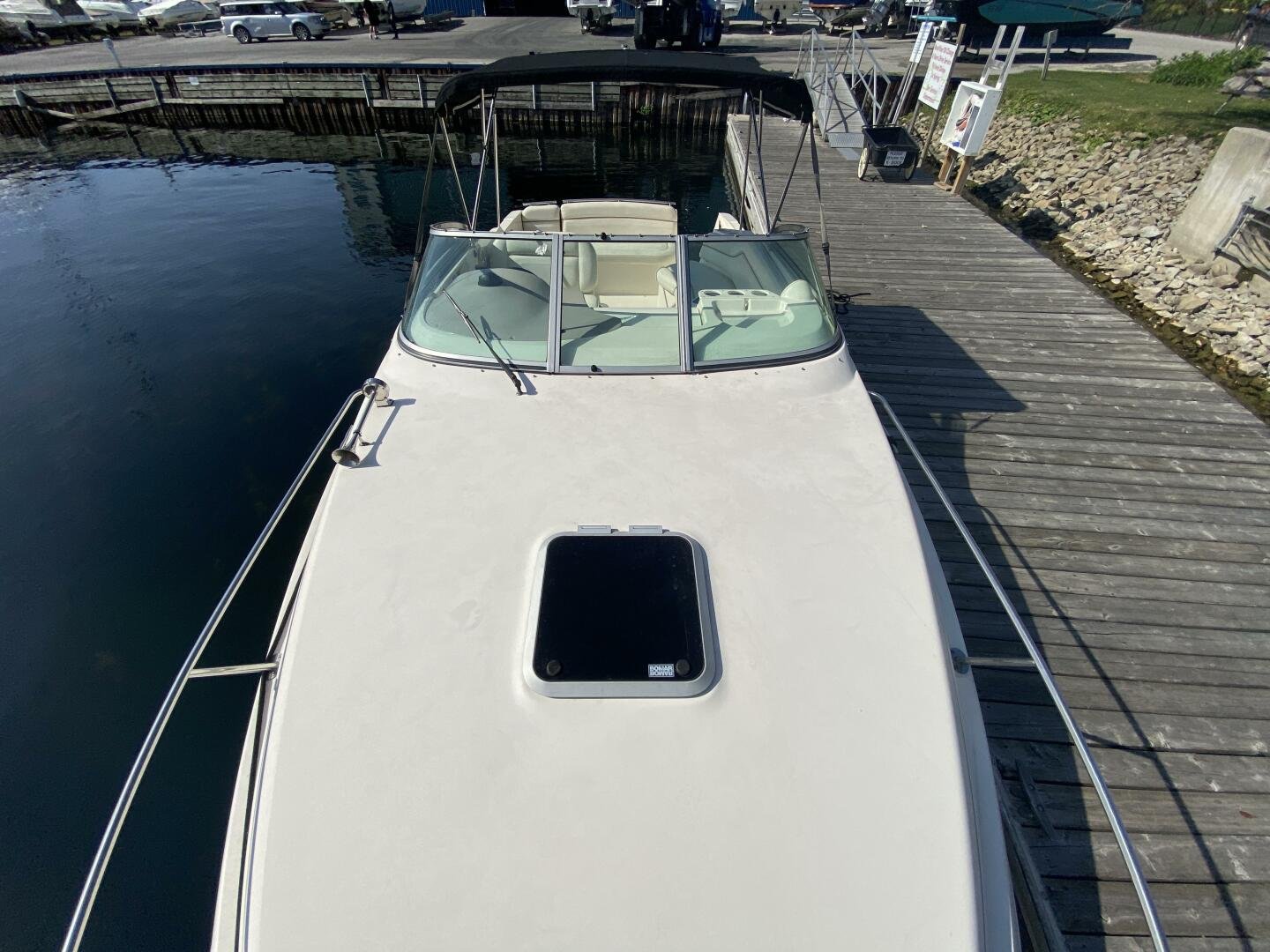 2005 Rinker Fiesta Vee 250 is a great weekender, offering enough space for short trips, with amenities like a galley, head with shower, decent freshwater capacity. The Bimini and enclosure, provides ample sun coverage or weather protection in the cockpit, maximizing seating comfort and capacity.