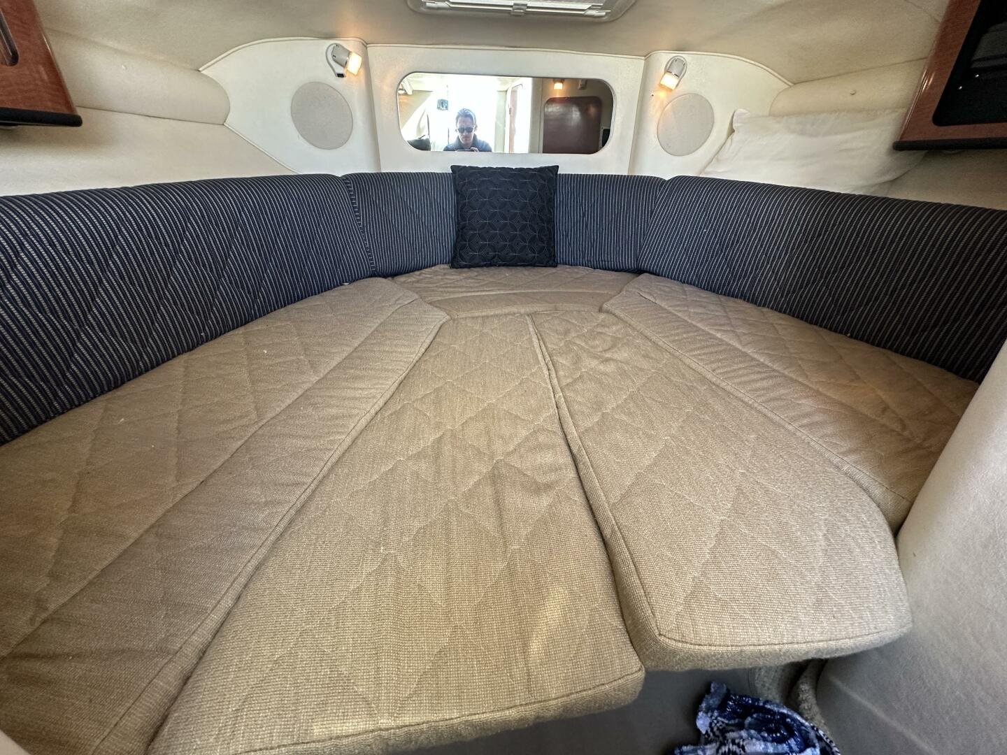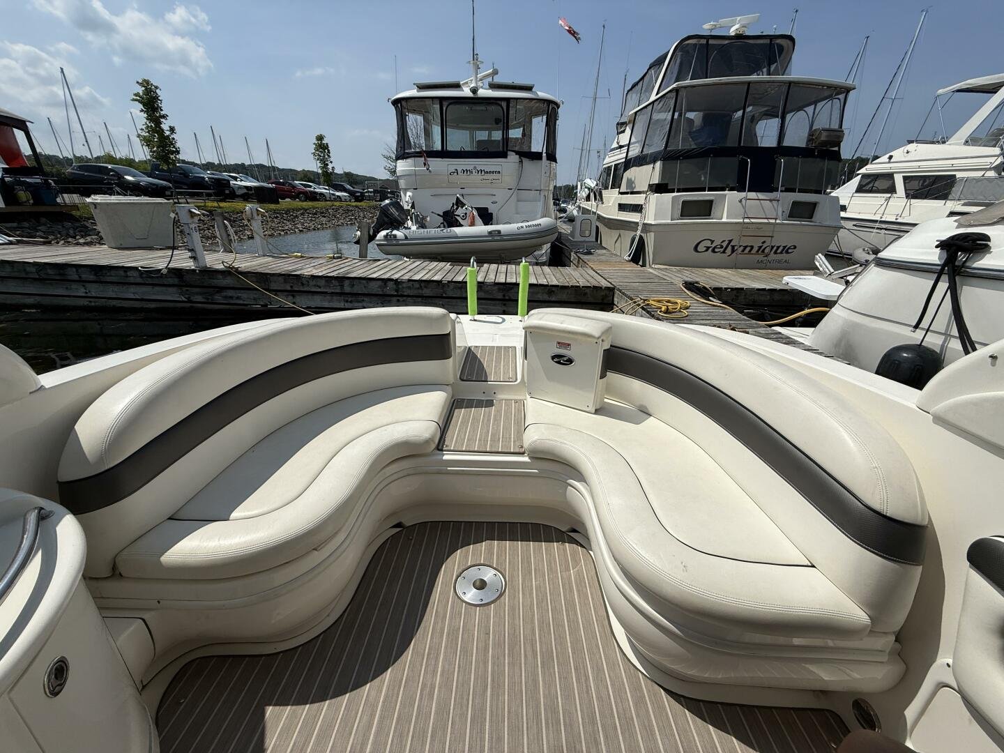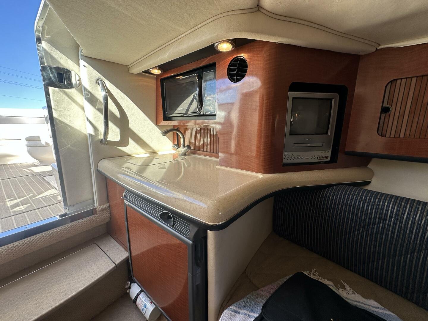 Stepping through the center-line transom door you have an expansive cockpit with large u-shaped seating, back-to-back seating to port, and storage & wet-bar to starboard. At the helm, there is an upgraded Garmin chartplotter. Down below there is a vaccu-flush head, microwave, tv-set, 12/110v fridge, dining table, and bed.