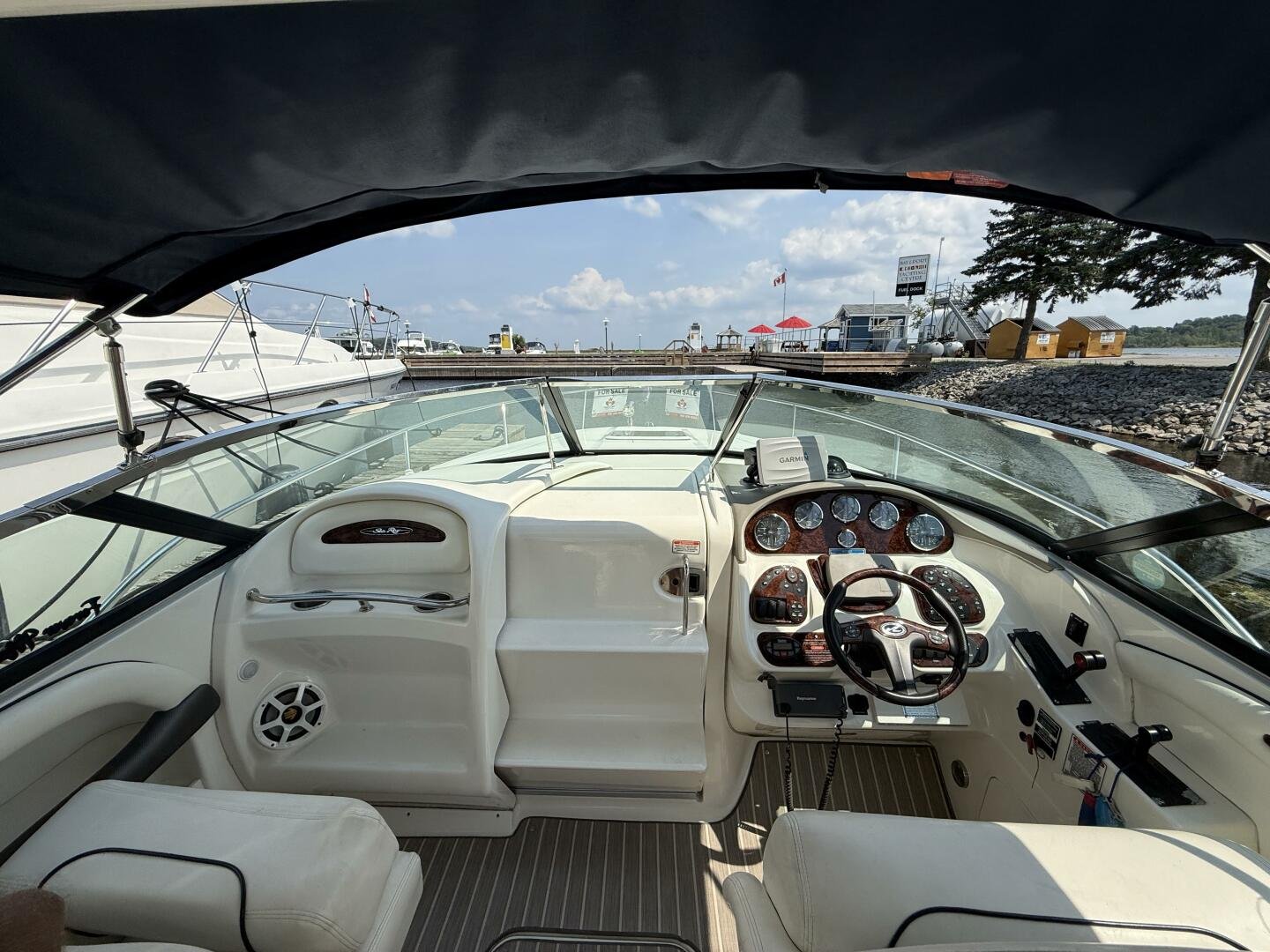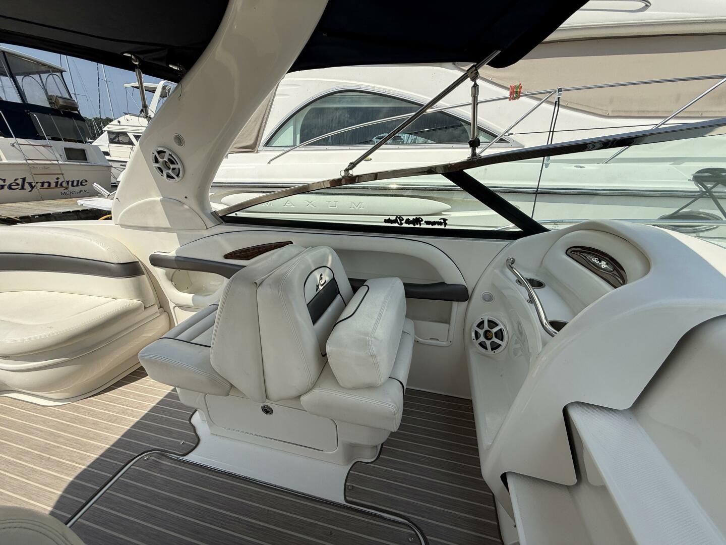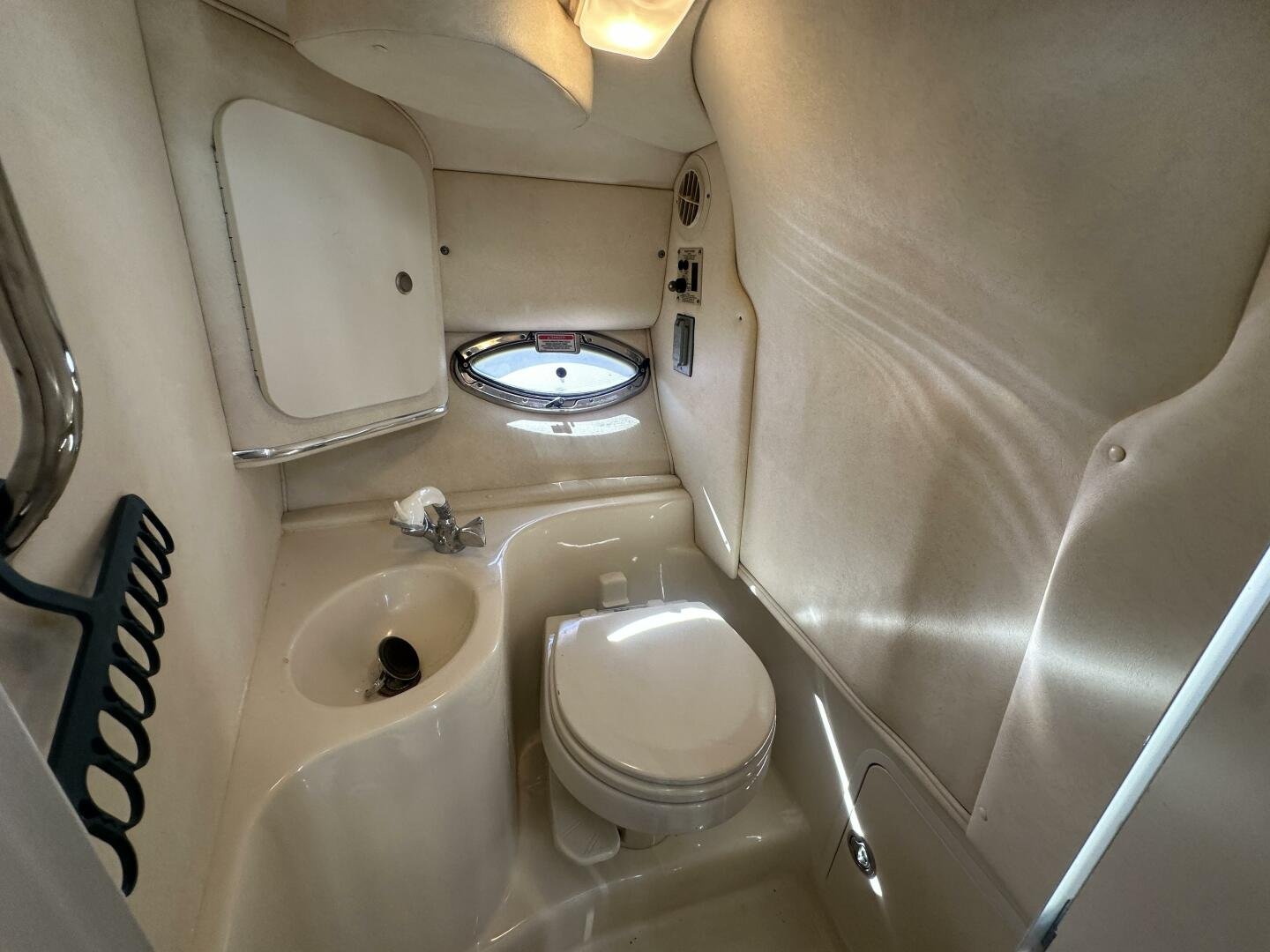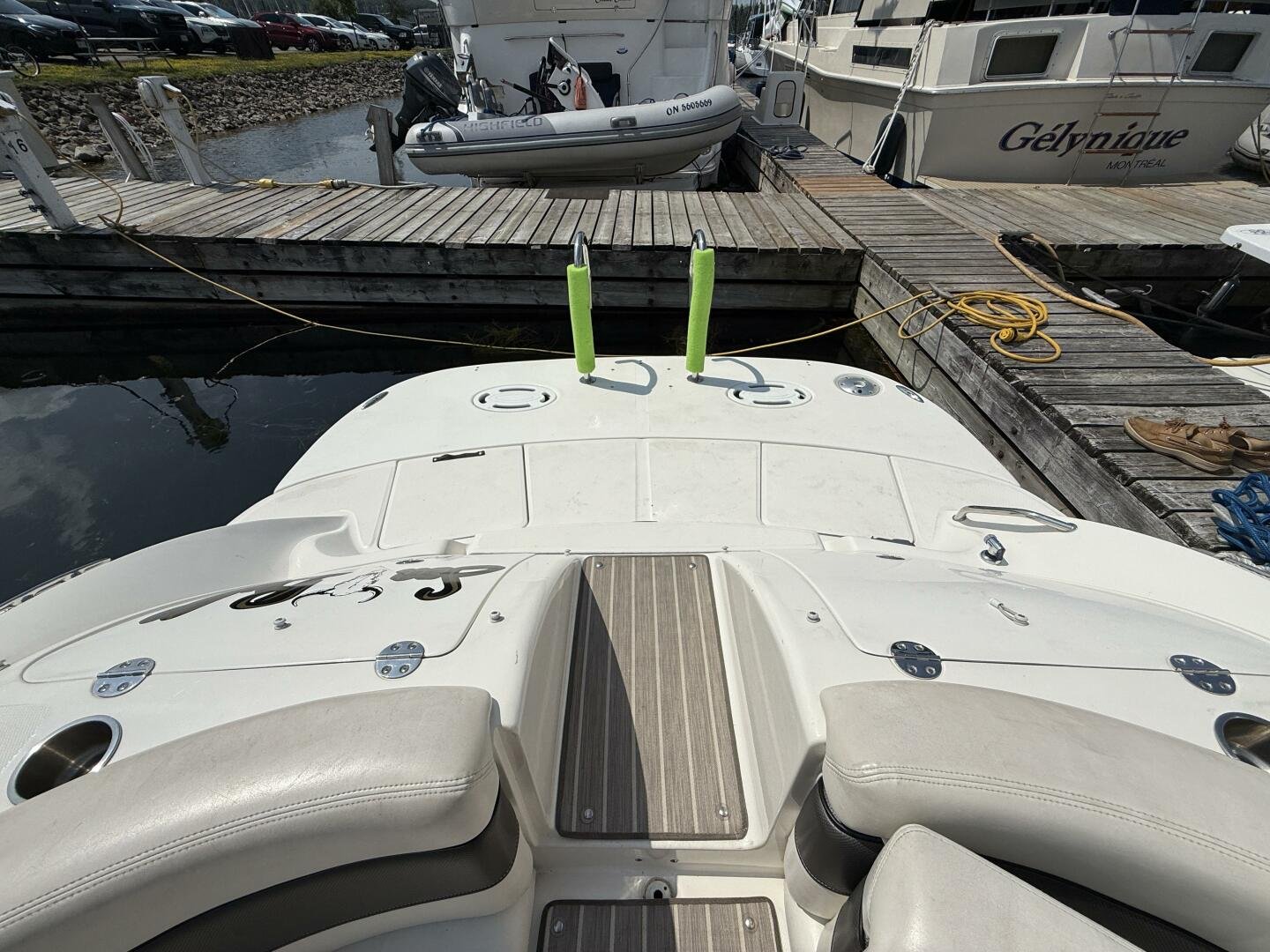 Stepping through the center-line transom door you have an expansive cockpit with large u-shaped seating, back-to-back seating to port, and storage & wet-bar to starboard. At the helm, there is an upgraded Garmin chartplotter. Down below there is a vaccu-flush head, microwave, tv-set, 12/110v fridge, dining table, and bed.