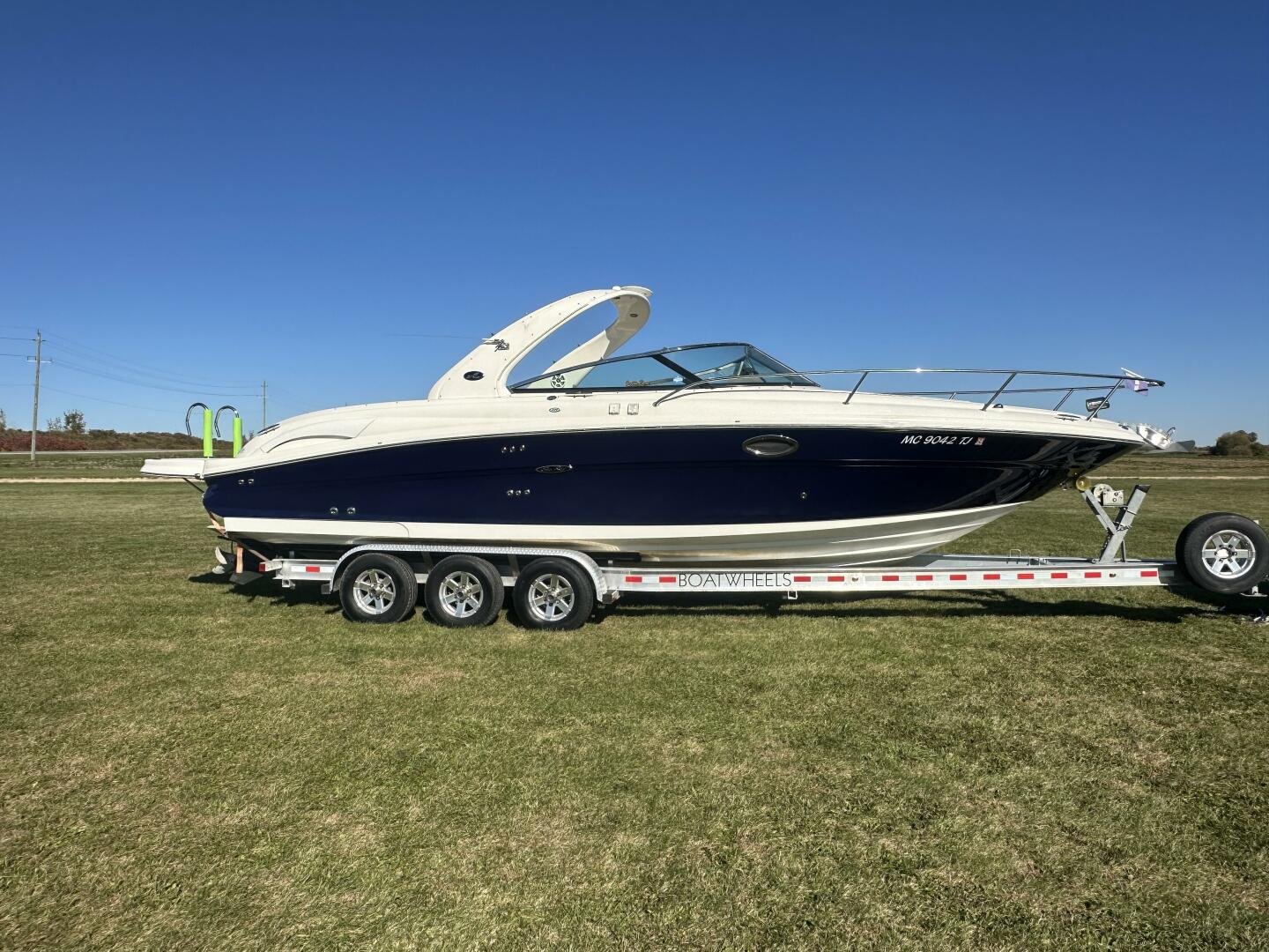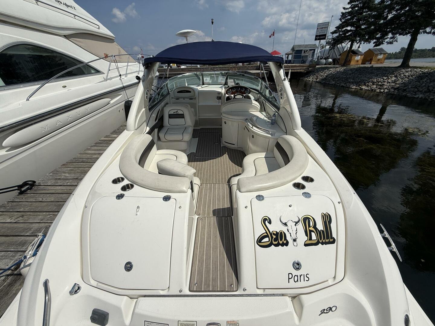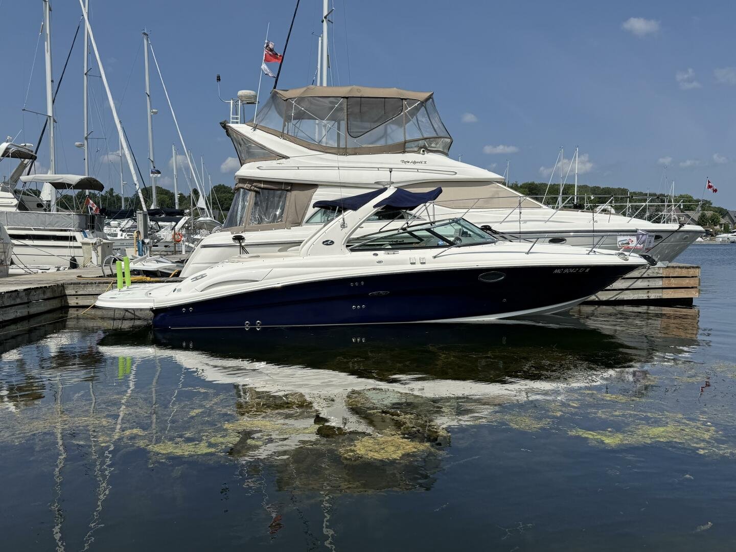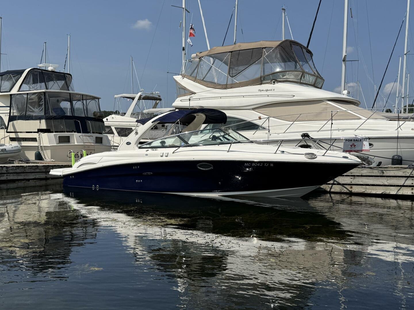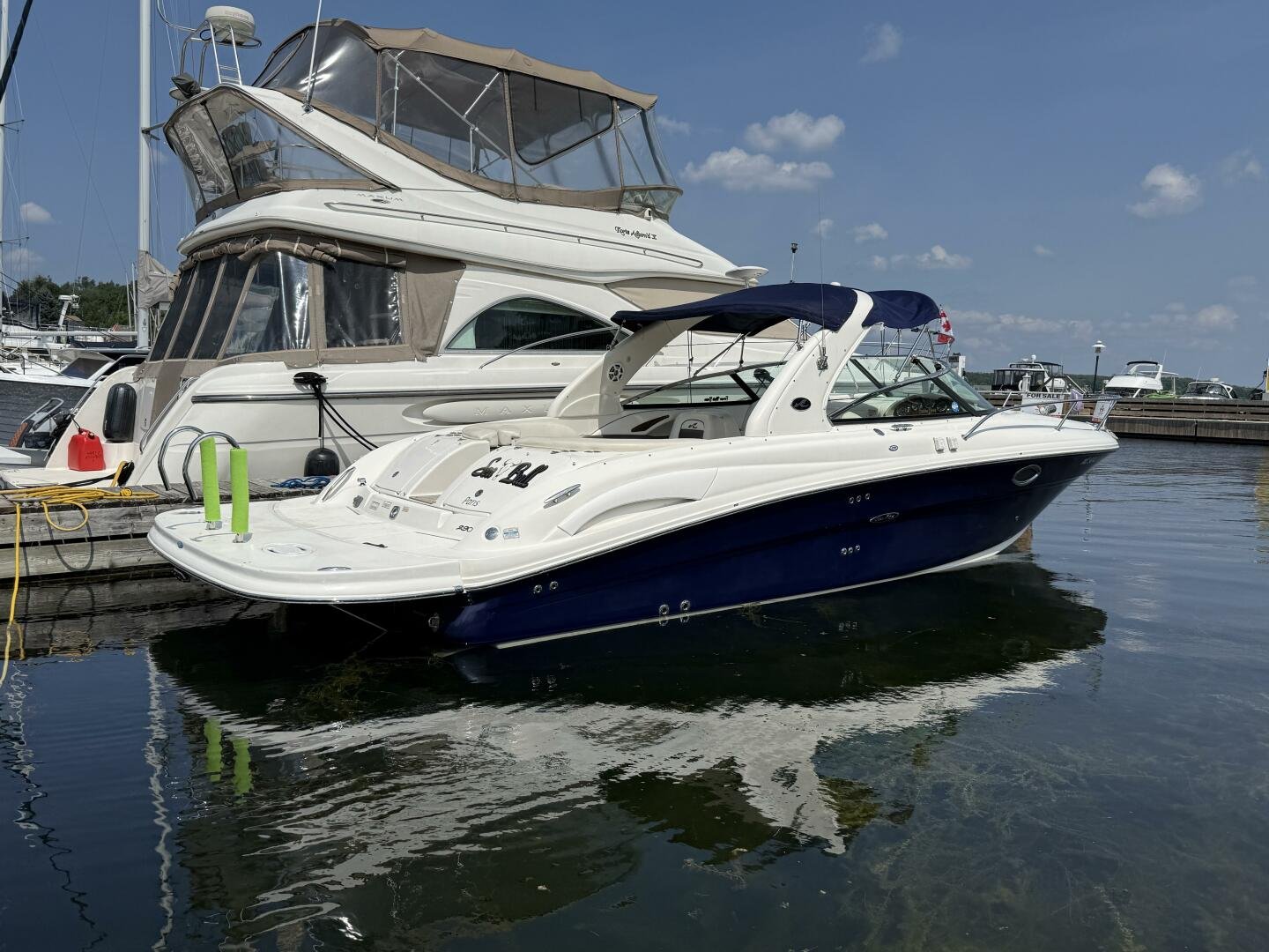 This Sea Ray 290 SS is a stylish large cuddy-cabin boat with expansive seating and the signature Sea Ray Midnight Blue hull. The stern has an extended swim platform added in 2023 w/ladder, under-platform LED lights, and BBQ mount/pole. There is also a cockpit shower, aft stereo controls, and two large storage areas.
