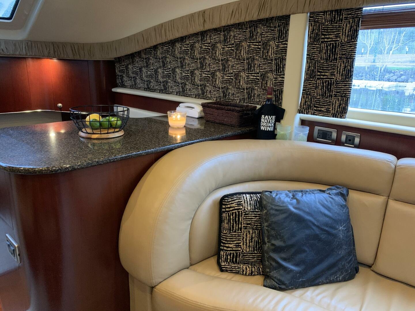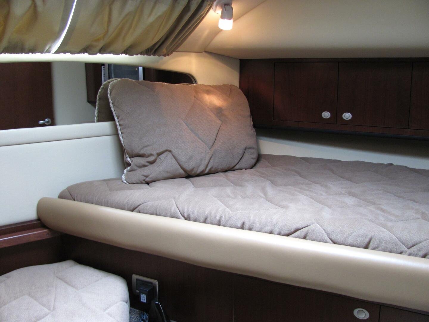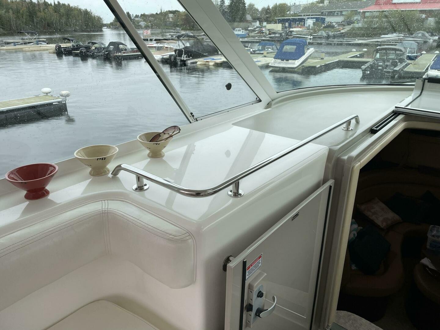 Located in Kenora on Lake of the Woods, it has spent most of its life in freshwater and it shows the way you’d expect because of that. Clean, well kept, and nothing that feels tired or neglected when you step aboard. Powered by twin MerCruiser 8.1 Horizons, a well-known and widely used package in this size range. These engines are known for being reliable, easy to service, and supported by just about any marine technician. It cruises comfortably in the 18 to 22 knot range, with a top speed around 26 to 28 knots. At cruising speed, you can expect fuel burn in the range of approximately 40 to 50 gallons per hour.