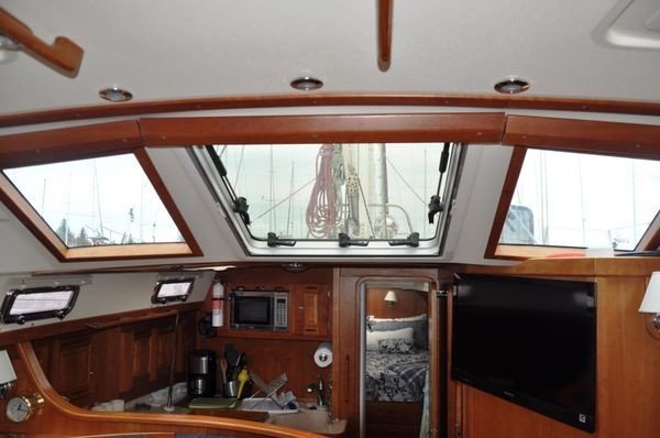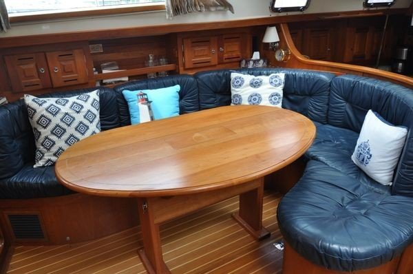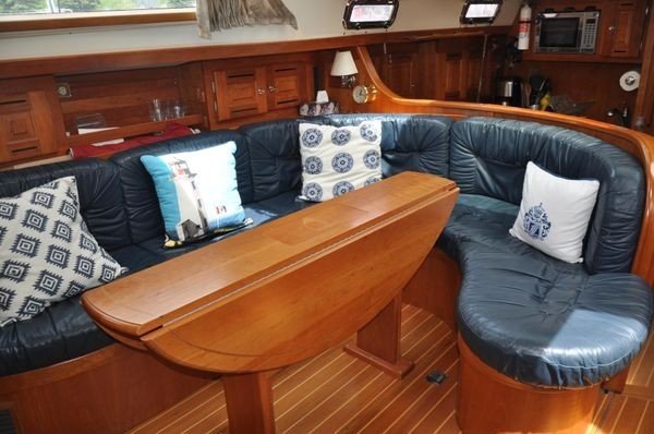 Saloon: The raised saloon is bright and spacious, with seven large ocean worthy ports allowing lots of light in and great visibility all around. The forward center hatch and two overhead hatches open to provide great ventilation. The J-shaped dinette is on port and has an oval drop-leaf table that will easily seat six. There is loads of storage beneath the settee as well as behind the seat backs. Additionally, there are four lockers and a large fiddled shelf above and behind the seat back along the hull. Beneath the raised saloon floor is the machinery space, with easy access to the engine and other systems for servicing as required.