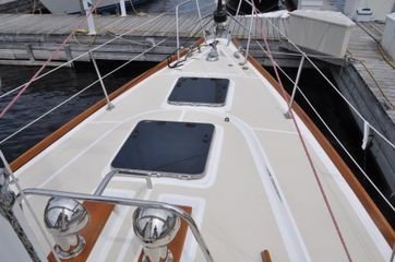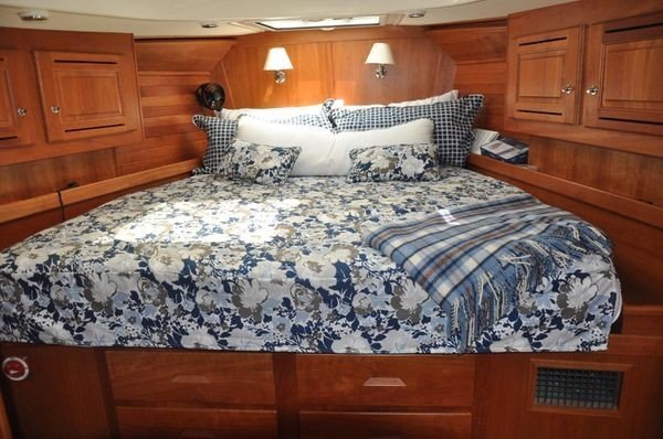 Forward stateroom: The forward stateroom was slightly modified to create a king sized, full width berth. There are drawers and additional storage beneath the berth and a step-up cabin sole for ease of getting in and out. Lockers and fiddled shelves line the hull along either side of the berth. There are also cedar-lined hanging and shelving lockers and numerous drawers for ample storage in this cabin.