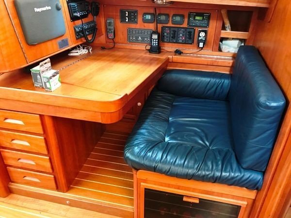 Nav station: The nav station is on starboard and forward facing. The wide leather seat has an armrest outboard and electrical equipment beneath it. The nav table can easily accommodate a chart book, has good storage inside the table and four storage drawers beneath. There is a hinged top with storage beneath it just outboard of the armrest. Above the nav table is a peninsula shaped cabinet with electrical and electronic items. Along the hullside are more electrical and electronic items. Two over/under cubbies are aft of that panel. Both areas have hinged access panels for easy servicing.
