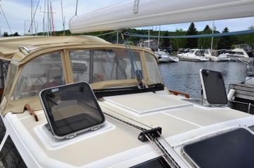 Double stainless steel bow and stern pulpits, 27” high x 1 1/8” stainless steel stanchions, Custom stern rail seats in stern pulpits, Double vinyl coated wire lifelines, Port and starboard boarding gates, Electric swim platform, Walkthrough transom to swim platform, Teak cockpit coaming caps with integral cup holders Teak housetop grab rails (6), Opening hatches (8), Solar vent on sail locker hatch, Imtra Skyscreens on all hatches, Opening ports with screens (11), Chrome dorade vents with stainless steel guard (2), Canvas is Sunbrella “Tan” Wavestopper hard dodger with side grab bars (’13) Bimini tubing in 1 ¼” stainless steel• Bimini w/connector (’13) Full cockpit enclosure with screens (’13) Kato dinghy davits