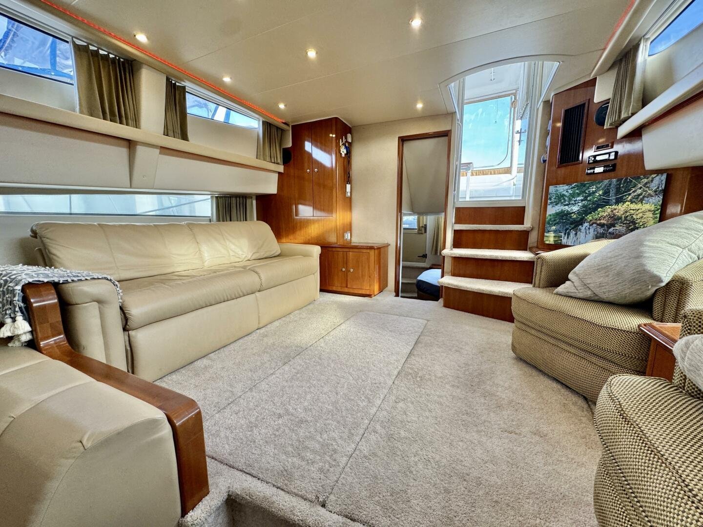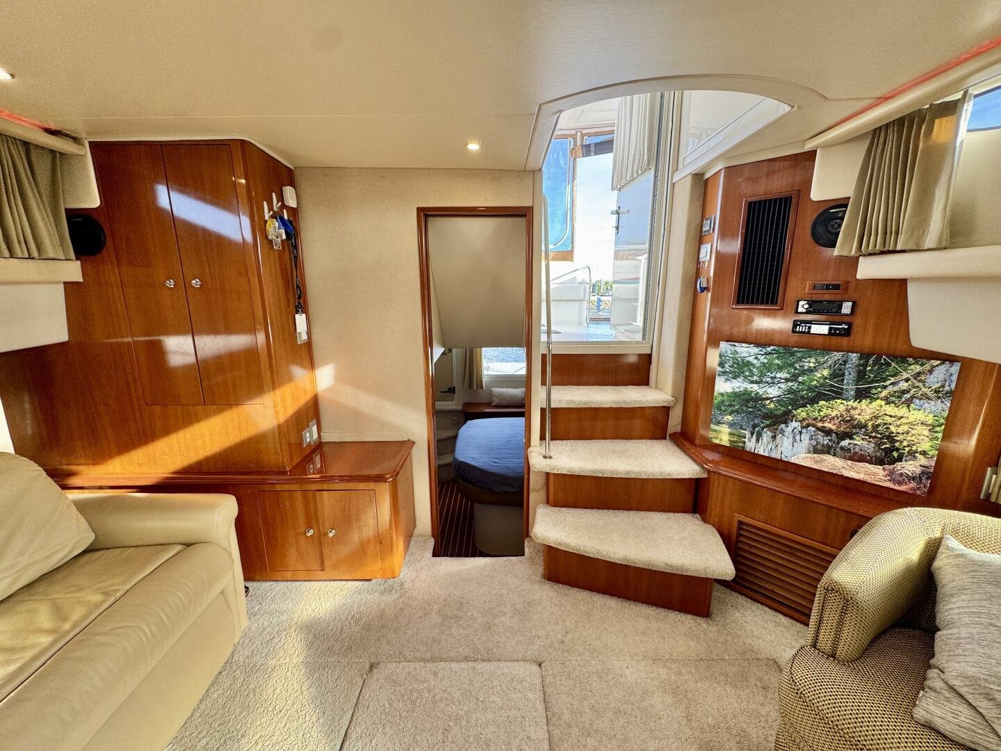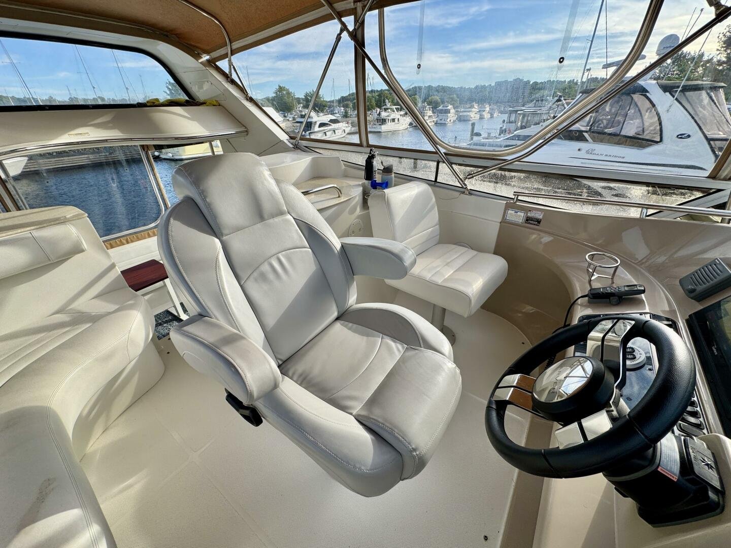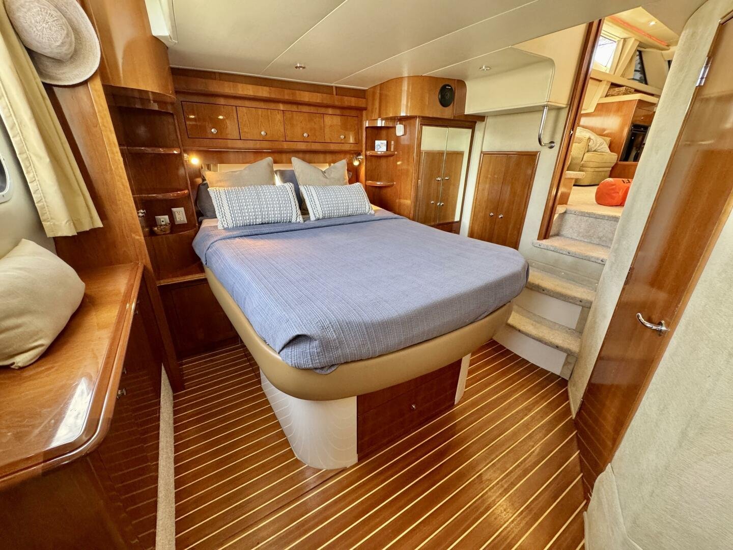Step aboard this luxurious 2006 Carver 43 Motor Yacht – later rebranded as the 47 Motor Yacht in 2008–09 to reflect its true overall length of 49’2”. Far more spacious than a typical 43’ aft cabin, this yacht was crafted in collaboration with BMW Group DesignworksUSA, blending Carver’s renowned comfort with sleek European styling. The result: a bright, full-beam interior accented in rich cherry wood and defined by long, sharply angled windows that flood the salon with natural light.
