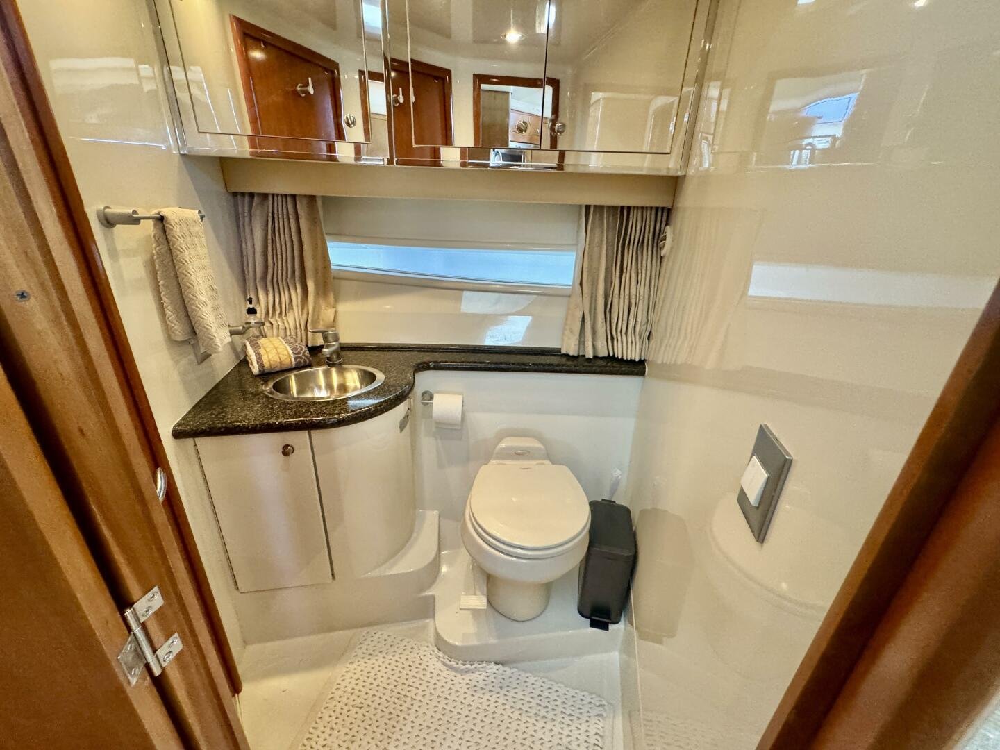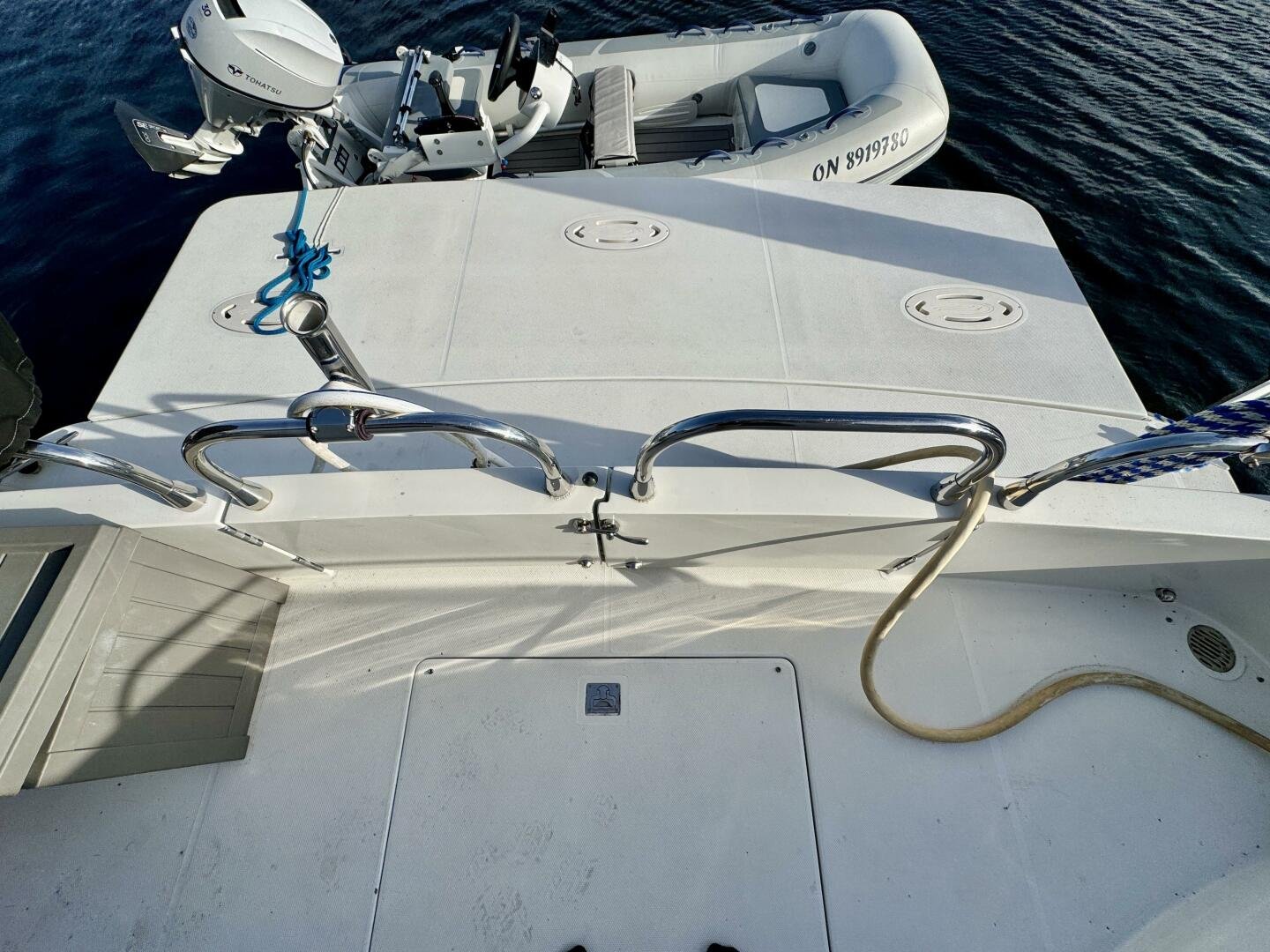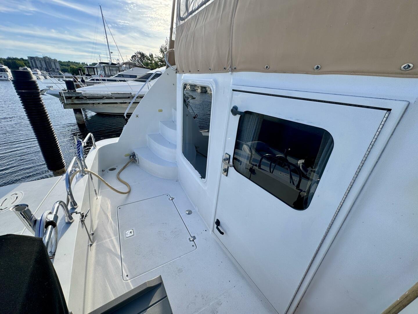 On deck, the aft cockpit design seamlessly combines the best of an aft cabin with the versatility of a sedan bridge and direct water access. Double transom doors lead to a large 4’ swim platform rated for 1,000 lbs—ideal for a personal watercraft or 13’ dinghy. Inside, the layout is equally impressive: the salon’s panoramic windows separate the inviting aft master stateroom with a walk-around queen berth from the forward guest stateroom. A spacious forward head with separate shower and a full-beam master head with glass-enclosed shower ensure privacy and comfort for owners and guests alike.