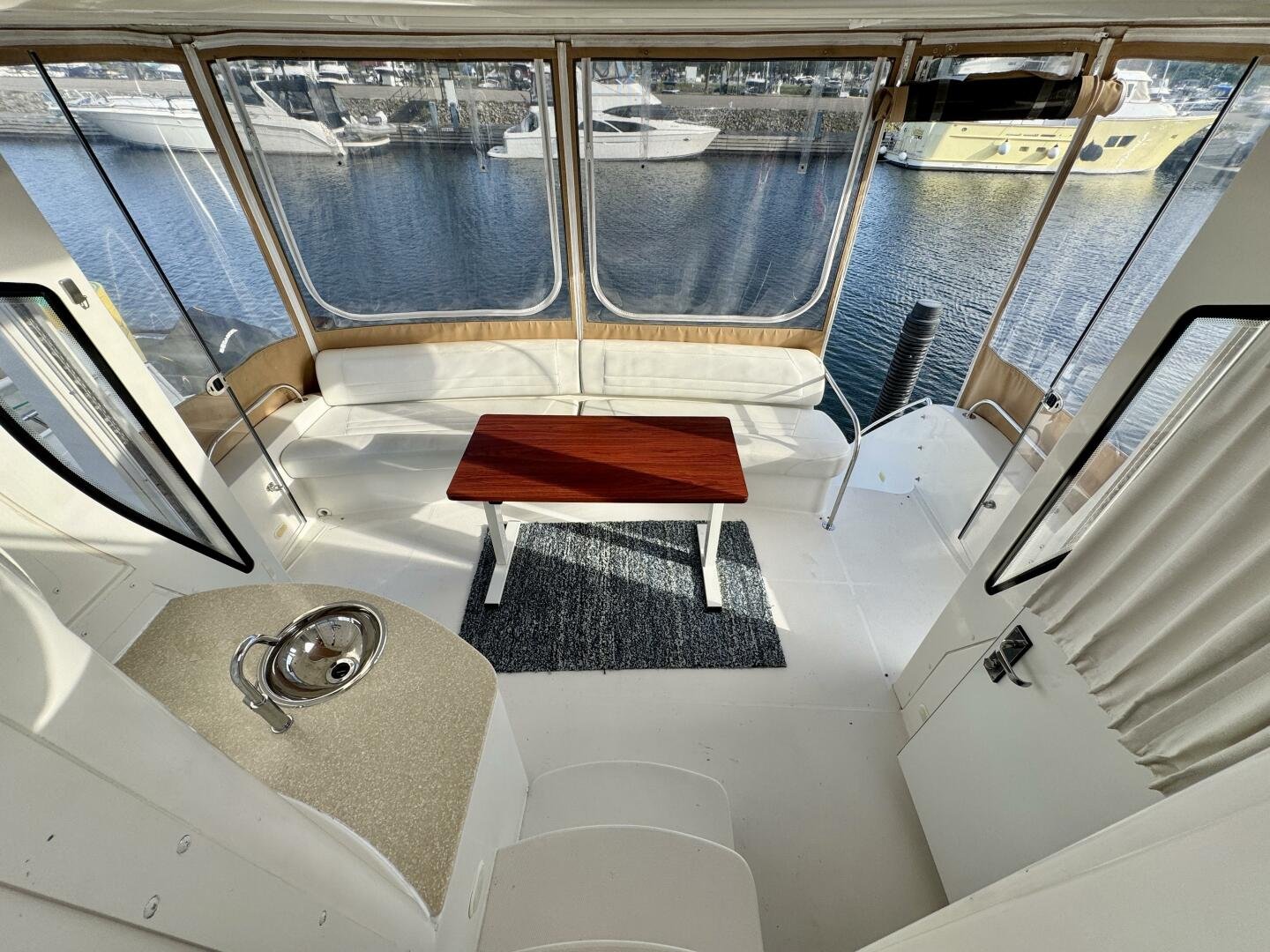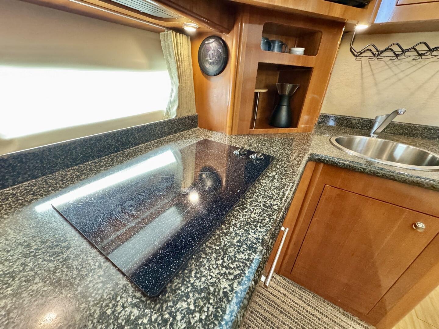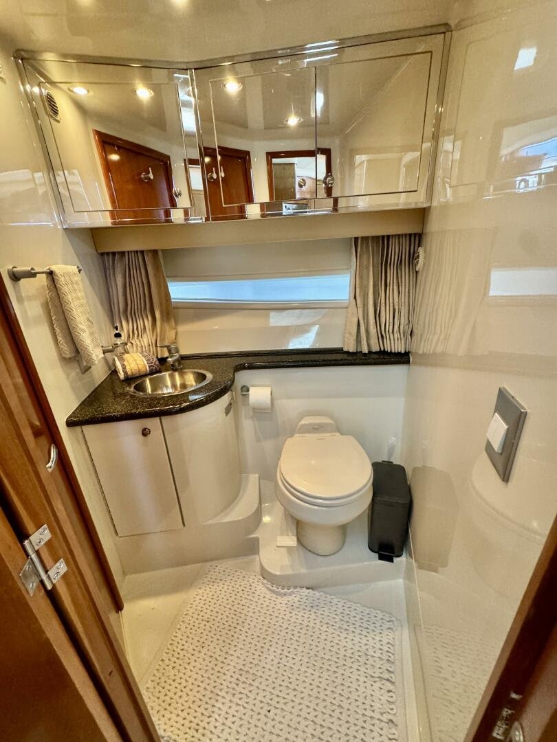 On deck, the aft cockpit design seamlessly combines the best of an aft cabin with the versatility of a sedan bridge and direct water access. Double transom doors lead to a large 4’ swim platform rated for 1,000 lbs—ideal for a personal watercraft or 13’ dinghy. Inside, the layout is equally impressive: the salon’s panoramic windows separate the inviting aft master stateroom with a walk-around queen berth from the forward guest stateroom. A spacious forward head with separate shower and a full-beam master head with glass-enclosed shower ensure privacy and comfort for owners and guests alike.