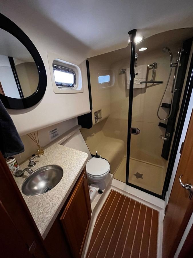 Head: Full-size stand-up shower with electric toilet, designed for comfort and convenience.