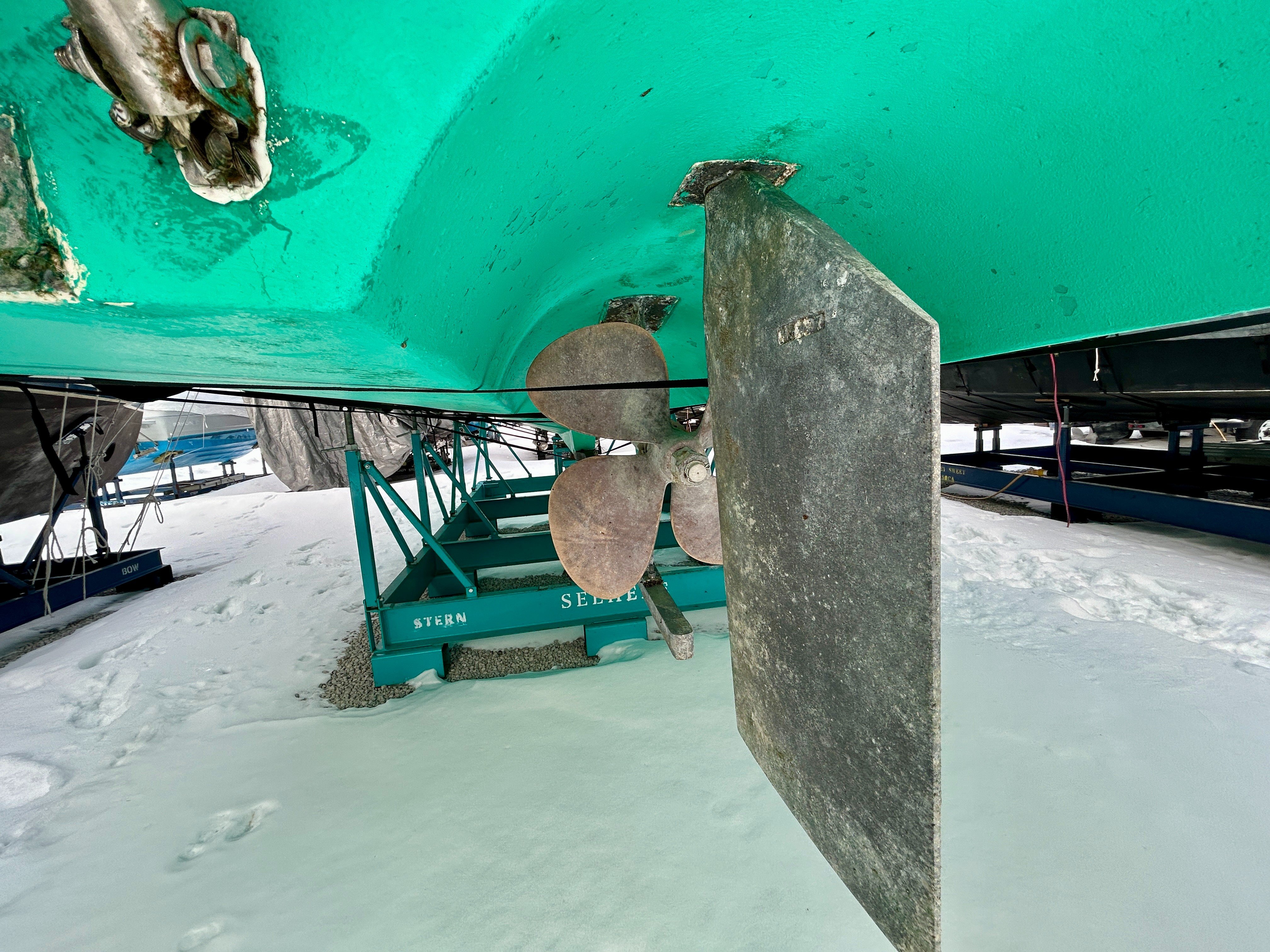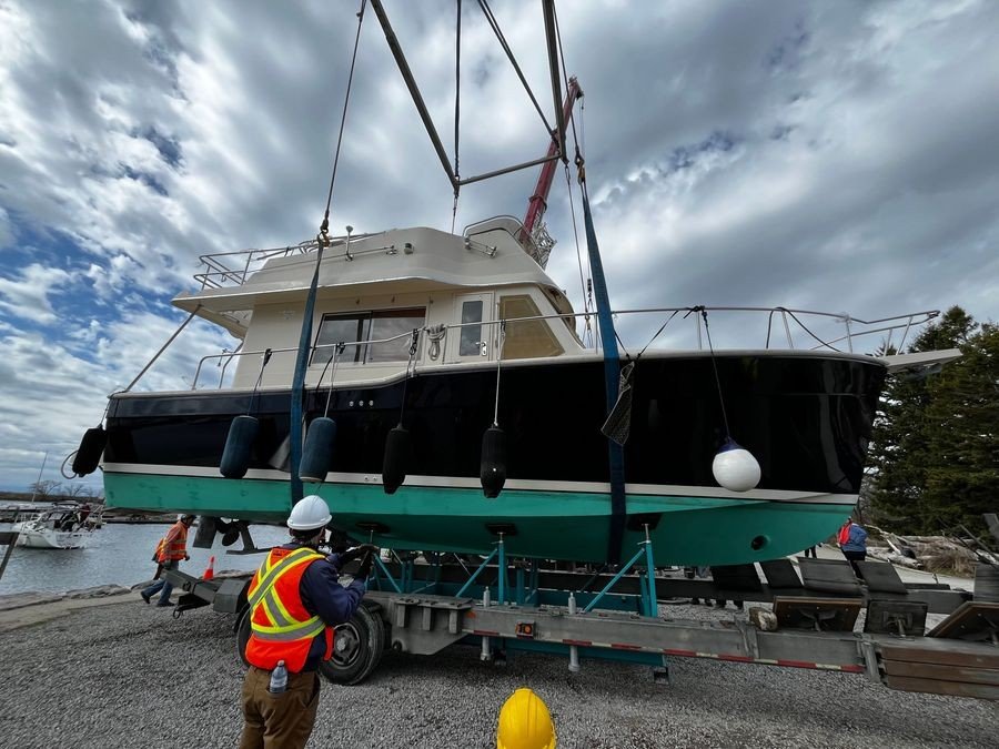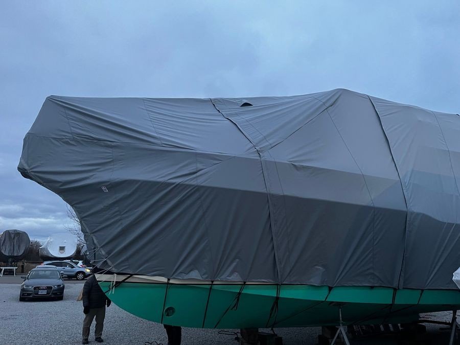 Storage: Large heavy-duty folding cradle with 8 pads (2023) and new Genco winter cover (2023).