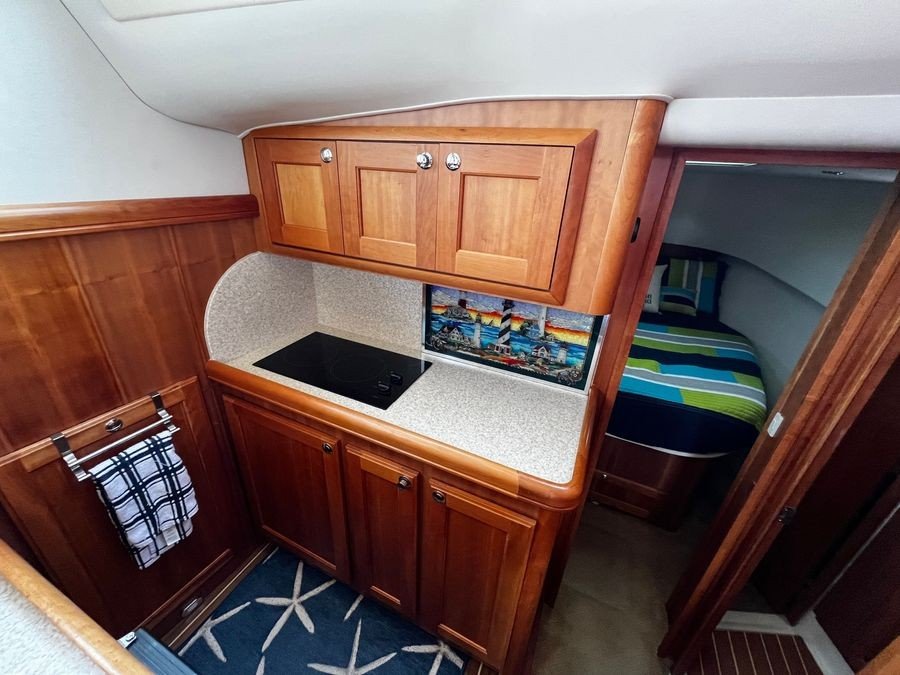 Galley: Fully equipped with a two-burner range, microwave oven, coffee maker, dual-voltage refrigerator and freezer, and Corian countertops. First-class fixtures and hardware throughout.