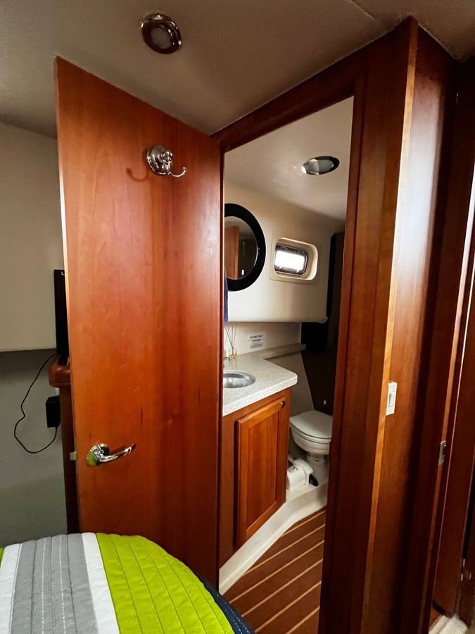 Master Stateroom: Centerline queen berth with near-walkaround access, providing comfort and privacy.