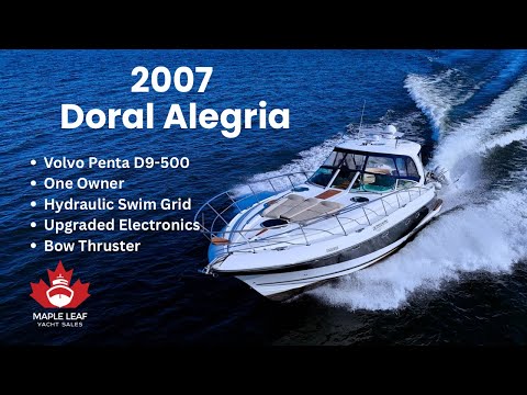 A rare chance to own the flagship of Doral’s Sport Yacht line - this 2007 Alegria, was the official boat show model, fully loaded with every top feature. Powered by twin 500HP Volvo D6 diesels with direct drives, she delivers exceptional performance, efficiency, and effortless handling. Canadian designed and built, the Algeria is renowned for its engineering and ingenuity, blending European elegance with American functionality. Her ocean-capable hull features a sharp entry at the bow and hard chine starting a few feet back from the bow for superior rough water performance. Unique to Doral, the industry-first retractable windshield panel provides easy foredeck access at the push of a button. The spacious cockpit features a hardtop, expansive helm deck, integrated swim platform with factory hydraulic platform, sun lounge/table, cockpit shower, and refrigerator – perfect for entertaining. Inside, the bright, open saloon with 7-foot of headroom feels far larger than other yachts in her class.