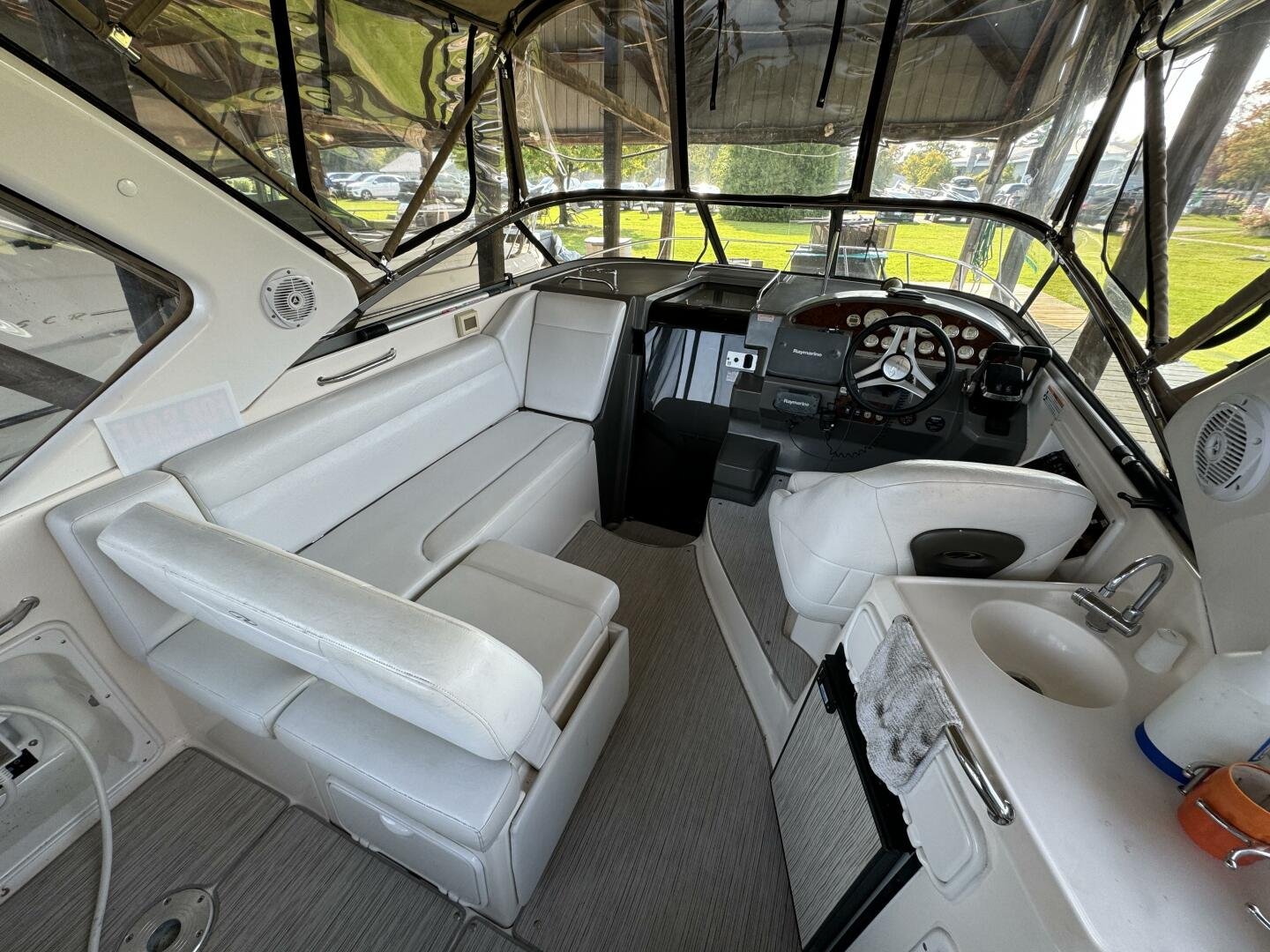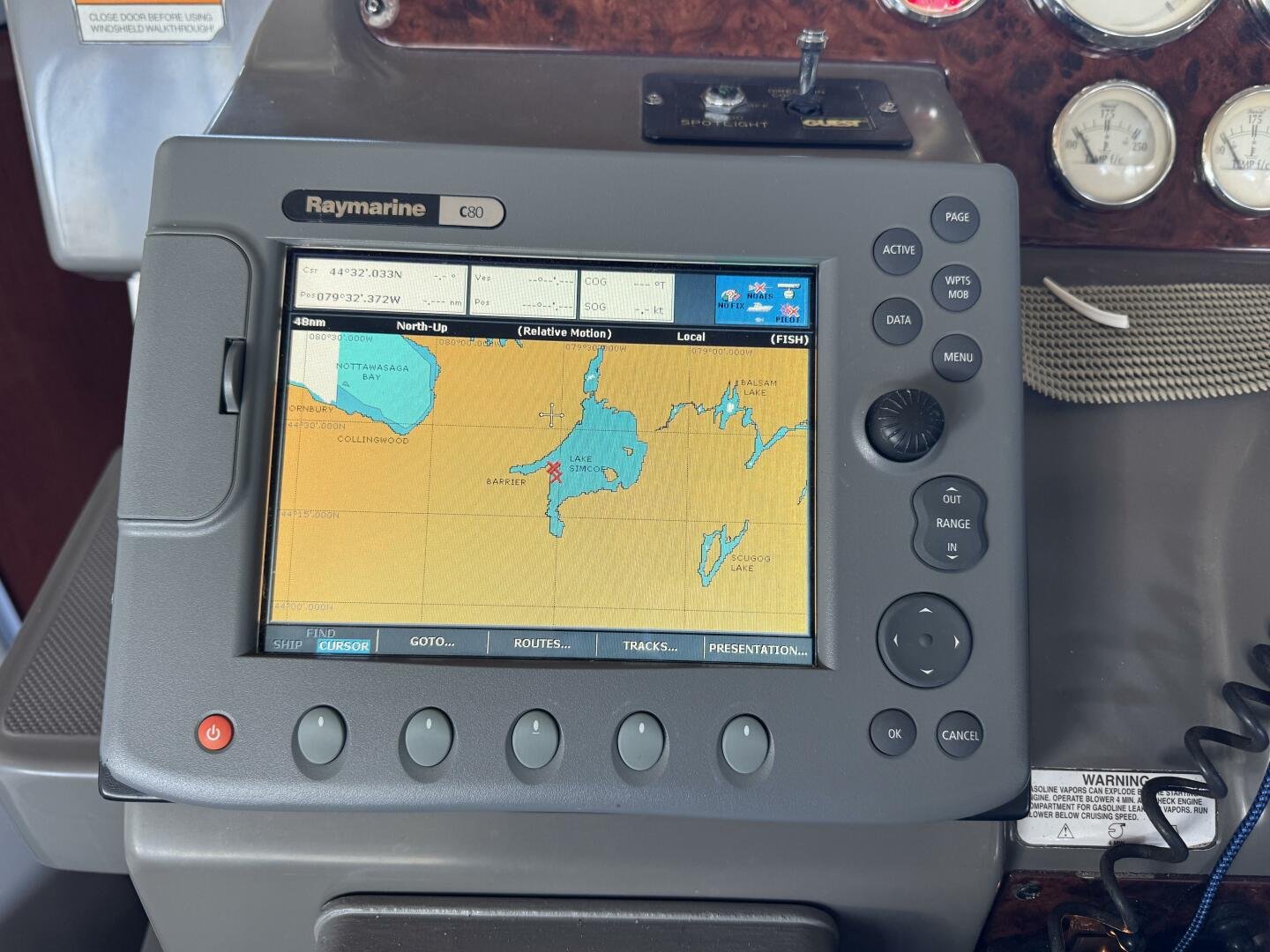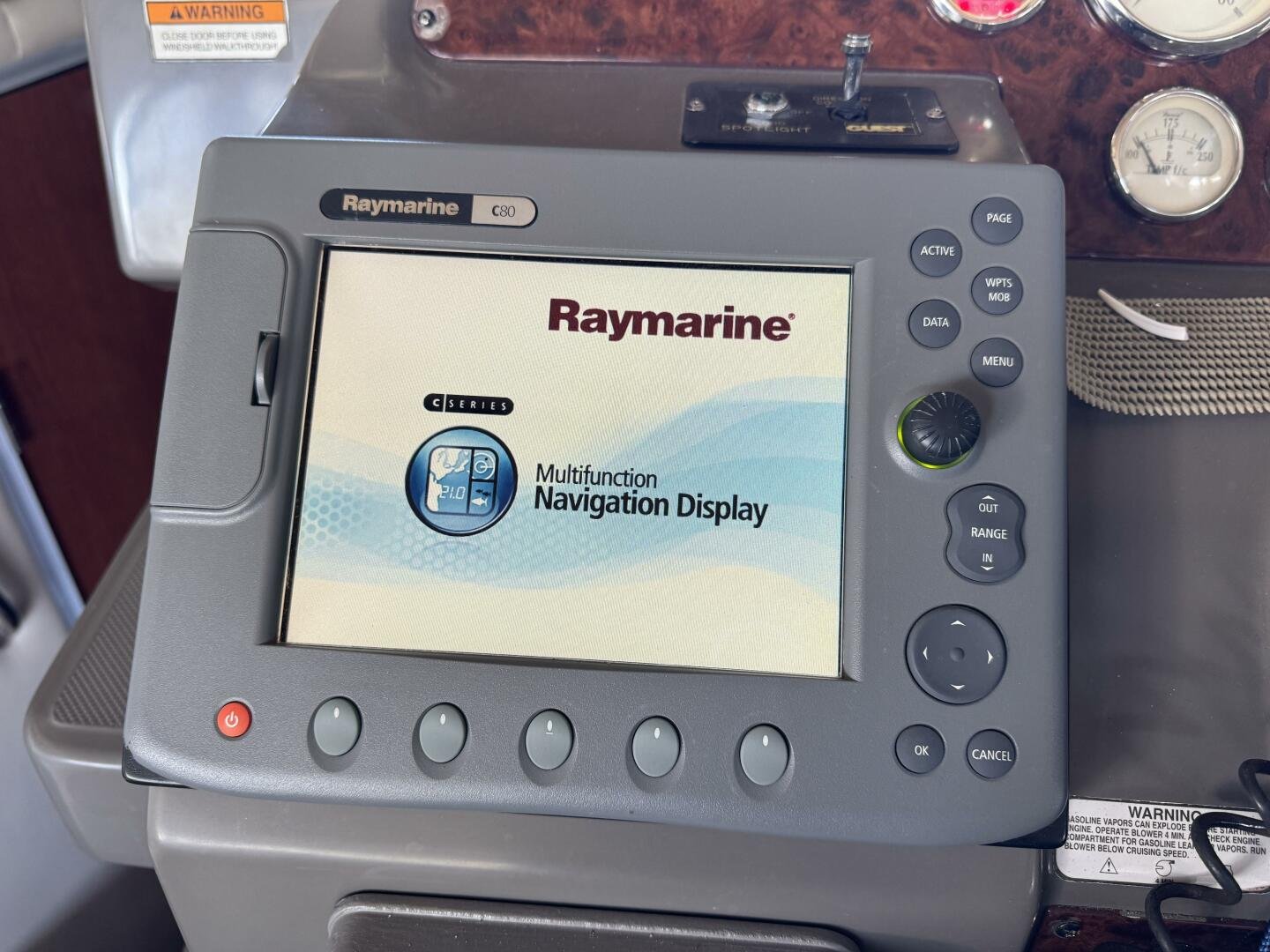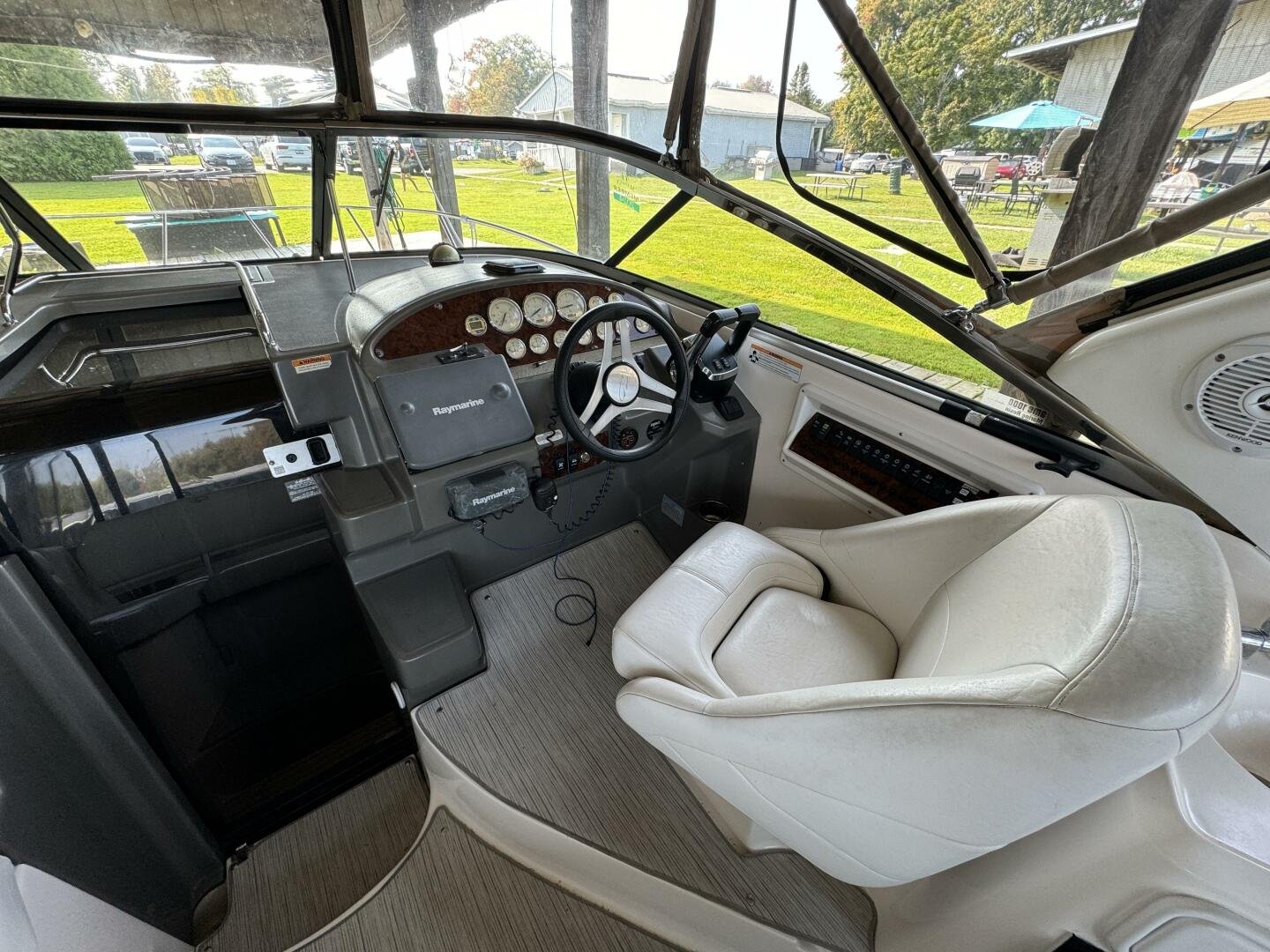 The cockpit offers lots of seating, a hot/cold freshwater shower and a prep station with sink and fridge. There is a removable snap in carpet on the decking and a full camper enclosure. At the helm you'll find a Raymarine, Raymarine VHF radio, depth finder, spotlight, stereo control and trim tabs. This boat also features a walk-through window to access the bow.