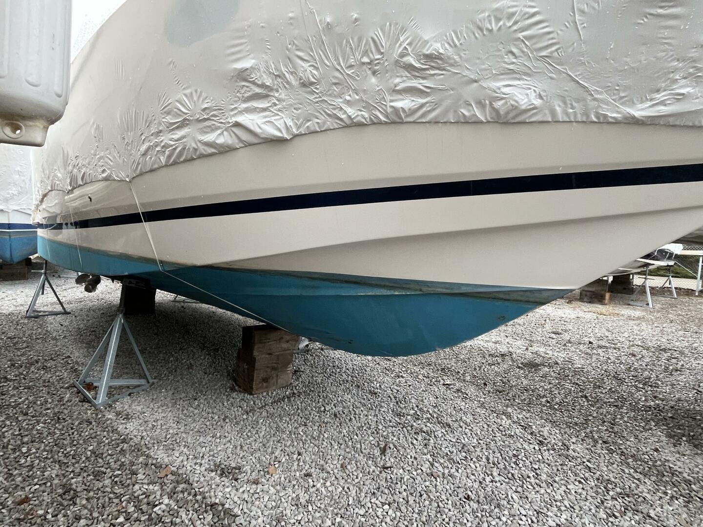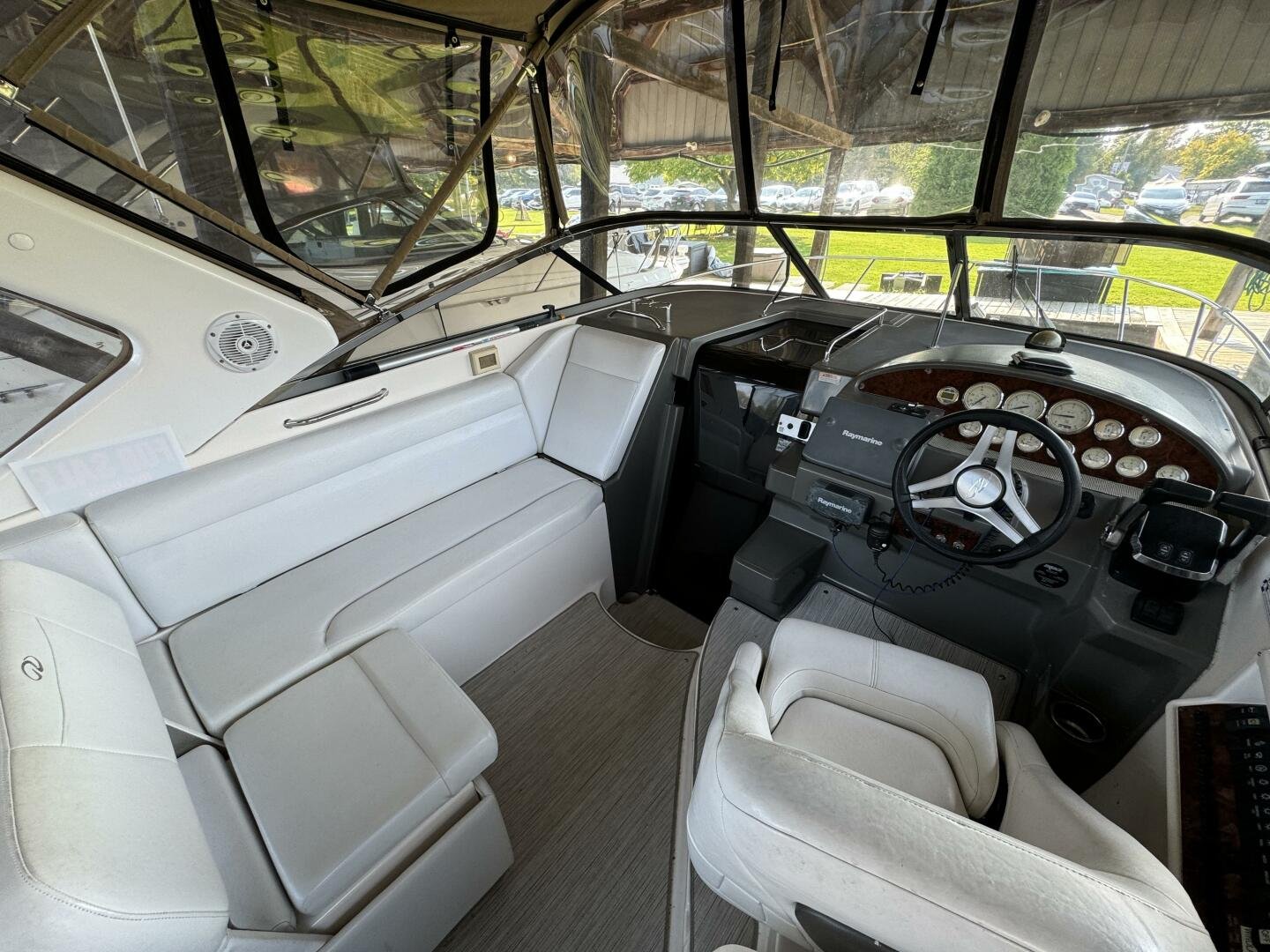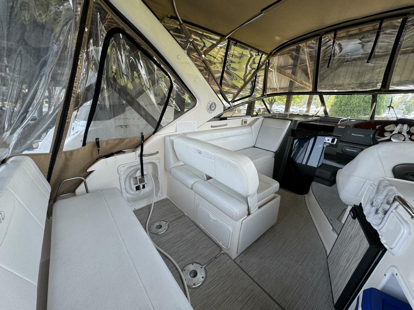 The cockpit offers lots of seating, a hot/cold freshwater shower and a prep station with sink and fridge. There is a removable snap in carpet on the decking and a full camper enclosure. At the helm you'll find a Raymarine, Raymarine VHF radio, depth finder, spotlight, stereo control and trim tabs. This boat also features a walk-through window to access the bow.