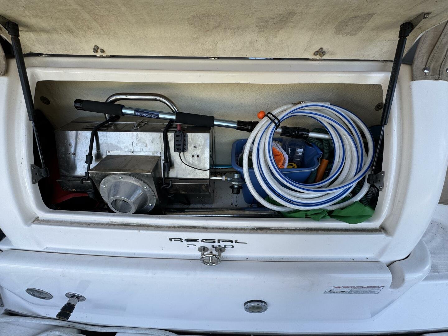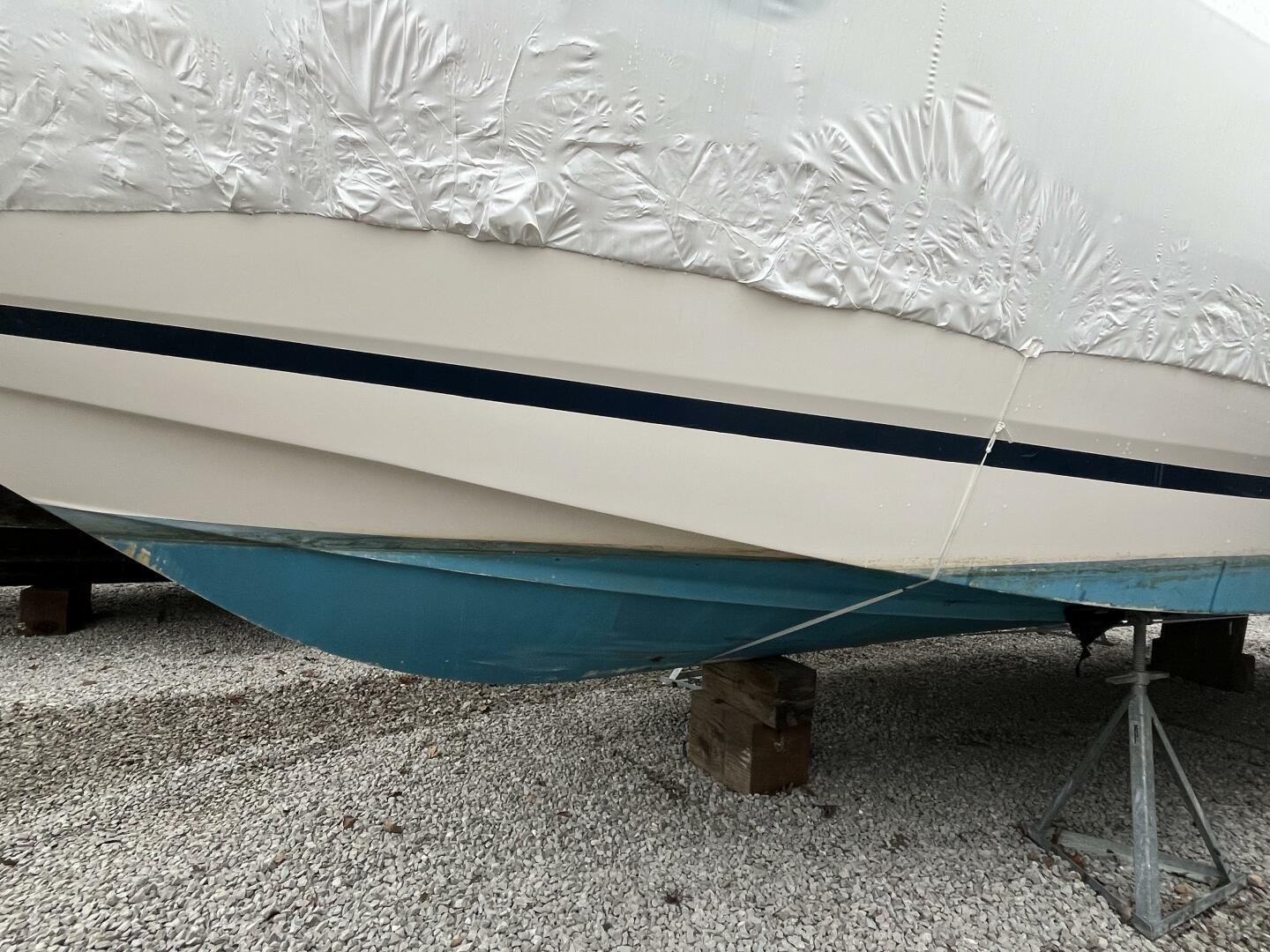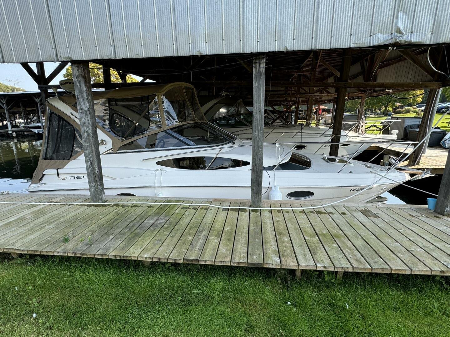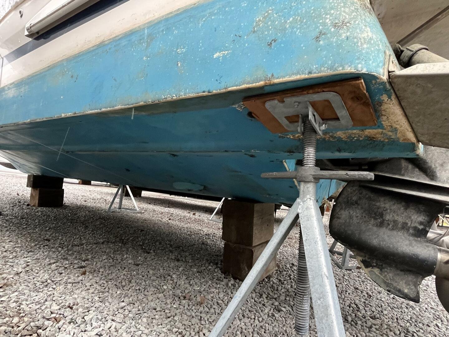 The cockpit offers lots of seating, a hot/cold freshwater shower and a prep station with sink and fridge. There is a removable snap in carpet on the decking and a full camper enclosure. At the helm you'll find a Raymarine, Raymarine VHF radio, depth finder, spotlight, stereo control and trim tabs. This boat also features a walk-through window to access the bow.