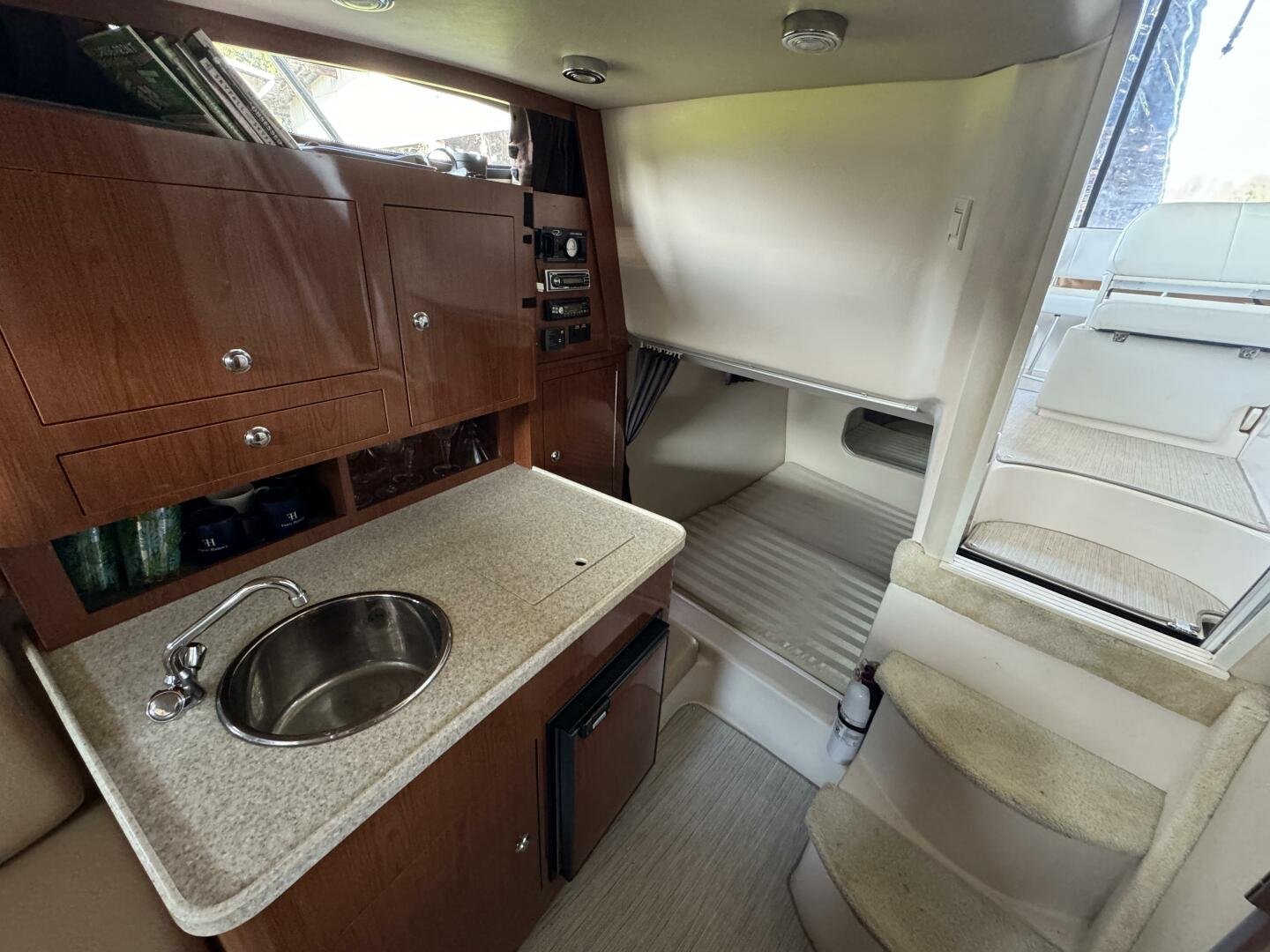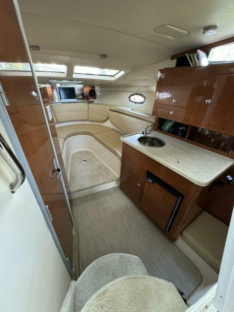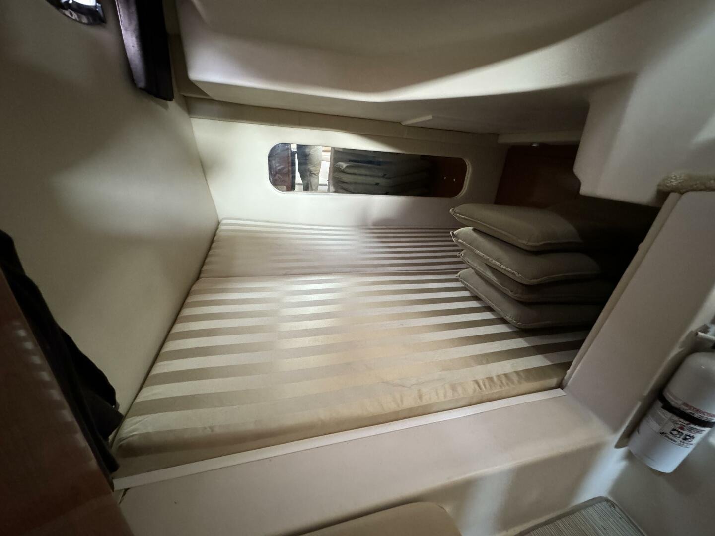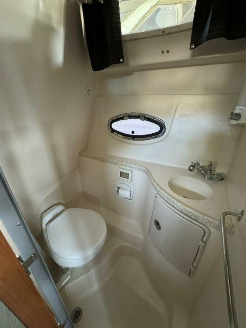 Down below there is a galley to starboard which features a sink, single burner stovetop and more storage. This boat does have AC and Heat in the cabin. To port there is a wet head. Forward is a convertible berth for seating of sleeping and aft is a queen size berth with privacy shade.