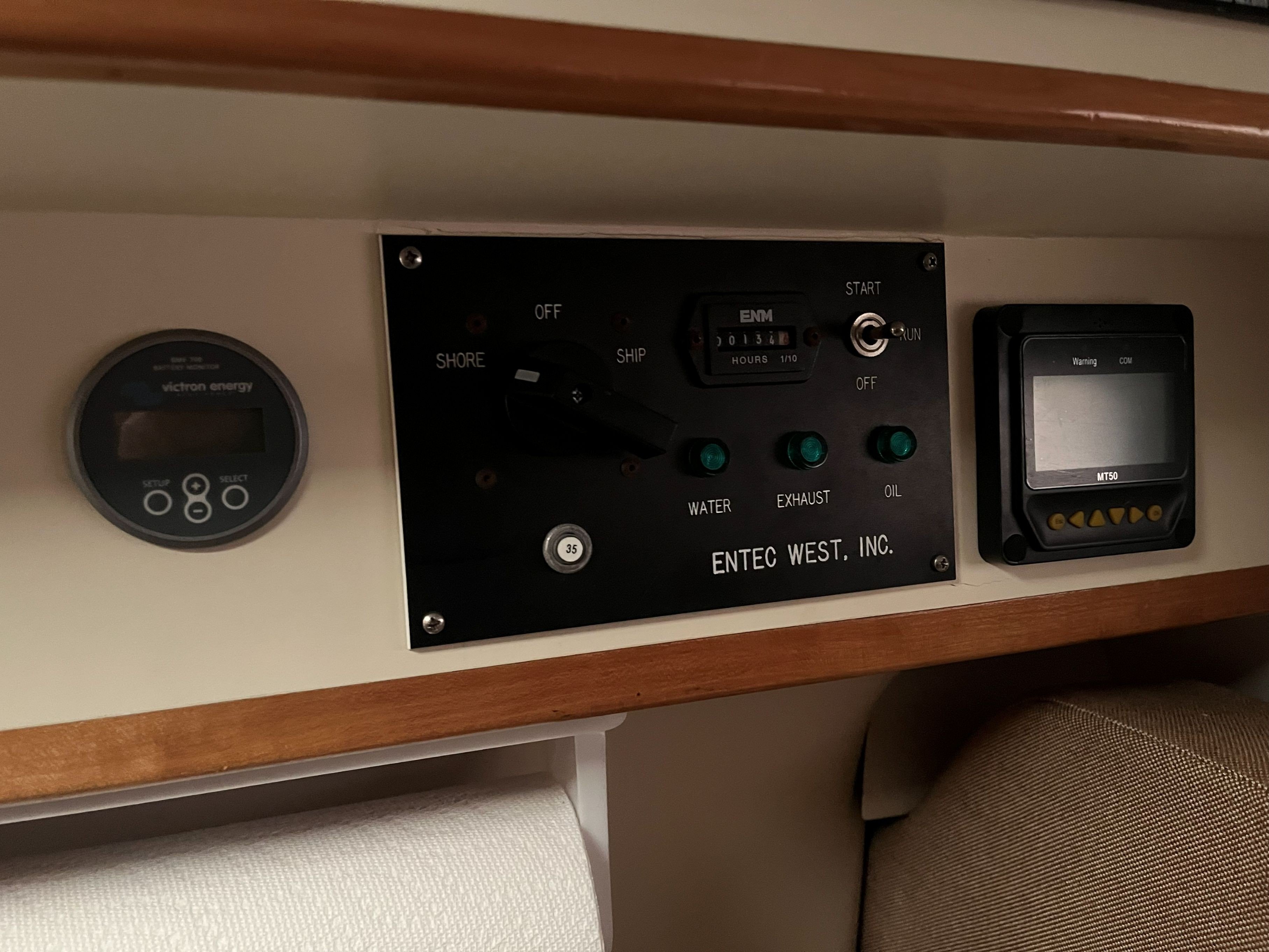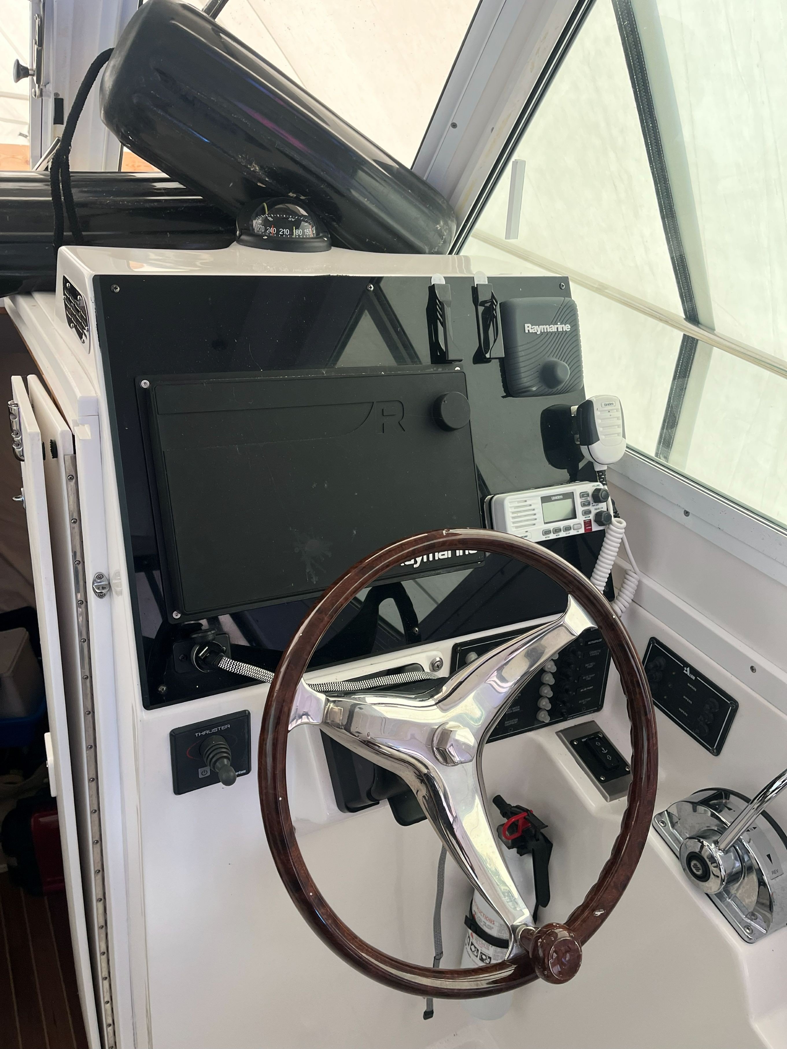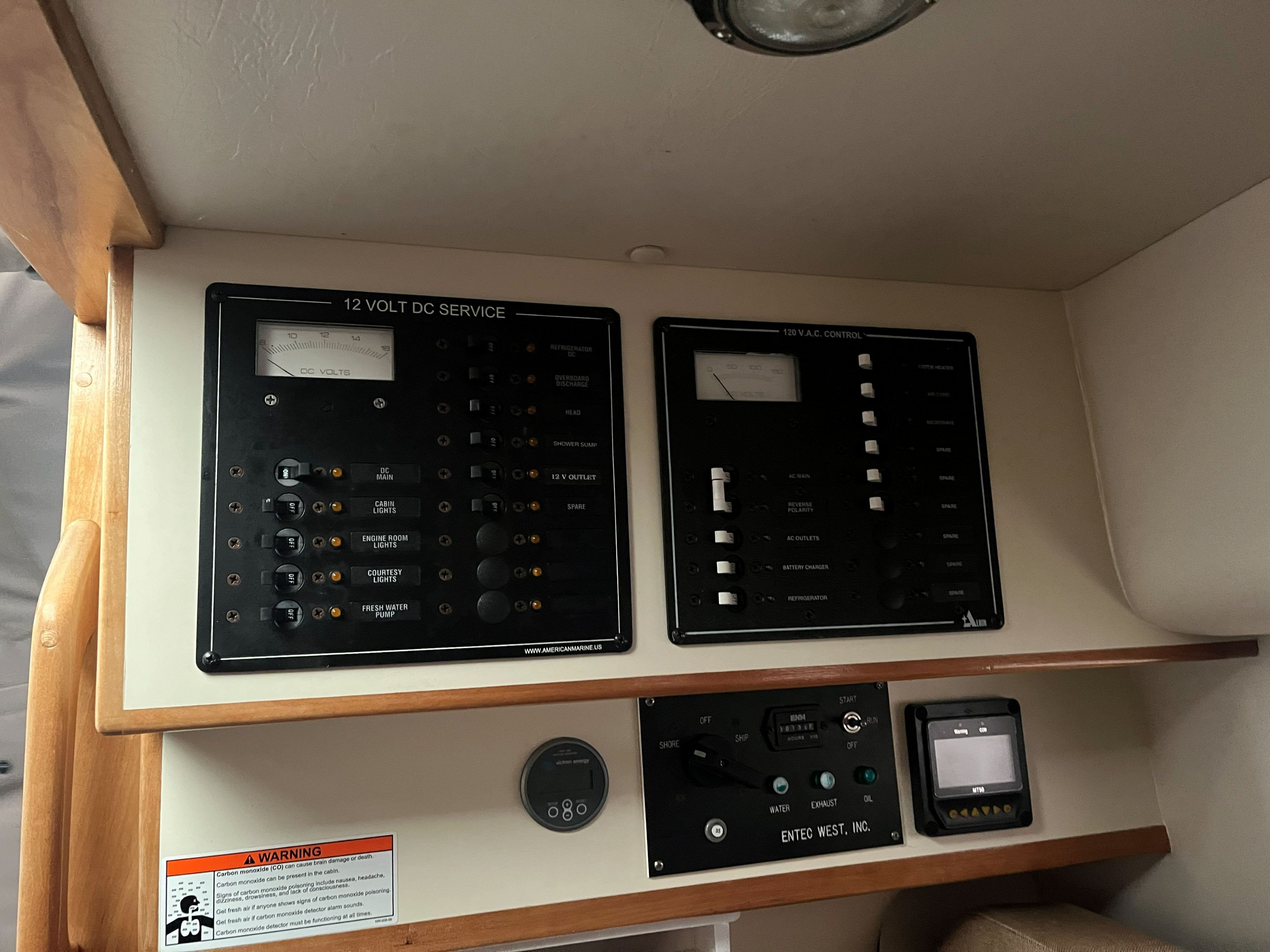 110V battery charger. Battery monitor. Raymarine Axiom 12 chartplotter. Raymarine Autopilot, VHF radio, stereo.