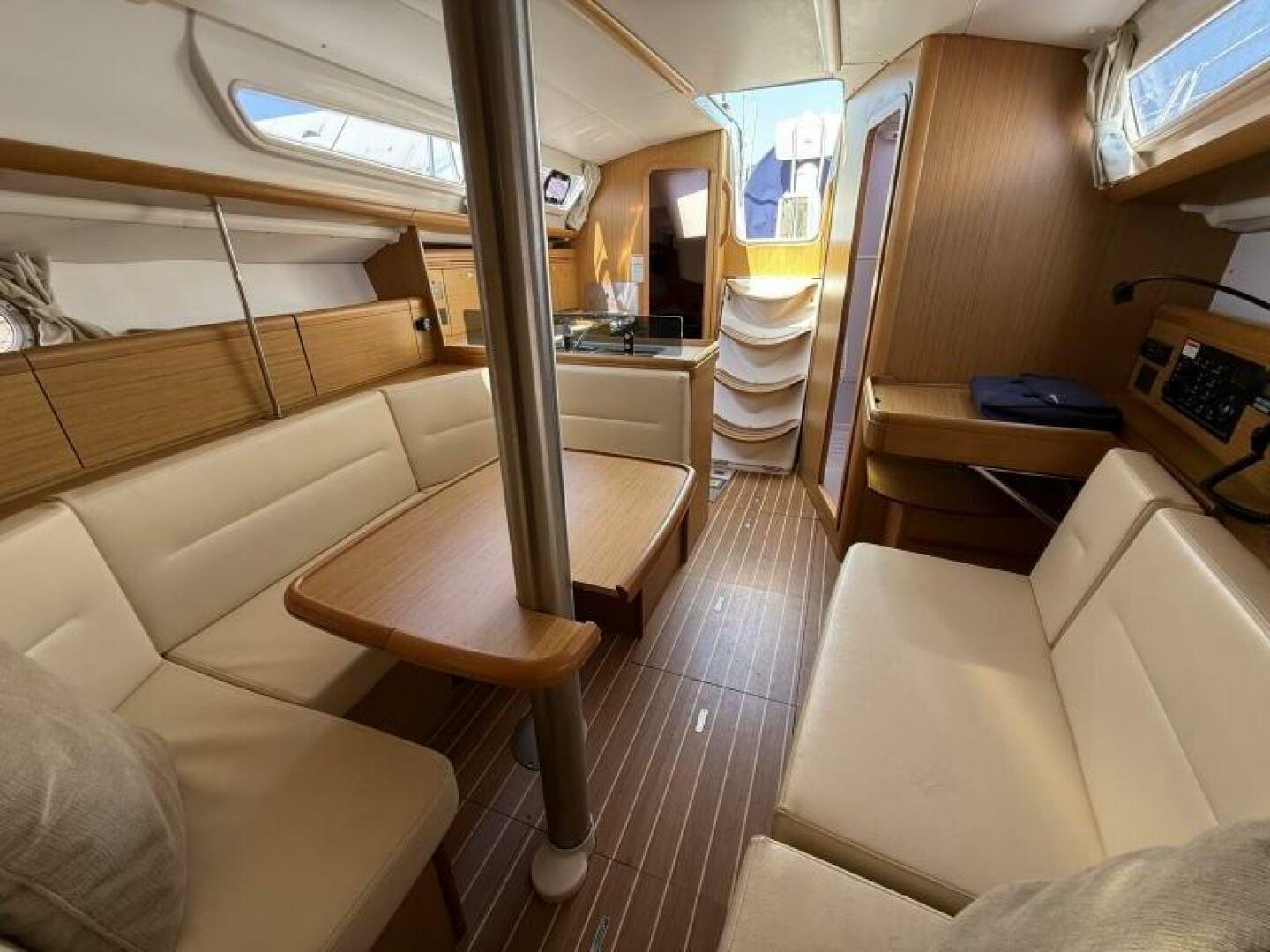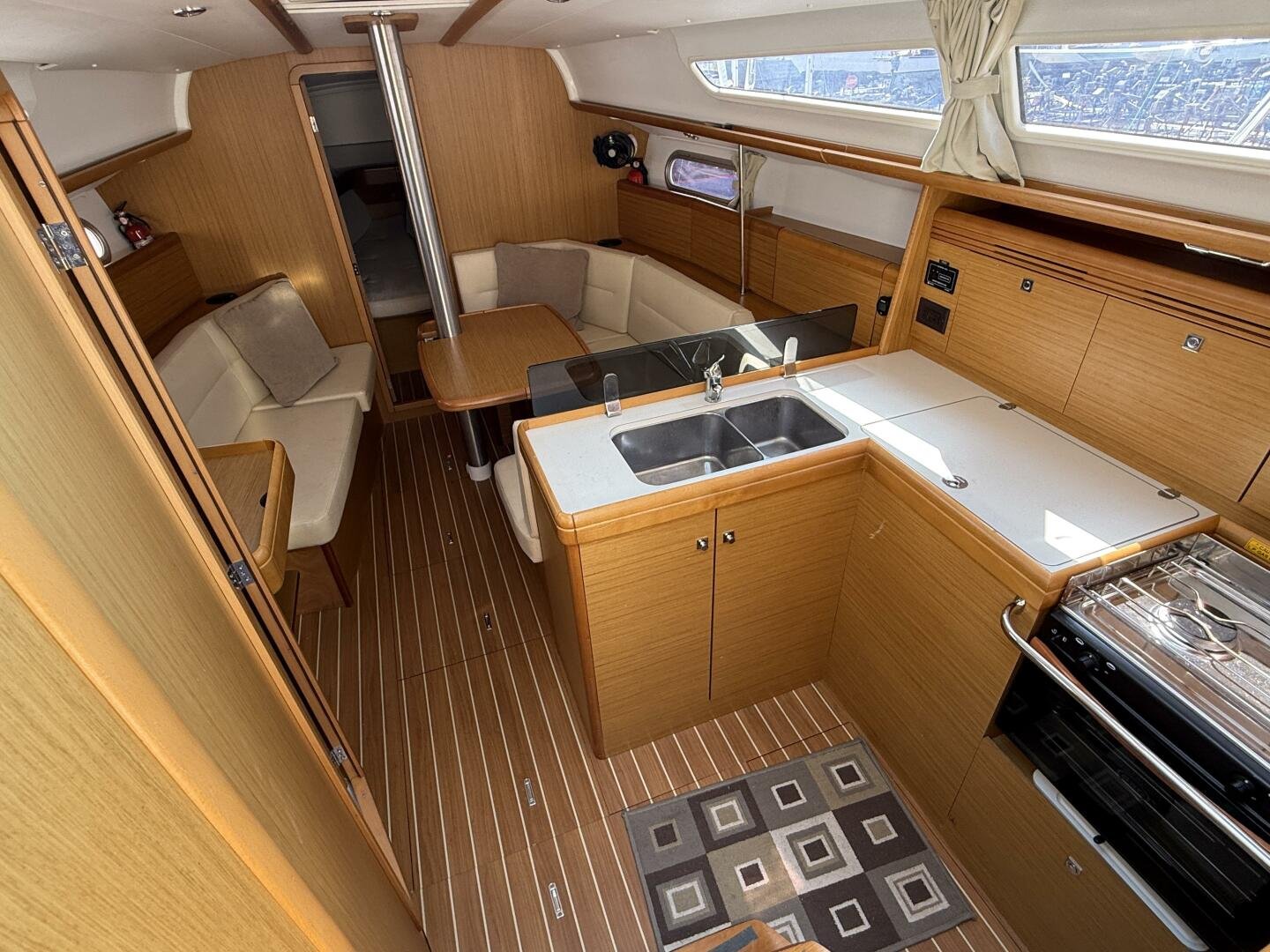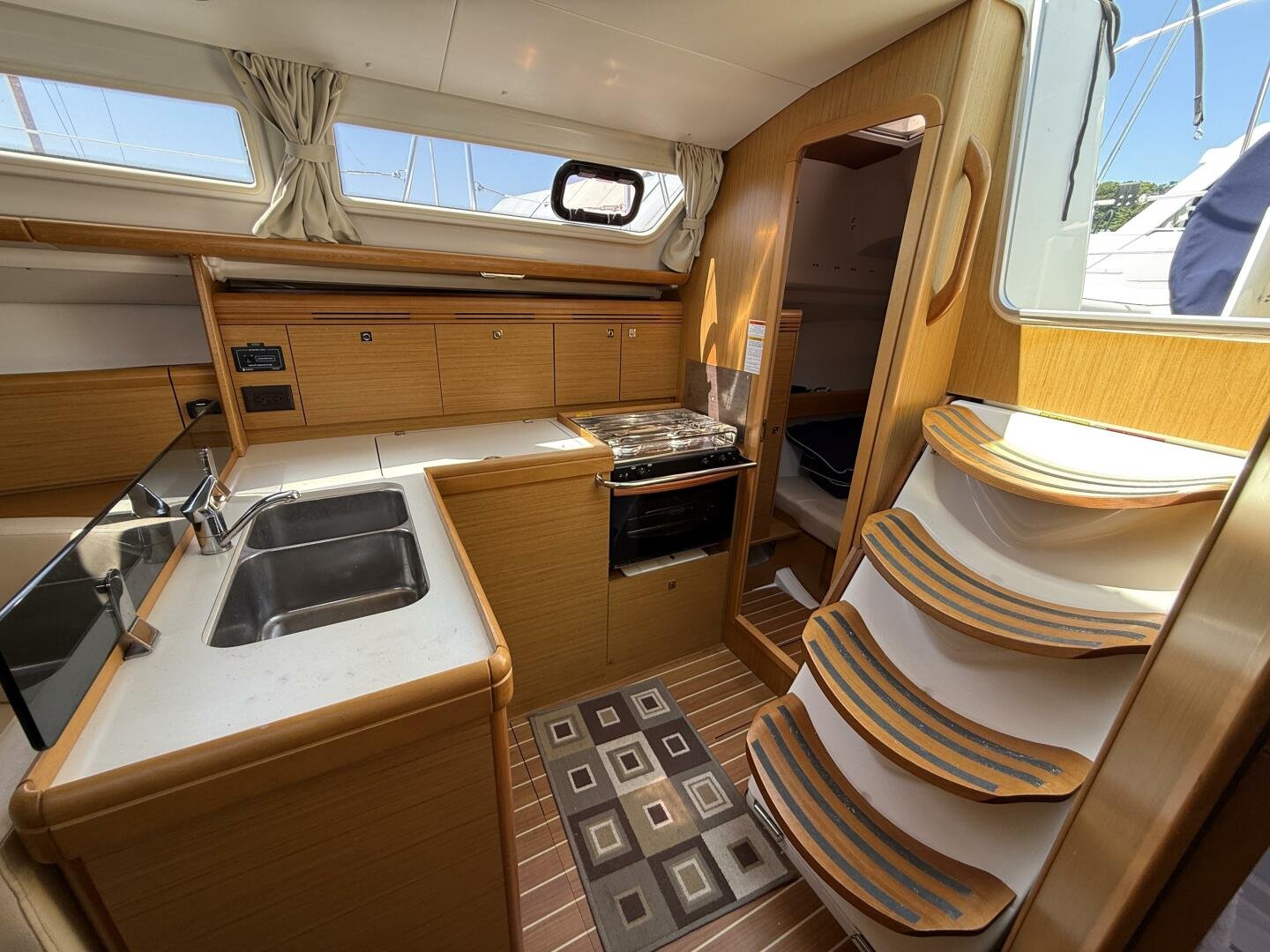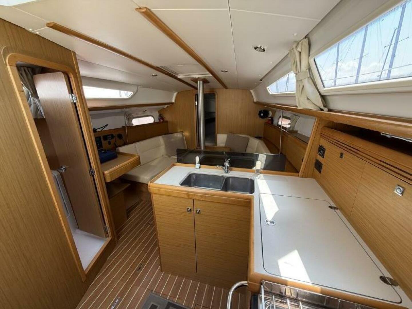 Below deck, you’ll find a bright and spacious interior finished in quality joinery, with ample natural light from the large portlights and hatches. The well-appointed galley features a stove/oven, fridge, and generous storage. The salon offers a comfortable seating area with a folding table, while the private cabins provide inviting accommodations for extended cruising.