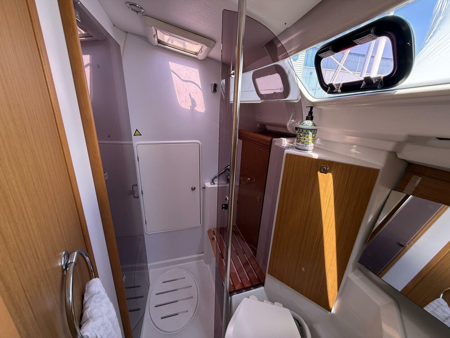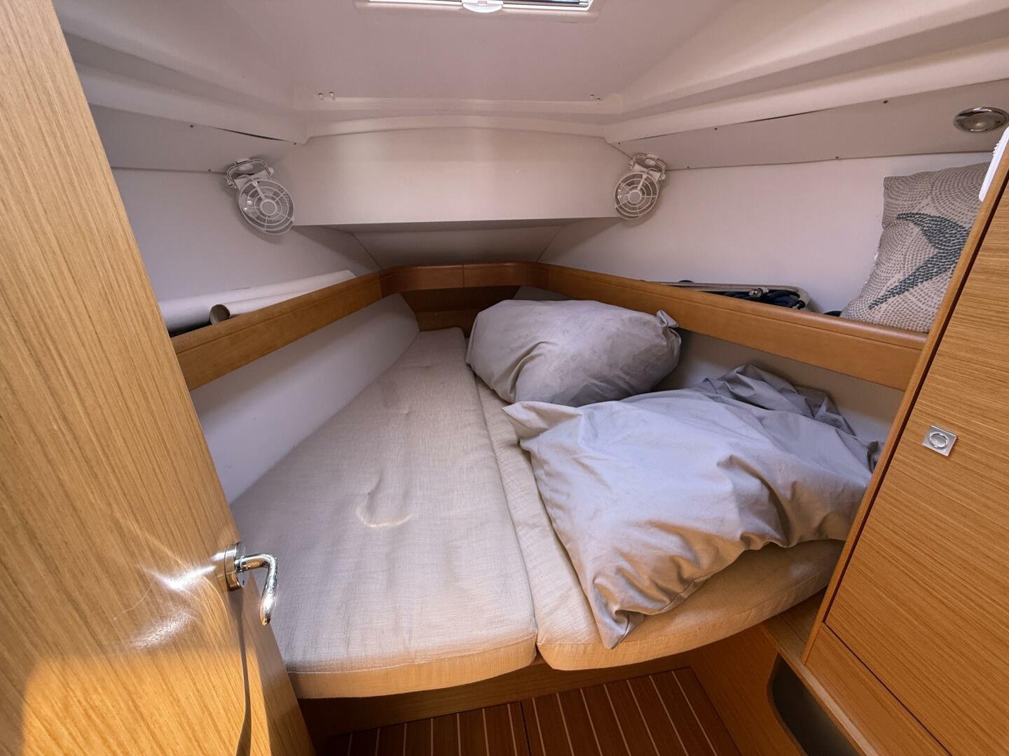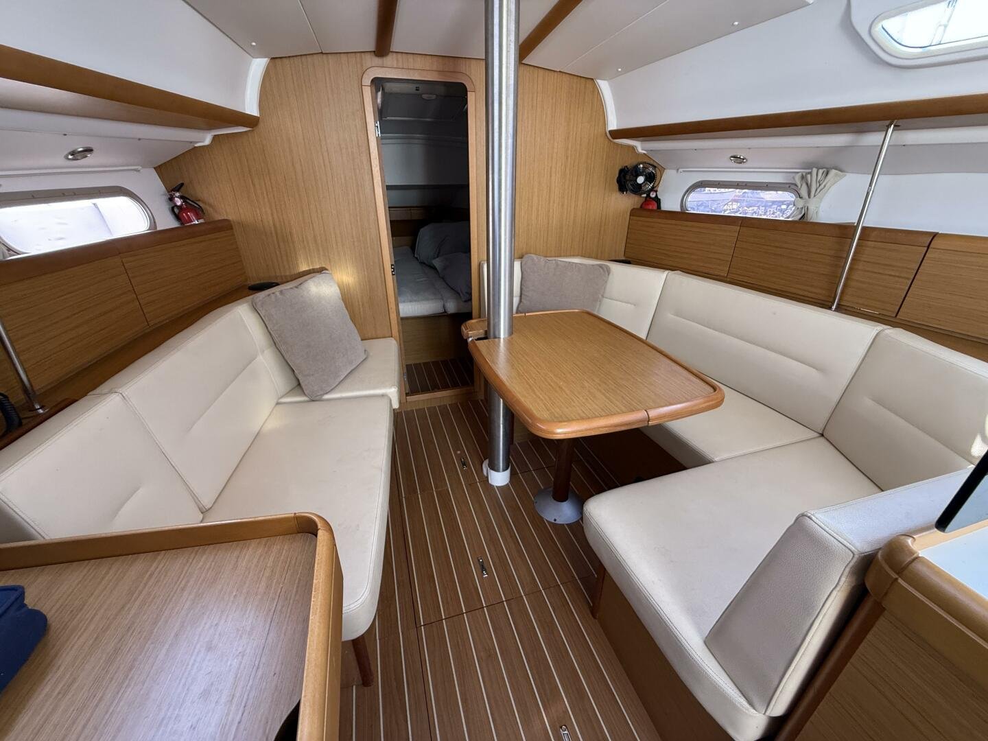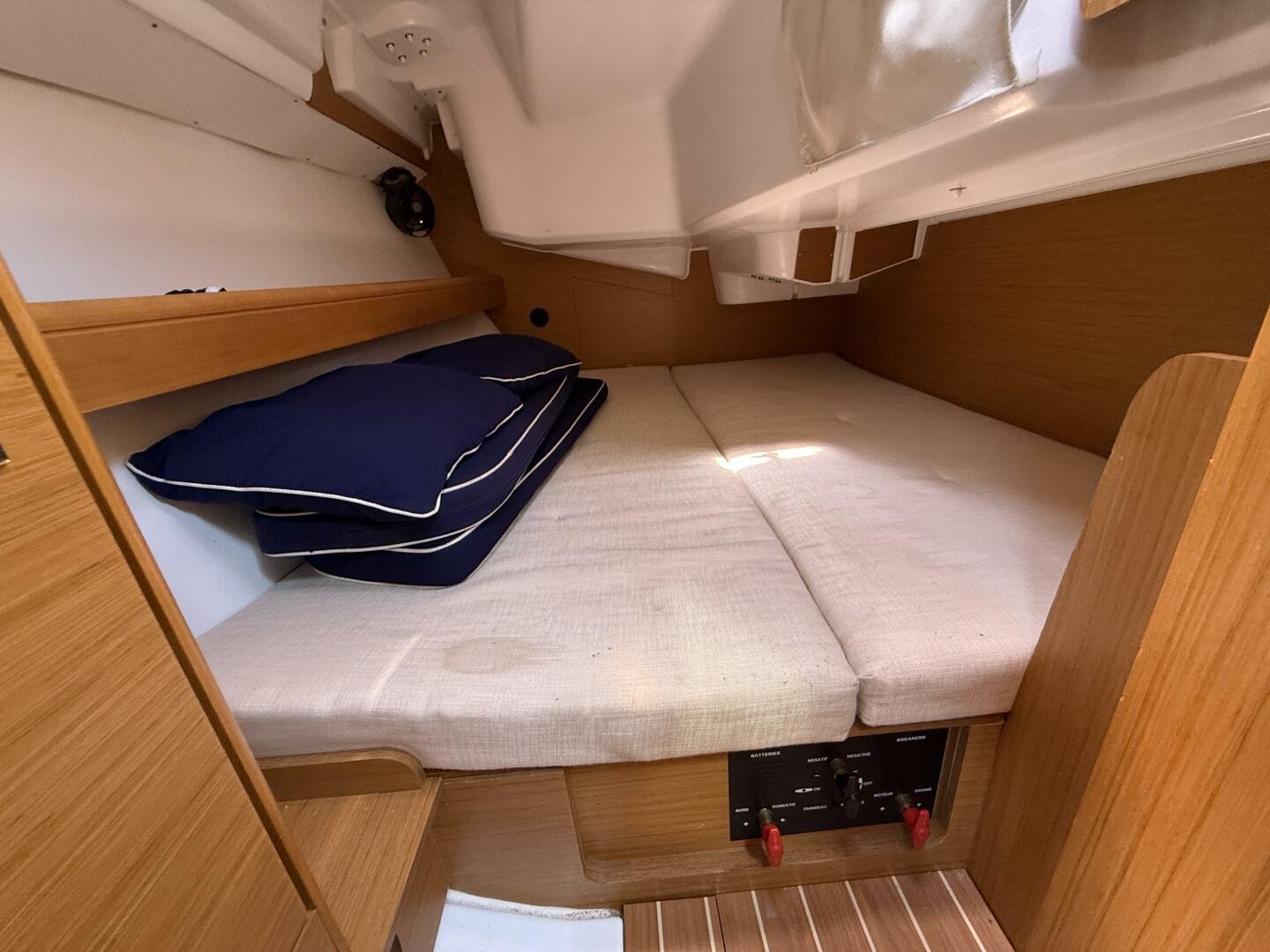 Below deck, you’ll find a bright and spacious interior finished in quality joinery, with ample natural light from the large portlights and hatches. The well-appointed galley features a stove/oven, fridge, and generous storage. The salon offers a comfortable seating area with a folding table, while the private cabins provide inviting accommodations for extended cruising.