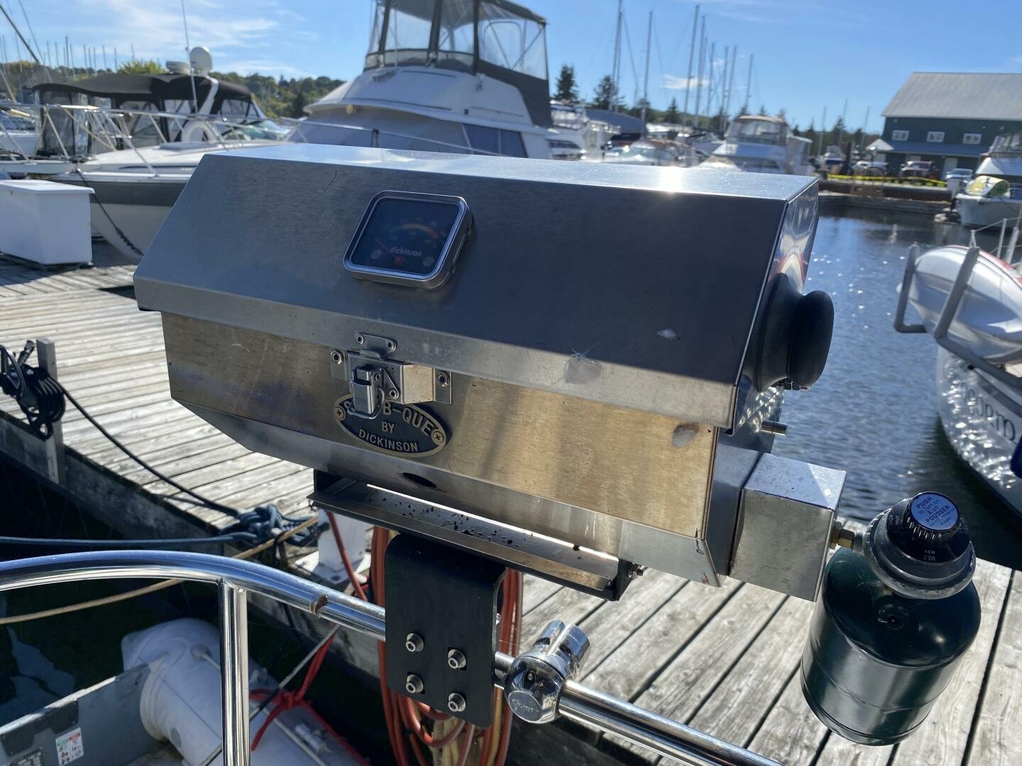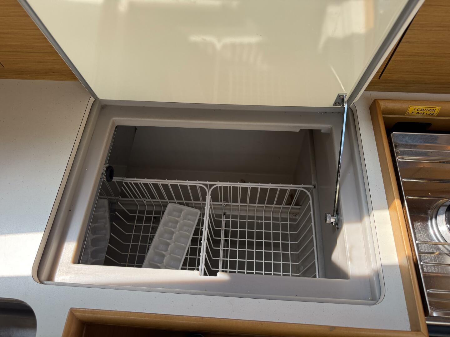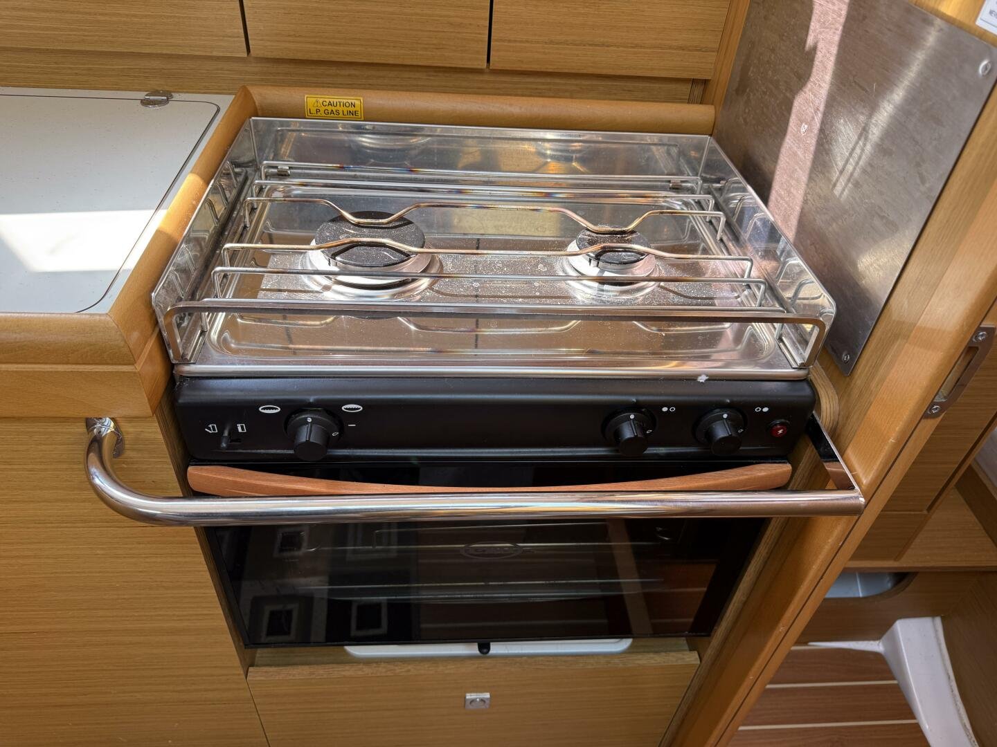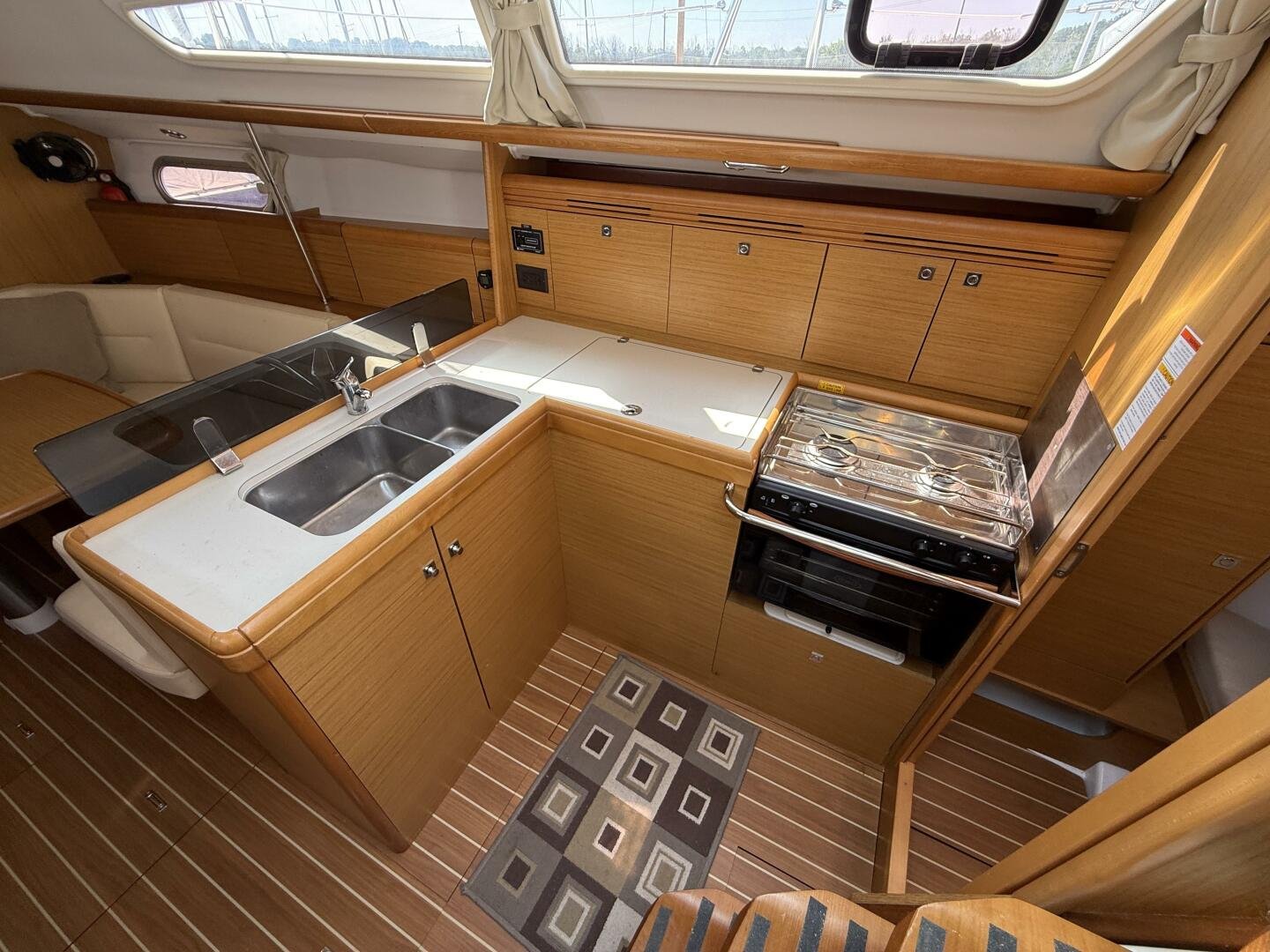 - Well-equipped galley with propane stove/oven and top-loading fridge