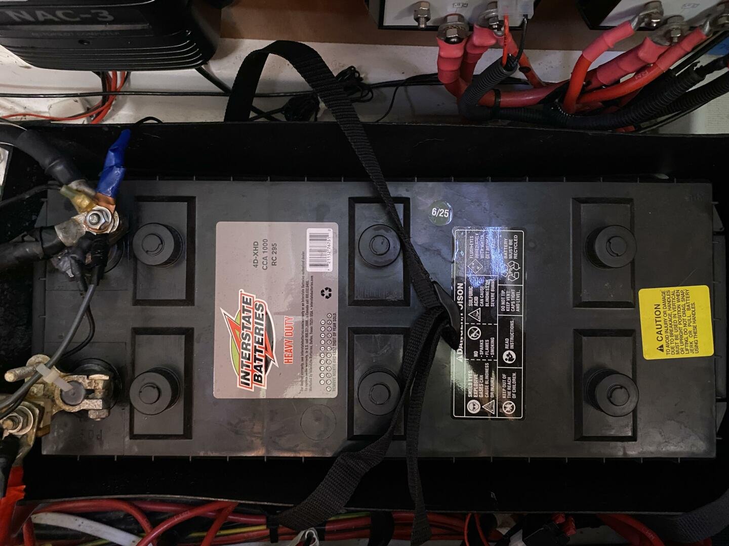 • Batteries: 3 Interstate House batteries (3 x 4D-XHD, class 8) [new 2025], 1 forward bow-thruster/windlass battery, 1 engine battery