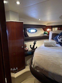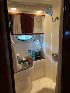 Accommodations include two private staterooms with closing doors, along with a separate head and dedicated shower stall, offering a practical and comfortable layout for extended time aboard.