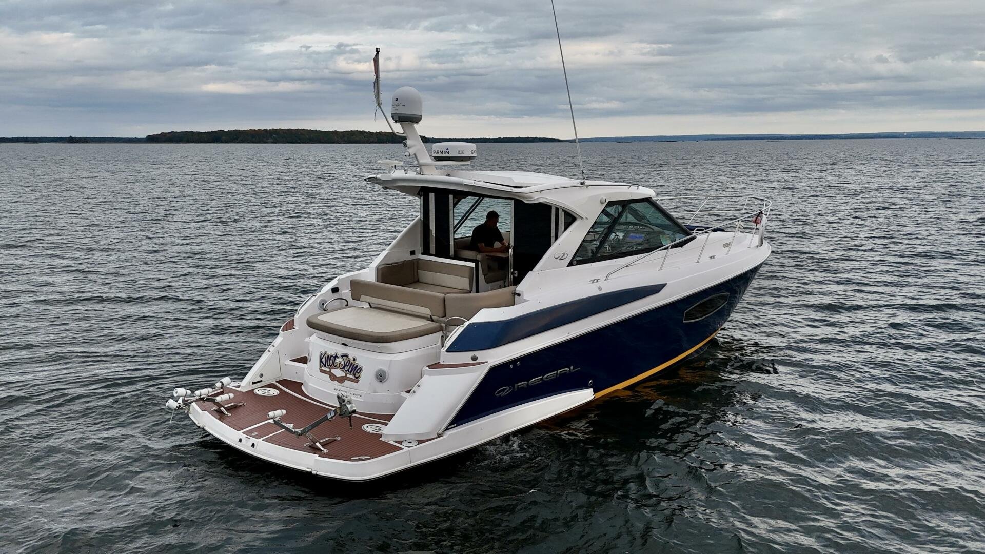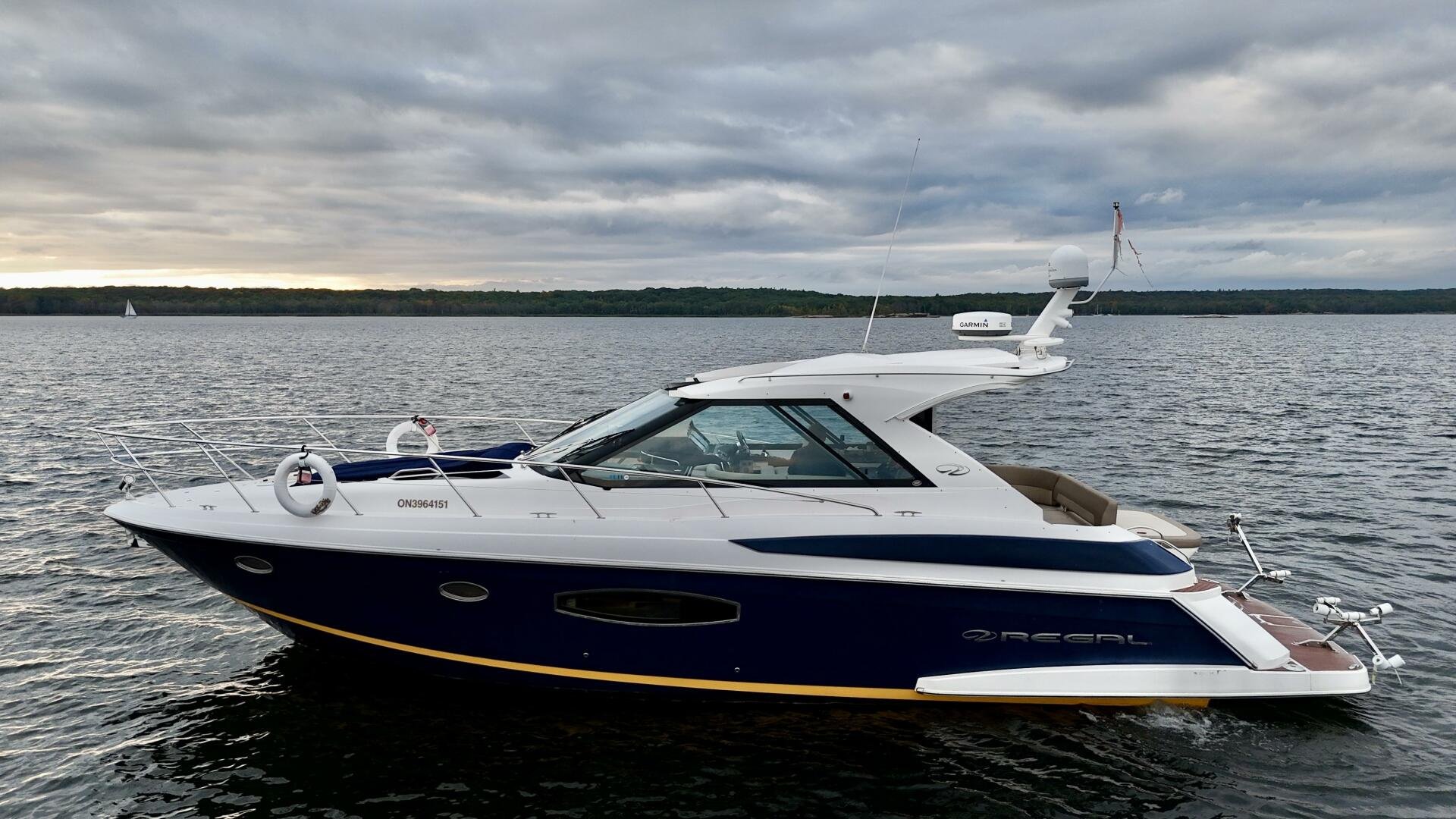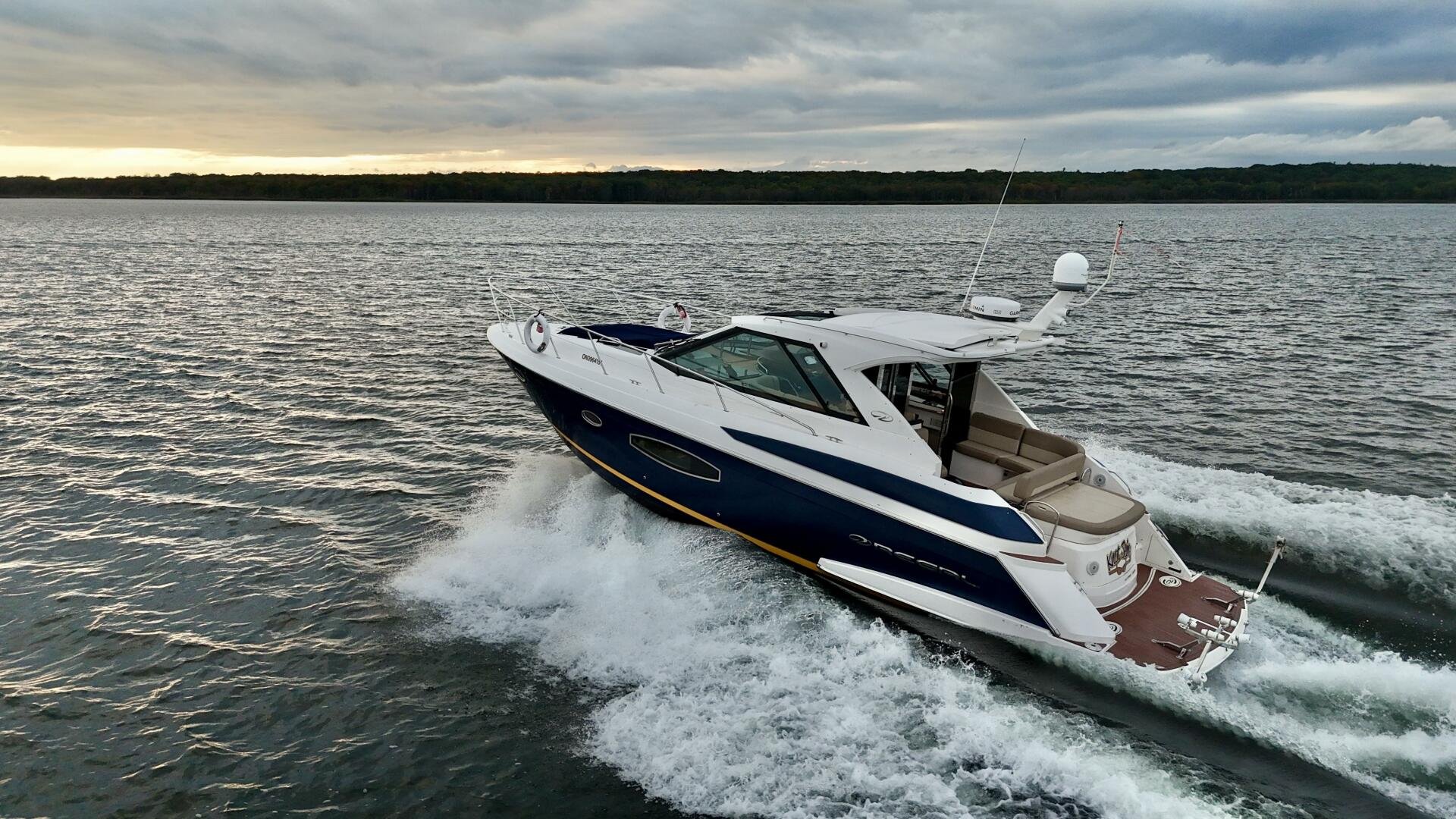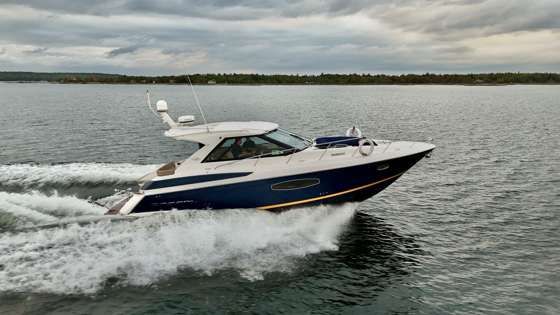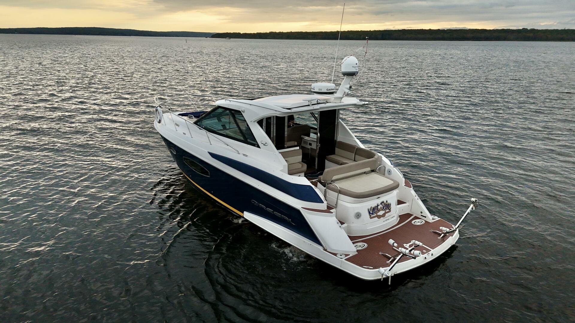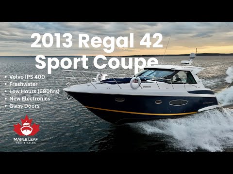 A cutting-edge design when she was introduced in 2011, the Regal 42 Sport Coupe is a sleek Eurostyle express designed for cruising in comfort and style. The full-beam convertible hardtop electrically slides back from the windshield frame to reveal an enormous opening, and sliding glass door and windows convert open aft to give the boat an open feel, with the option to be enclosed with air conditioning. Below deck, the two-stateroom two-head interior of the 42 Sport Coupe includes a private master stateroom forward with an island queen berth. The mid-cabin stateroom features twin berths, an en-suite head, and a pocket door for added privacy. A U-shaped sofa and full-service galley occupy the salon, which is notable for its full standing headroom. The cockpit can be accessed from both sides of the extended swim platform, and the center section of the deck lifts for access to the engines. Unlike some manufacturers of this era who installed pod drives in hulls originally designed for inboard power, Regal engineers designed the hull of the 42 Sport Coupe specifically for Volvo IPS pod drives.