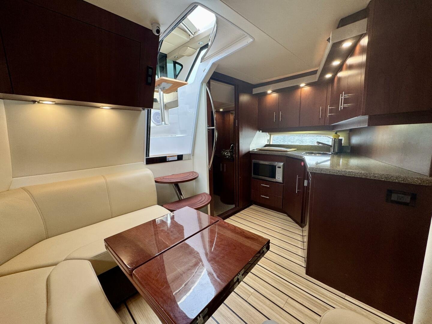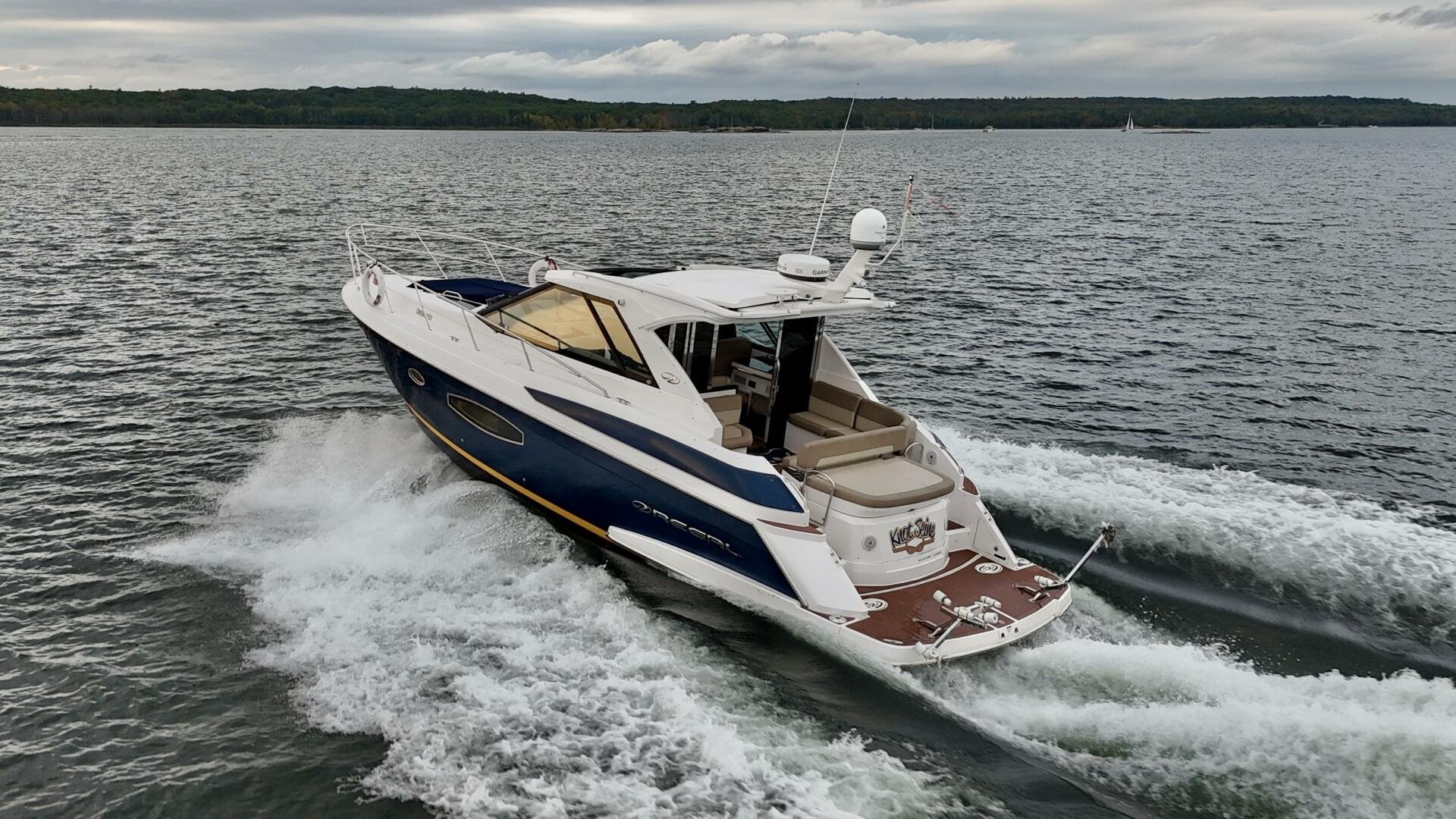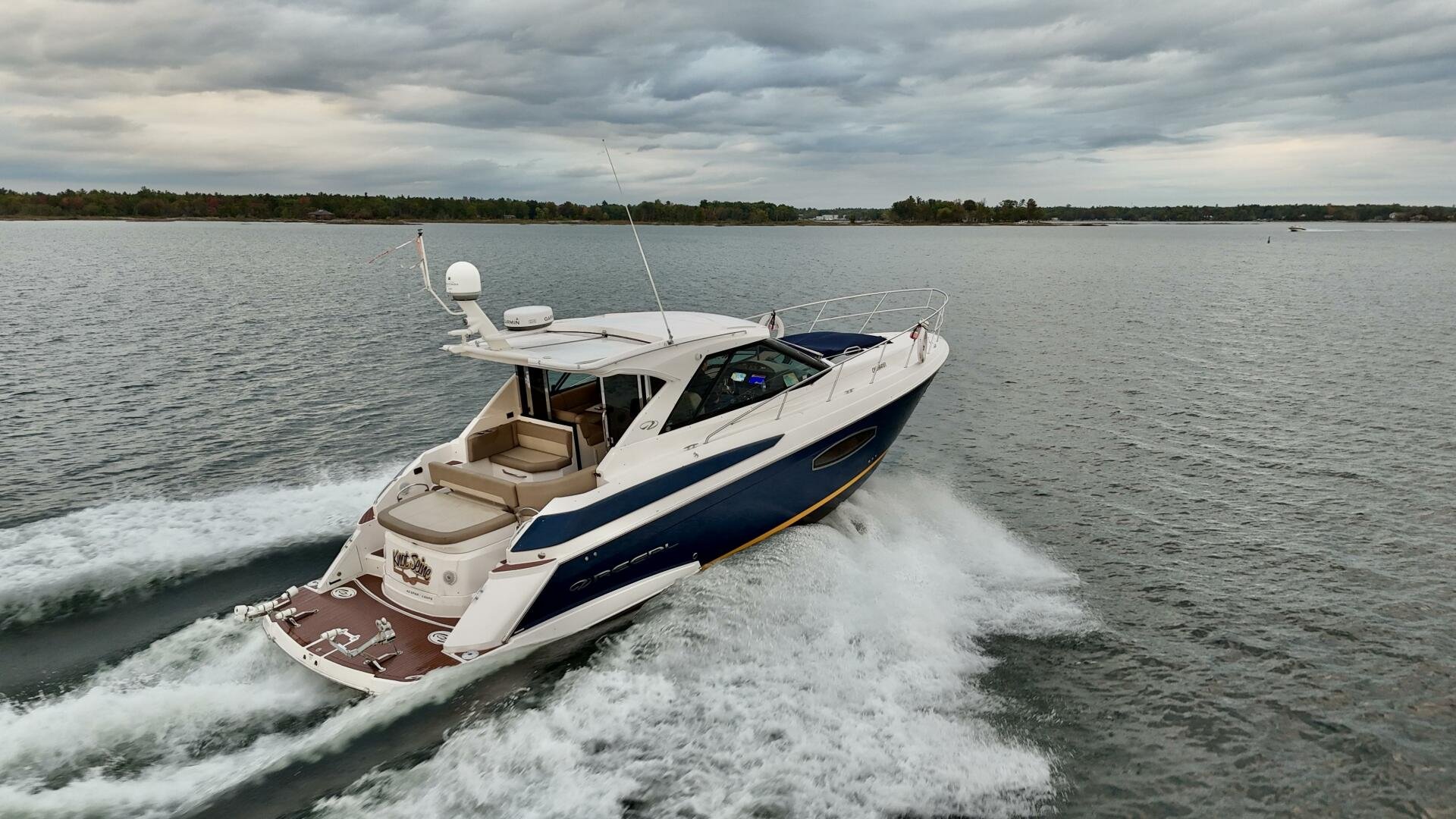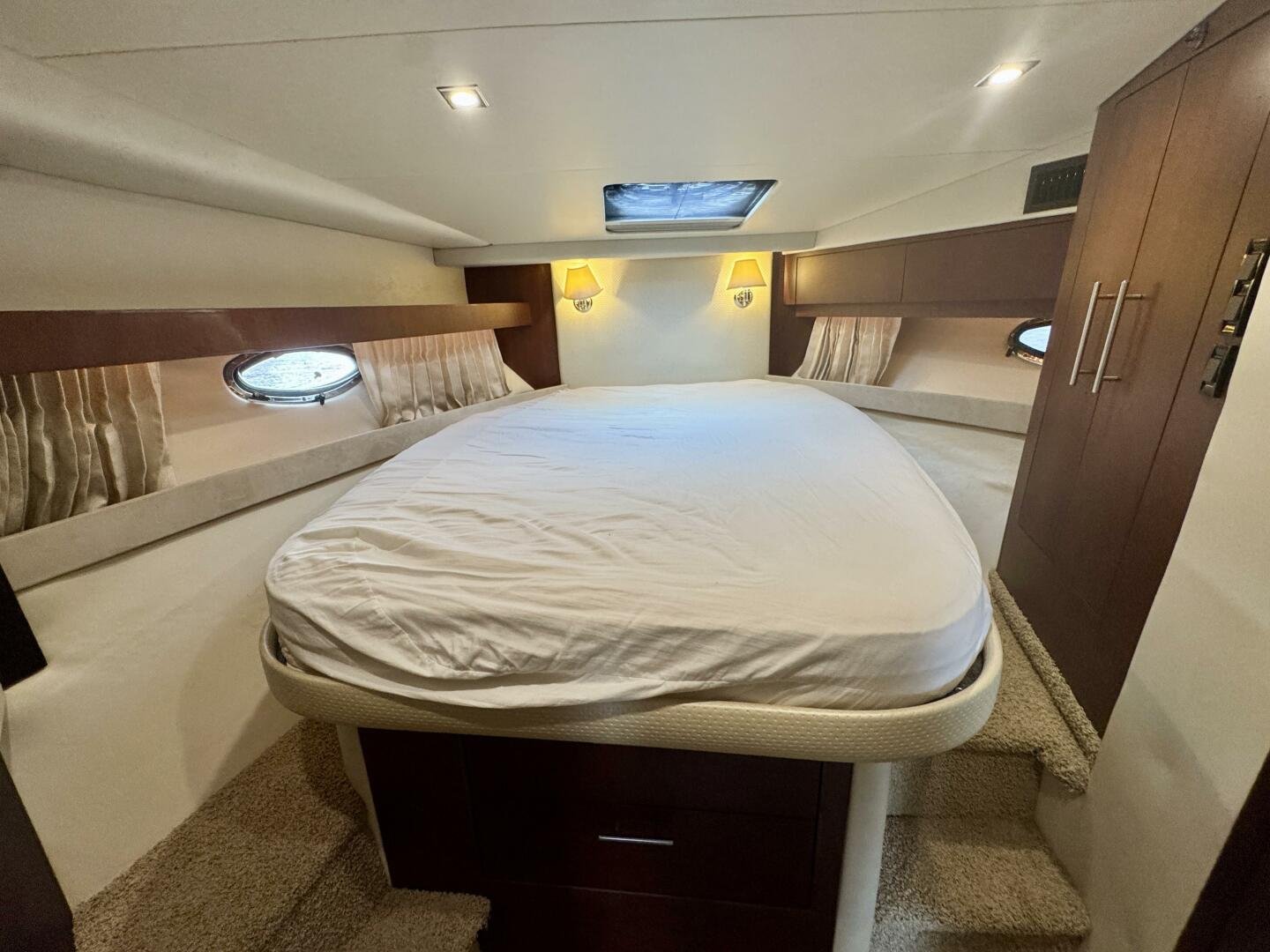 A cutting-edge design when she was introduced in 2011, the Regal 42 Sport Coupe is a sleek Eurostyle express designed for cruising in comfort and style. The full-beam convertible hardtop electrically slides back from the windshield frame to reveal an enormous opening, and sliding glass door and windows convert open aft to give the boat an open feel, with the option to be enclosed with air conditioning. Below deck, the two-stateroom two-head interior of the 42 Sport Coupe includes a private master stateroom forward with an island queen berth. The mid-cabin stateroom features twin berths, an en-suite head, and a pocket door for added privacy. A U-shaped sofa and full-service galley occupy the salon, which is notable for its full standing headroom. The cockpit can be accessed from both sides of the extended swim platform, and the center section of the deck lifts for access to the engines. Unlike some manufacturers of this era who installed pod drives in hulls originally designed for inboard power, Regal engineers designed the hull of the 42 Sport Coupe specifically for Volvo IPS pod drives.