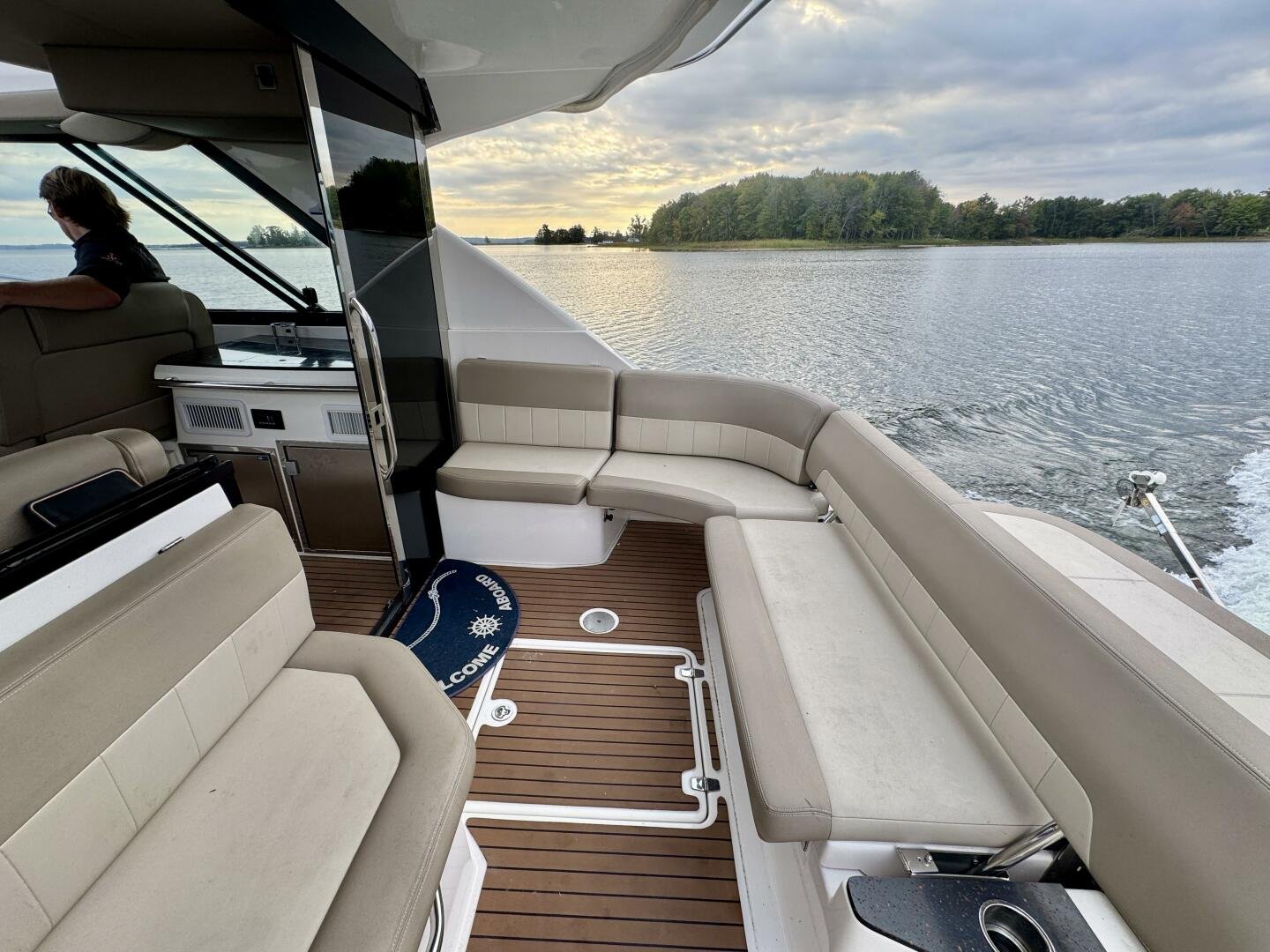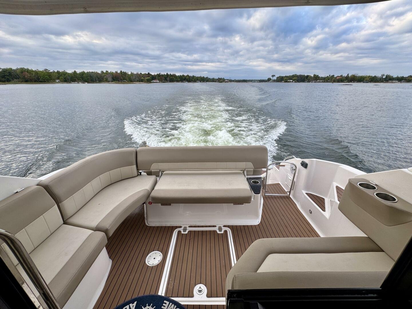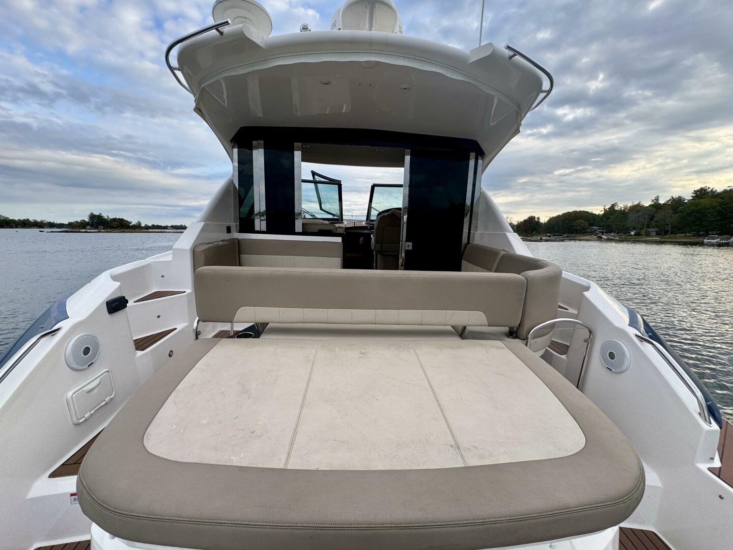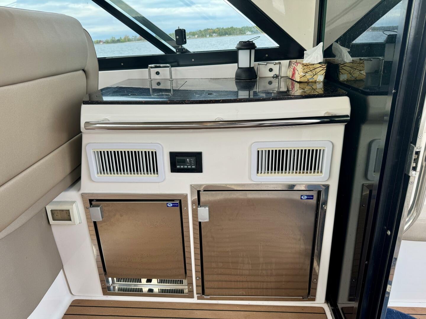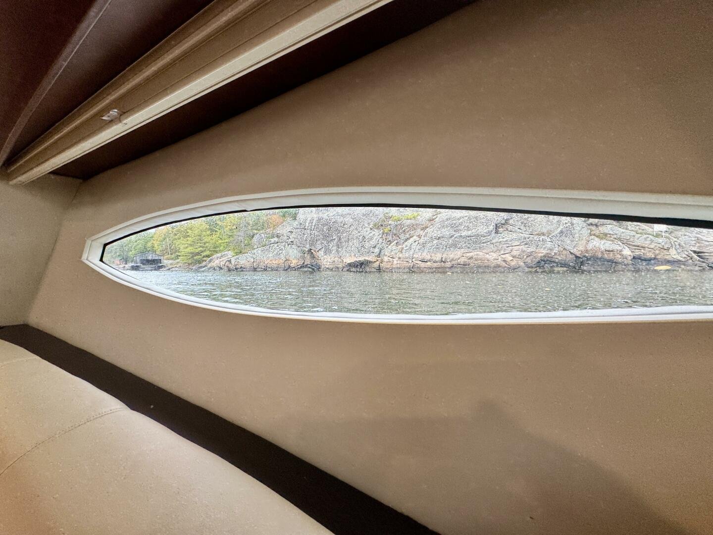 A cutting-edge design when she was introduced in 2011, the Regal 42 Sport Coupe is a sleek Eurostyle express designed for cruising in comfort and style. The full-beam convertible hardtop electrically slides back from the windshield frame to reveal an enormous opening, and sliding glass door and windows convert open aft to give the boat an open feel, with the option to be enclosed with air conditioning. Below deck, the two-stateroom two-head interior of the 42 Sport Coupe includes a private master stateroom forward with an island queen berth. The mid-cabin stateroom features twin berths, an en-suite head, and a pocket door for added privacy. A U-shaped sofa and full-service galley occupy the salon, which is notable for its full standing headroom. The cockpit can be accessed from both sides of the extended swim platform, and the center section of the deck lifts for access to the engines. Unlike some manufacturers of this era who installed pod drives in hulls originally designed for inboard power, Regal engineers designed the hull of the 42 Sport Coupe specifically for Volvo IPS pod drives.