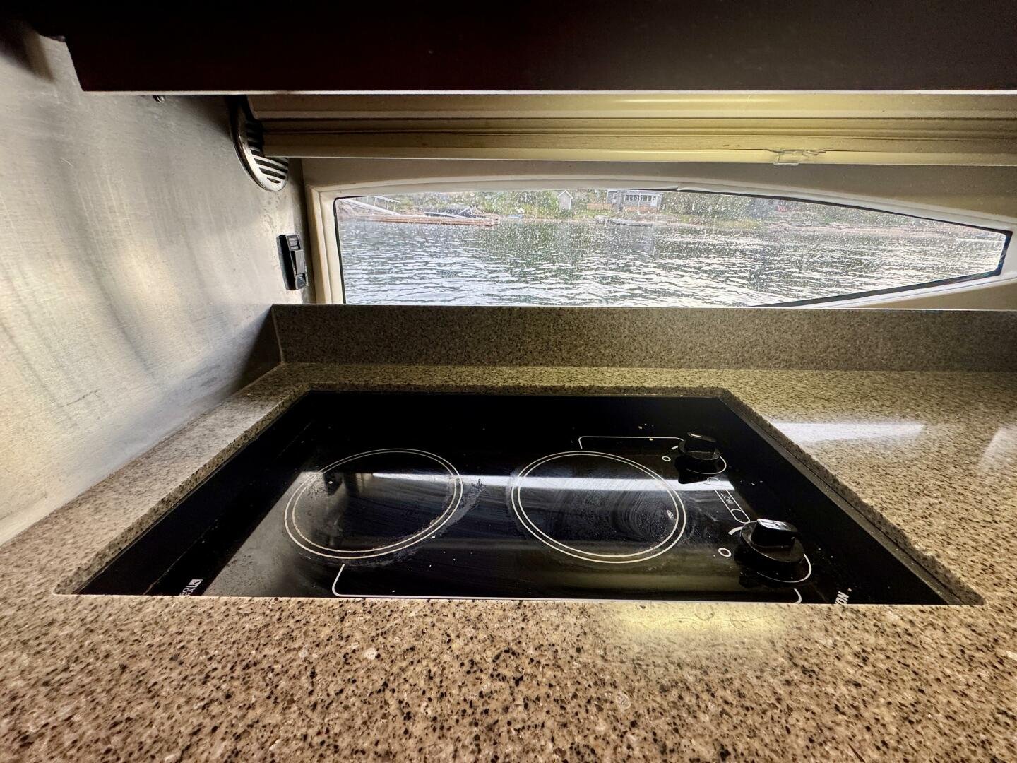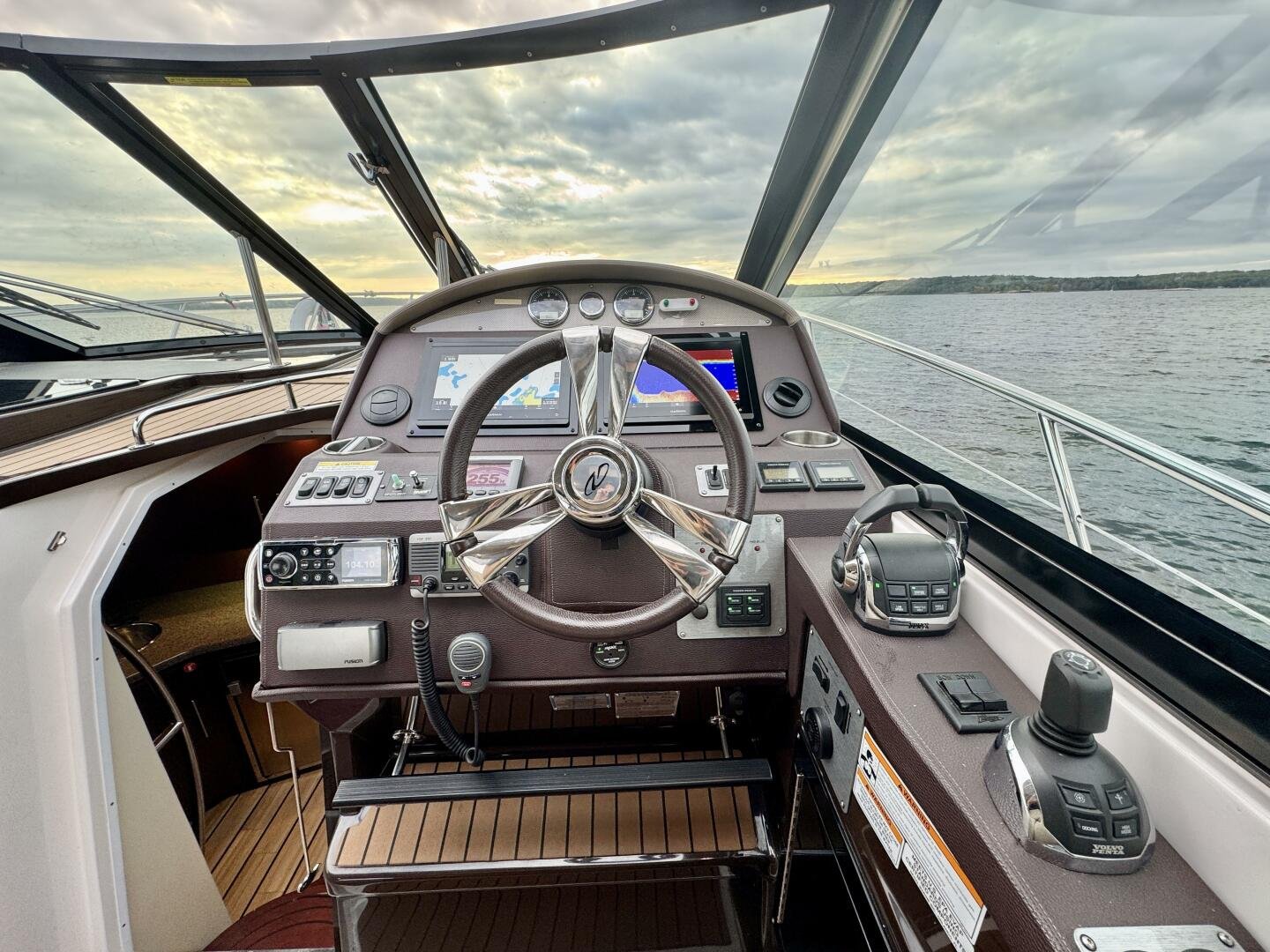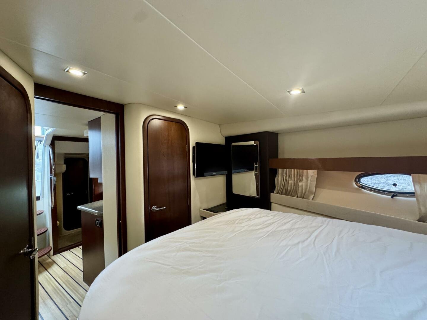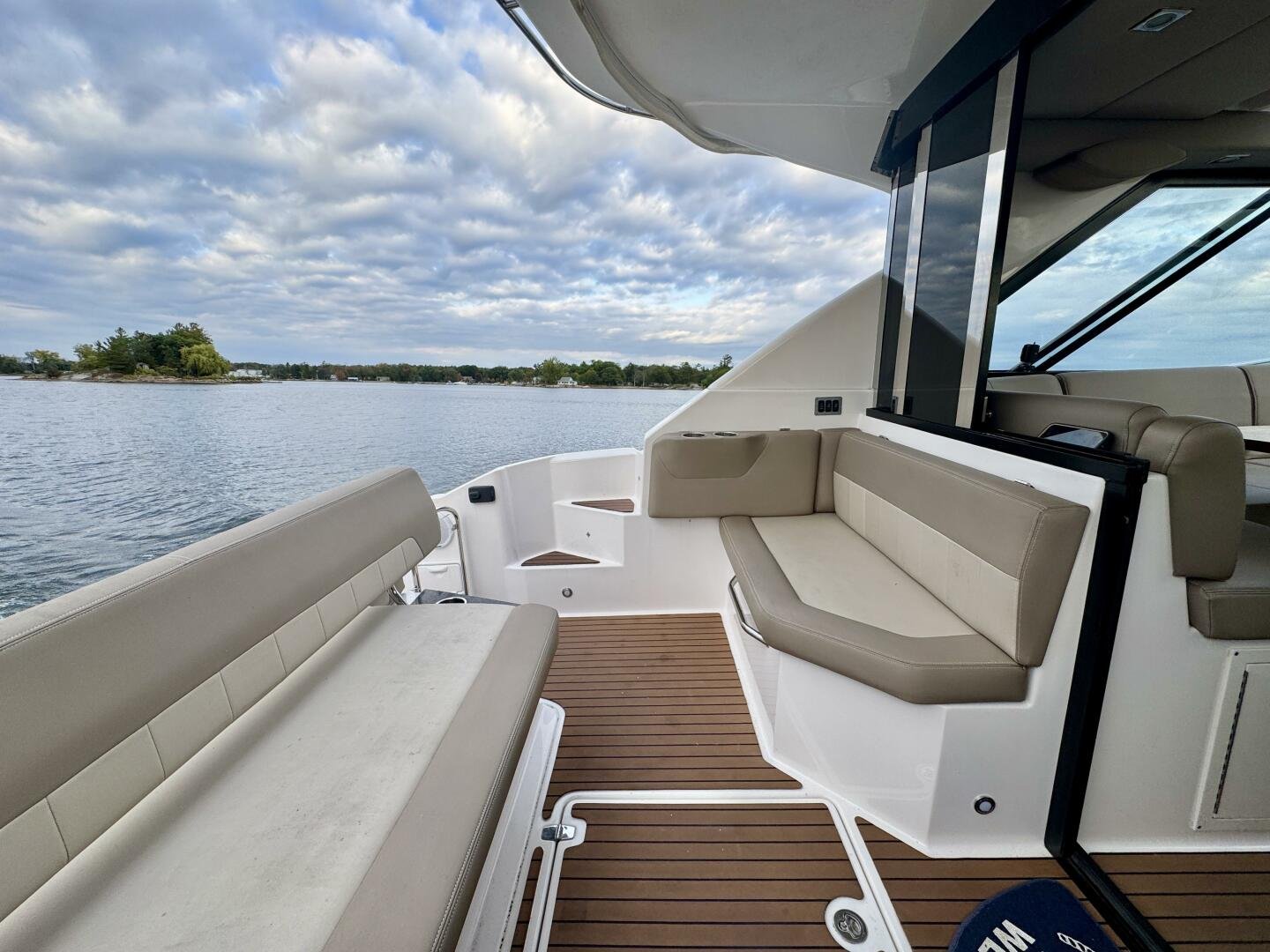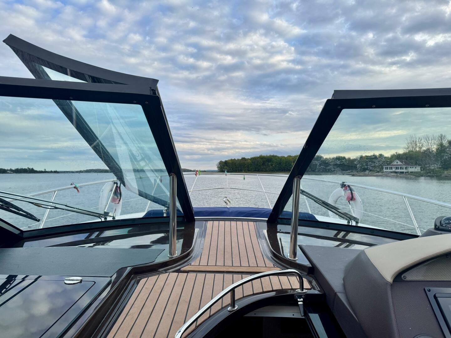 A cutting-edge design when she was introduced in 2011, the Regal 42 Sport Coupe is a sleek Eurostyle express designed for cruising in comfort and style. The full-beam convertible hardtop electrically slides back from the windshield frame to reveal an enormous opening, and sliding glass door and windows convert open aft to give the boat an open feel, with the option to be enclosed with air conditioning. Below deck, the two-stateroom two-head interior of the 42 Sport Coupe includes a private master stateroom forward with an island queen berth. The mid-cabin stateroom features twin berths, an en-suite head, and a pocket door for added privacy. A U-shaped sofa and full-service galley occupy the salon, which is notable for its full standing headroom. The cockpit can be accessed from both sides of the extended swim platform, and the center section of the deck lifts for access to the engines. Unlike some manufacturers of this era who installed pod drives in hulls originally designed for inboard power, Regal engineers designed the hull of the 42 Sport Coupe specifically for Volvo IPS pod drives.