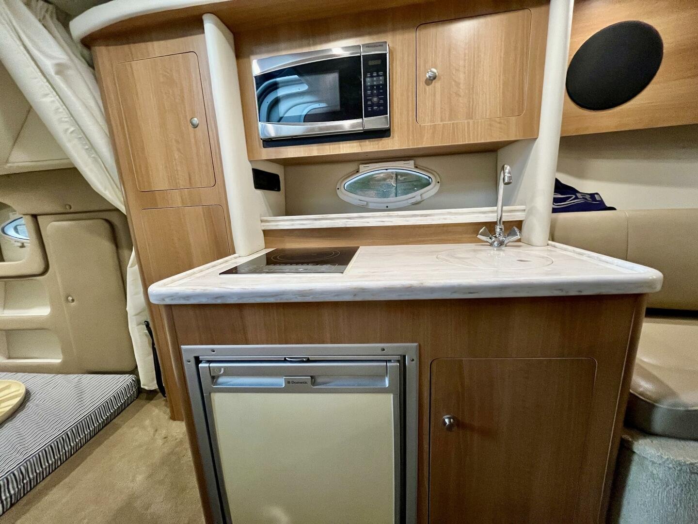 - Full Galley: Equipped with solid surface countertops, complemented by a well-appointed head with toilet, sink, and shower.