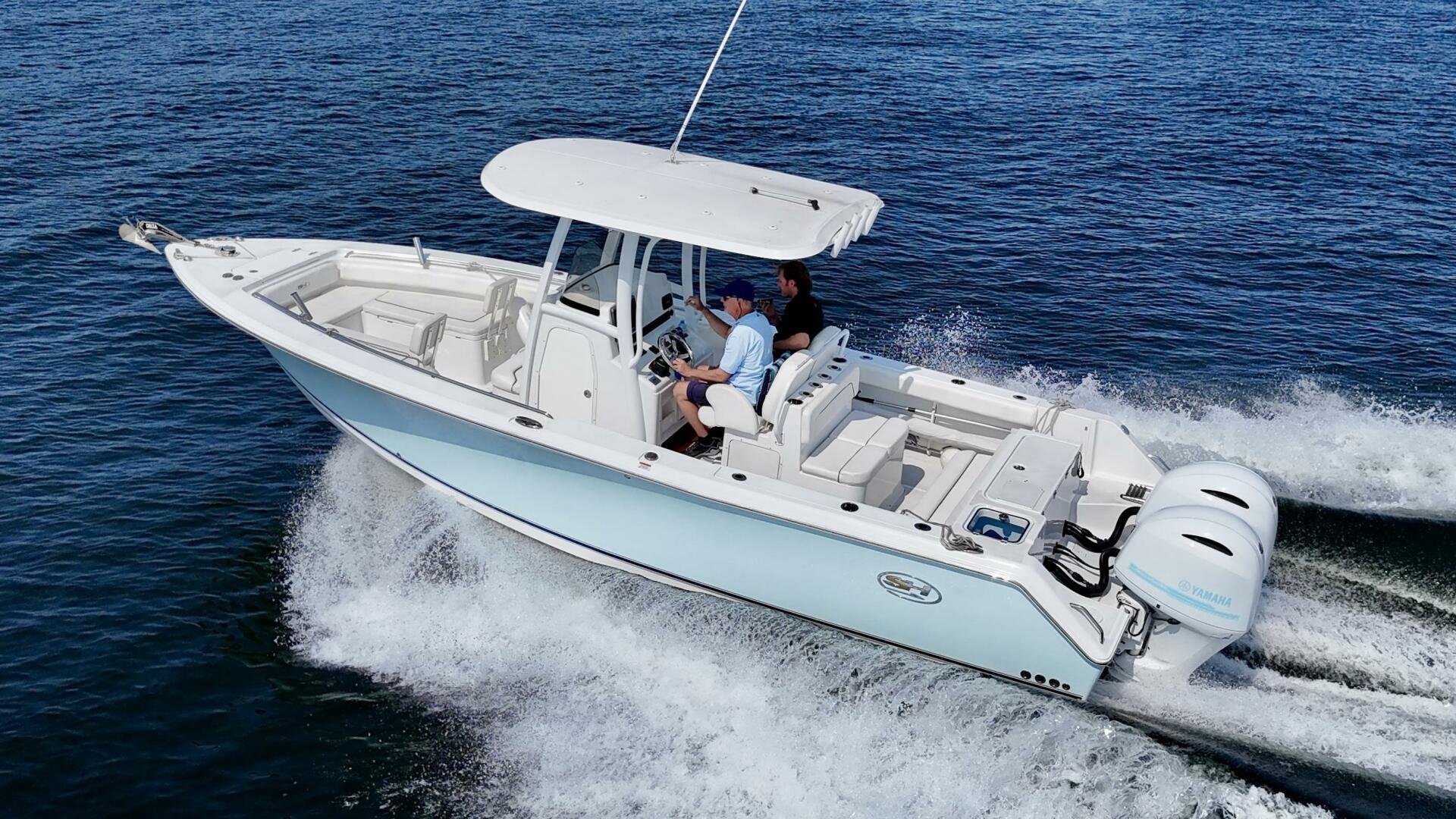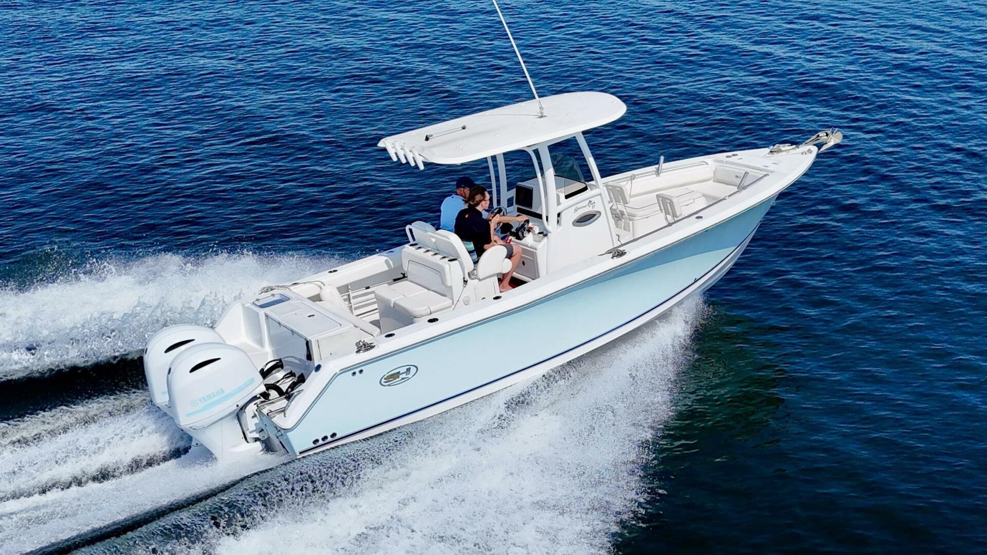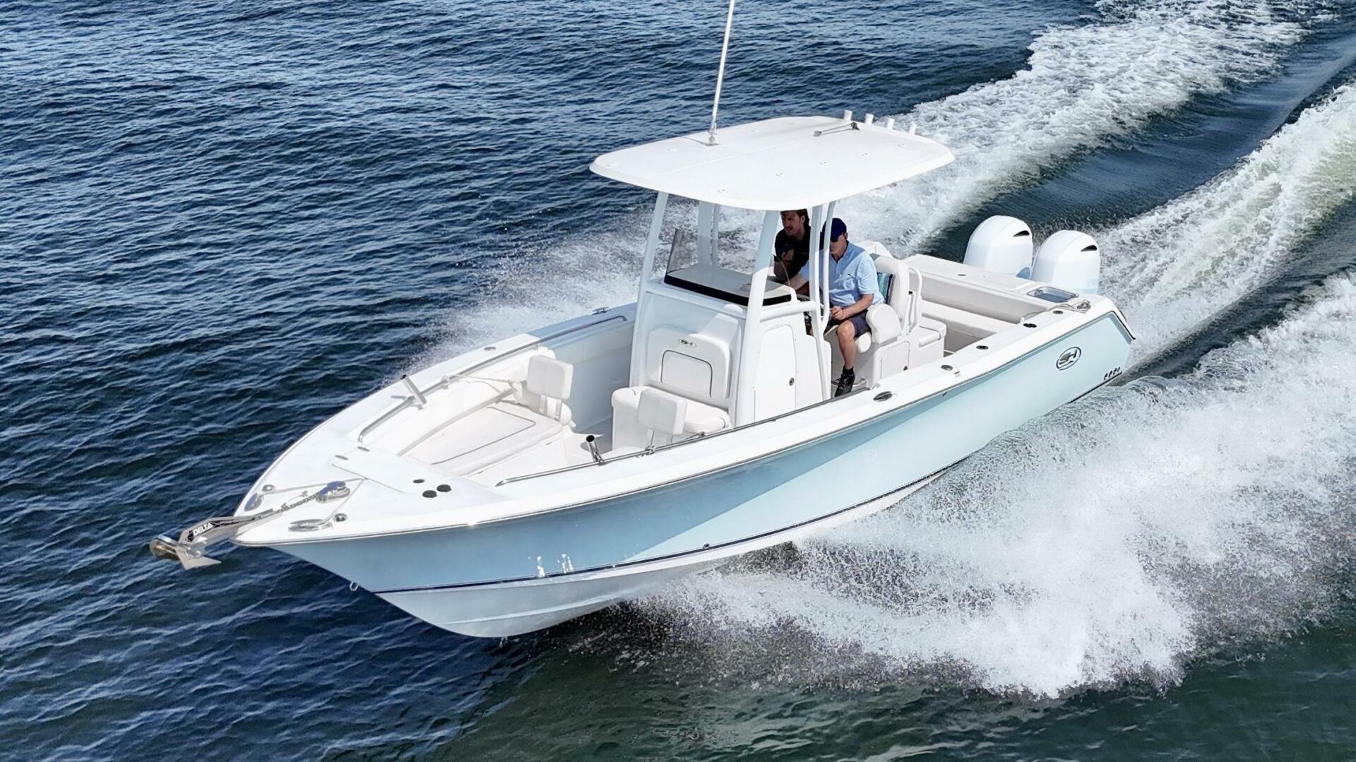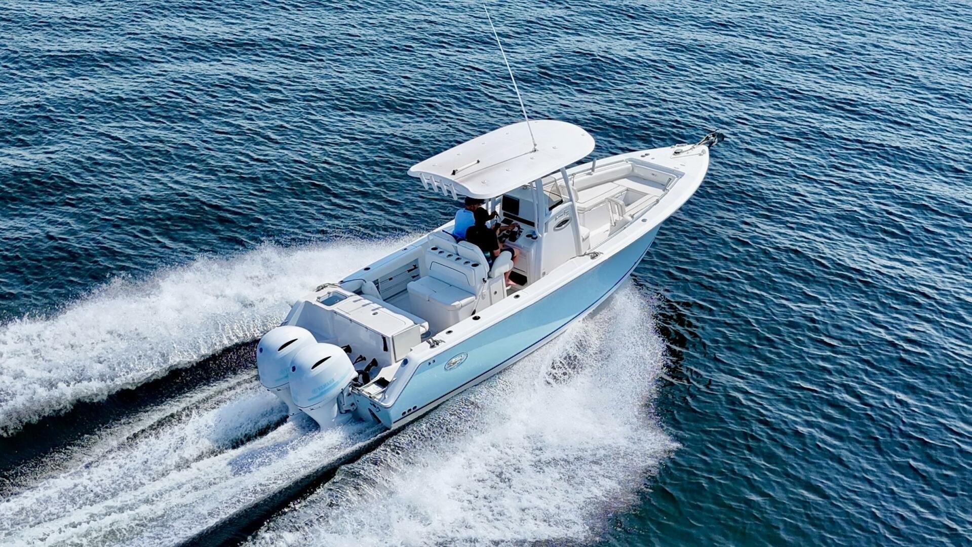 The ice blue hull finish is paired with custom white paint on the outboards + ice blue decals and looks great in the water. There is plenty of seating and sun coverage, with the bow filler cushion, rear bench seat, and aft sun shade.