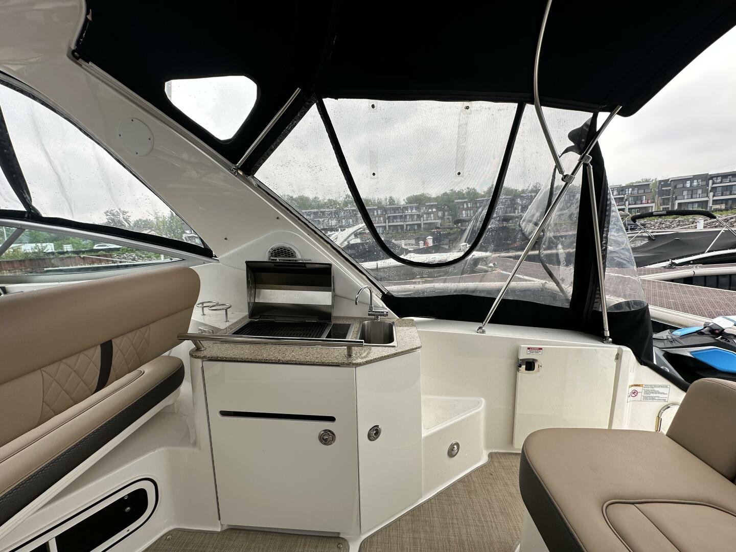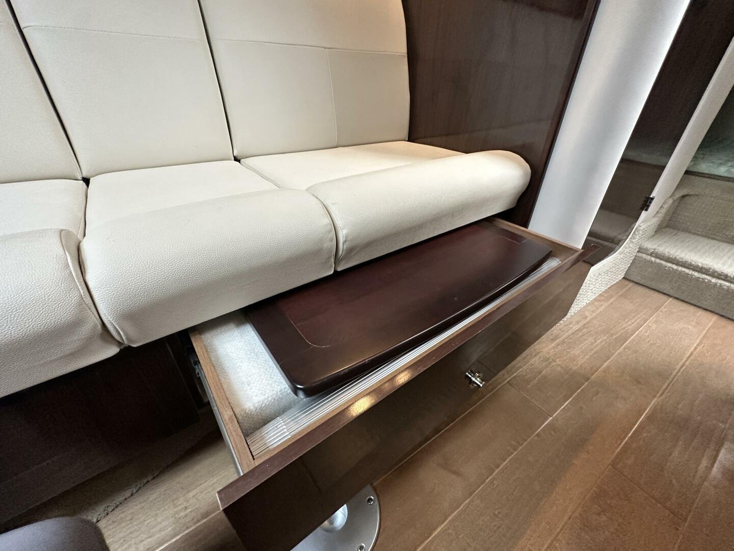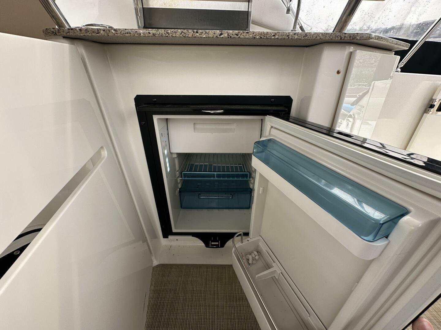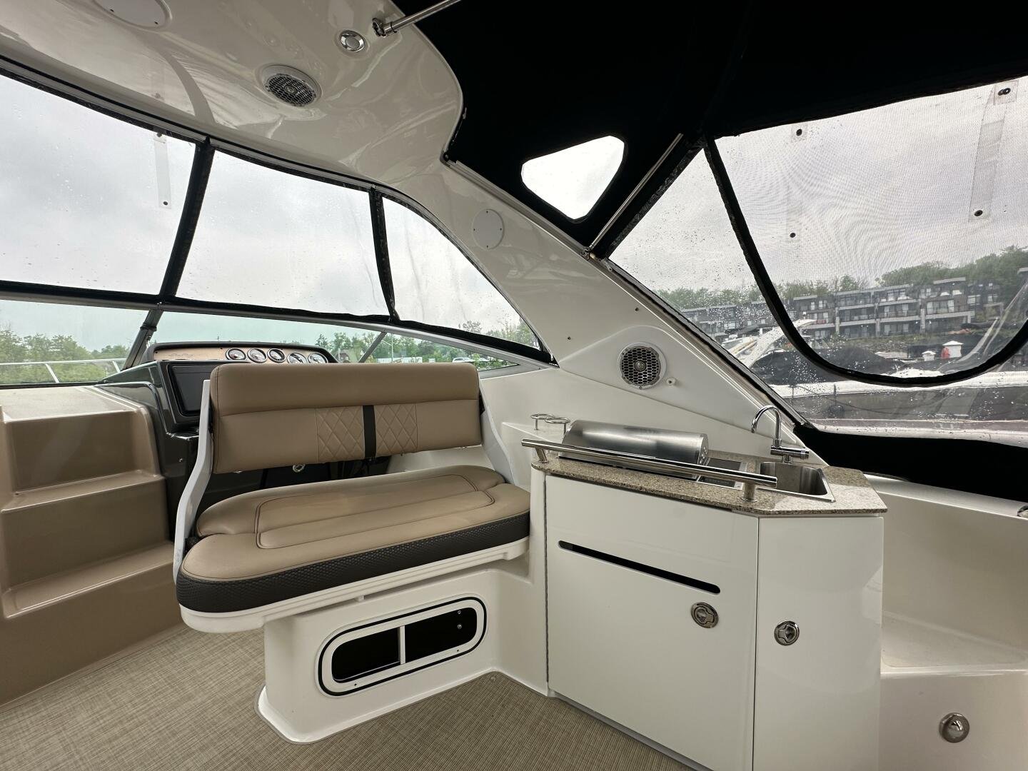 A spacious cockpit with luxurious wrap-around seating, Infiniti woven flooring (excellent condition), and a granite-top wet bar featuring: