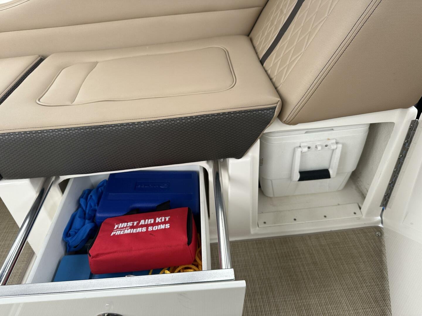 The cockpit seat swivels and includes flip-up bolsters, easily converting the layout into a relaxing lounge area with a cherry wood table. The stern bench folds flat into a sun lounge.