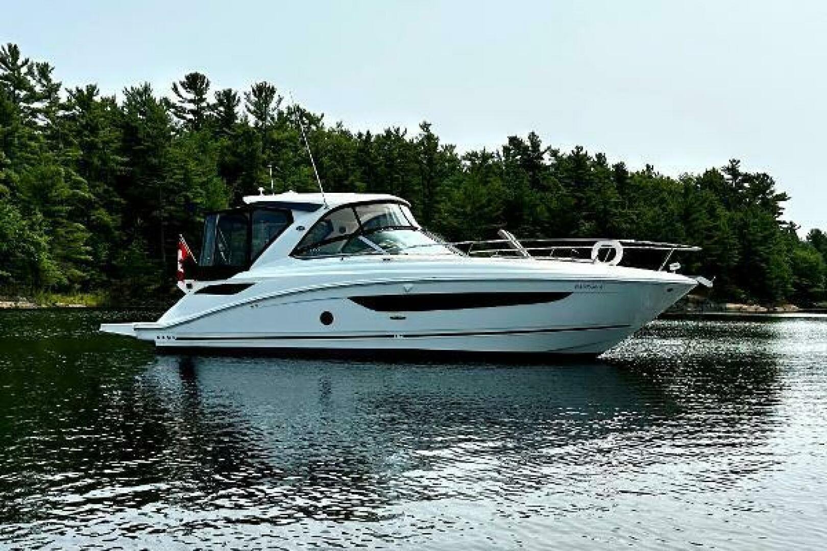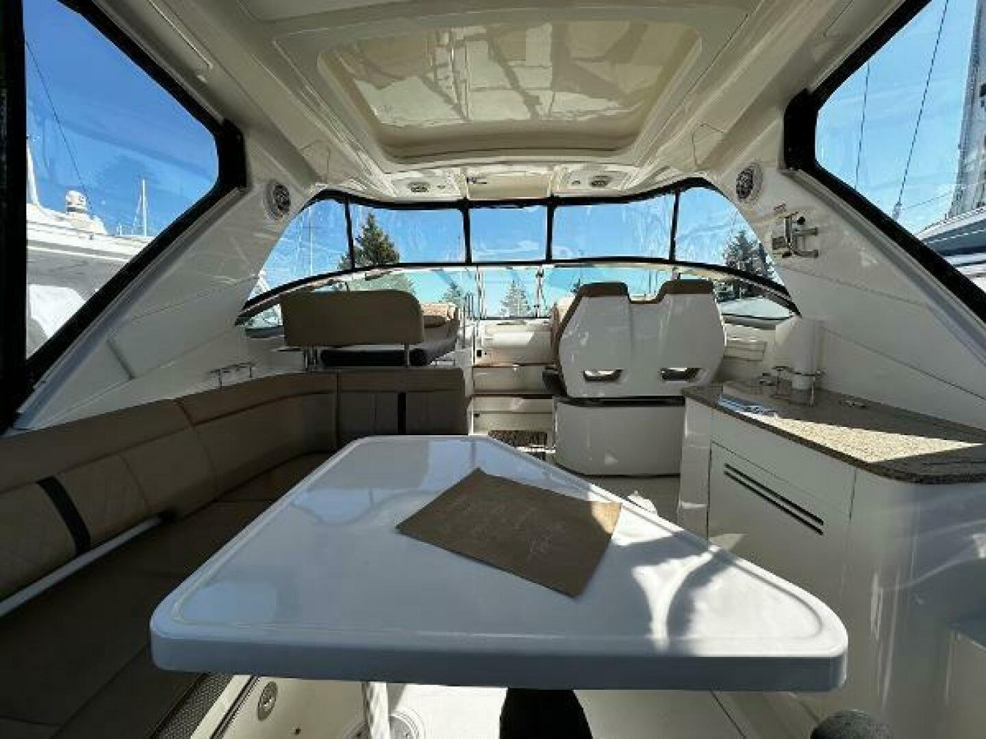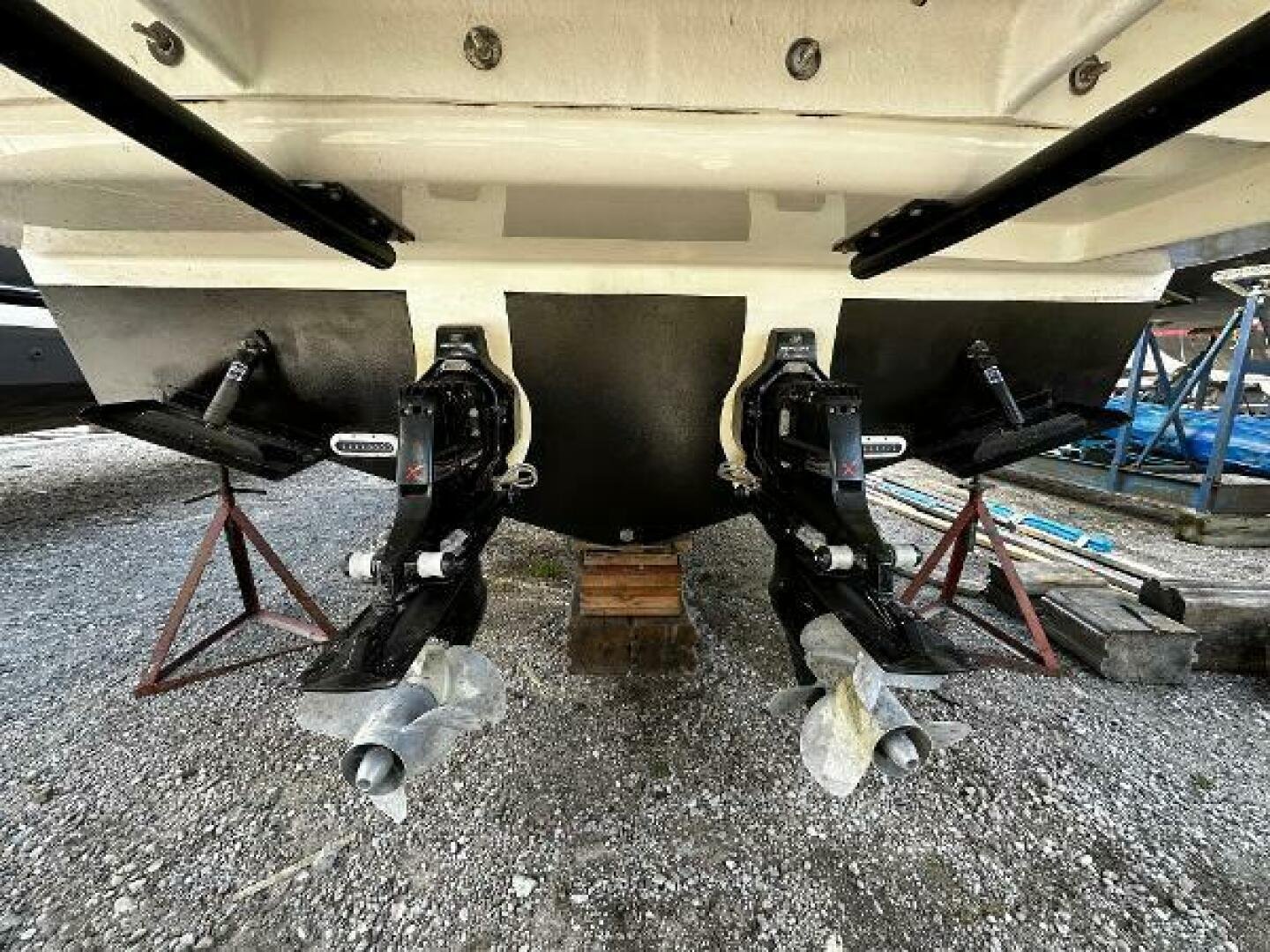 "FOGO" is in excellent condition. Turnkey and ready to hit the water! Powered by twin MerCruiser 6.2L, paired with bravo 3 outdrives with only 200 hours! The current owners had a full canvas enclosure added to the boat last season, greatly expanding the living space. The large extended swim platform features a built-in grill and bar sink, with a transom walkthrough to the cockpit. Luxurious wrap-around seating, all in excellent condition, paired with a granite top food prep station, wet bar, fridge, and TV makes this cockpit a dream for the entertainers.