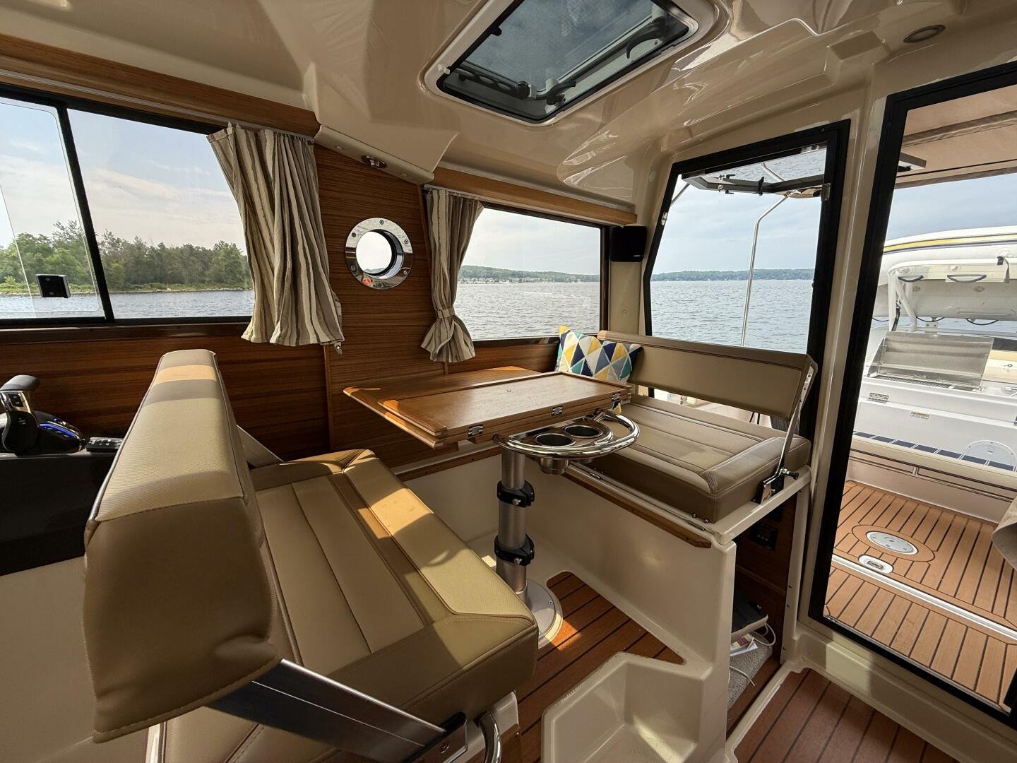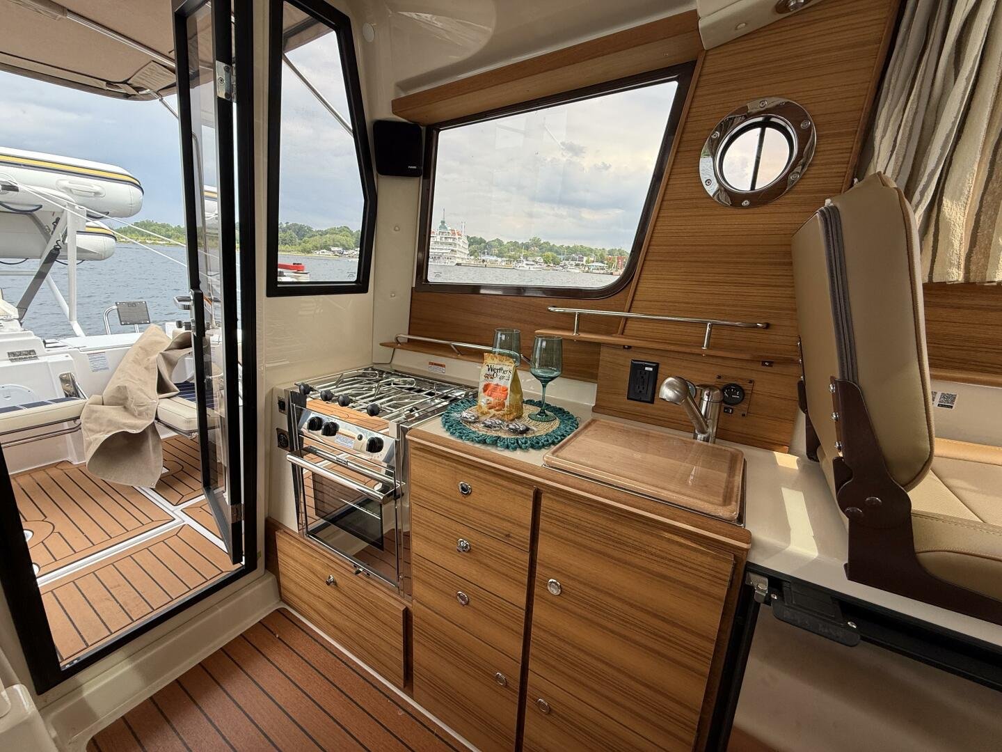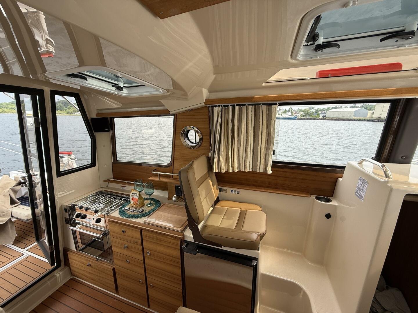 The curved front windshield and overhead glass atrium provide beautiful 360 degree views and generous light throughout the salon. Open the aft glass bulkhead in tandem with any of the hatches, windows, or port lights to deliver a fresh breeze throughout the cabin. Chefs will be delighted to cook in the full galley complete with a propane stove and oven with broiler, or to simply grill on the removable electric Kenyon grill. When taking in a gorgeous sunset, you and your guests can enjoy the view from the spacious cockpit or from the new double lounge seat on the bow of the R-27.