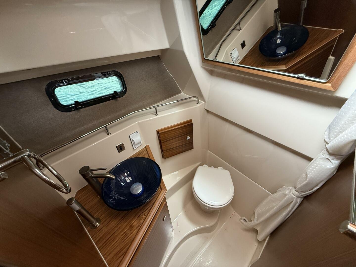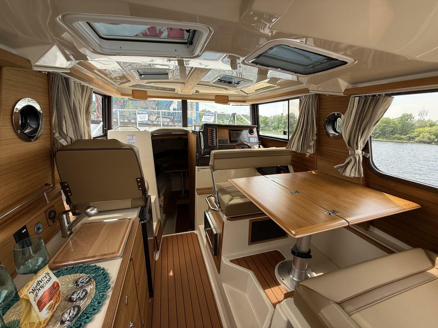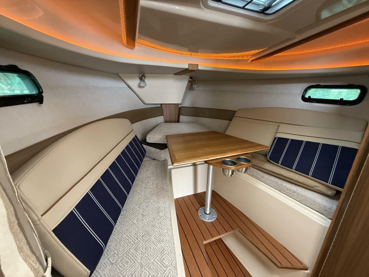 The curved front windshield and overhead glass atrium provide beautiful 360 degree views and generous light throughout the salon. Open the aft glass bulkhead in tandem with any of the hatches, windows, or port lights to deliver a fresh breeze throughout the cabin. Chefs will be delighted to cook in the full galley complete with a propane stove and oven with broiler, or to simply grill on the removable electric Kenyon grill. When taking in a gorgeous sunset, you and your guests can enjoy the view from the spacious cockpit or from the new double lounge seat on the bow of the R-27.