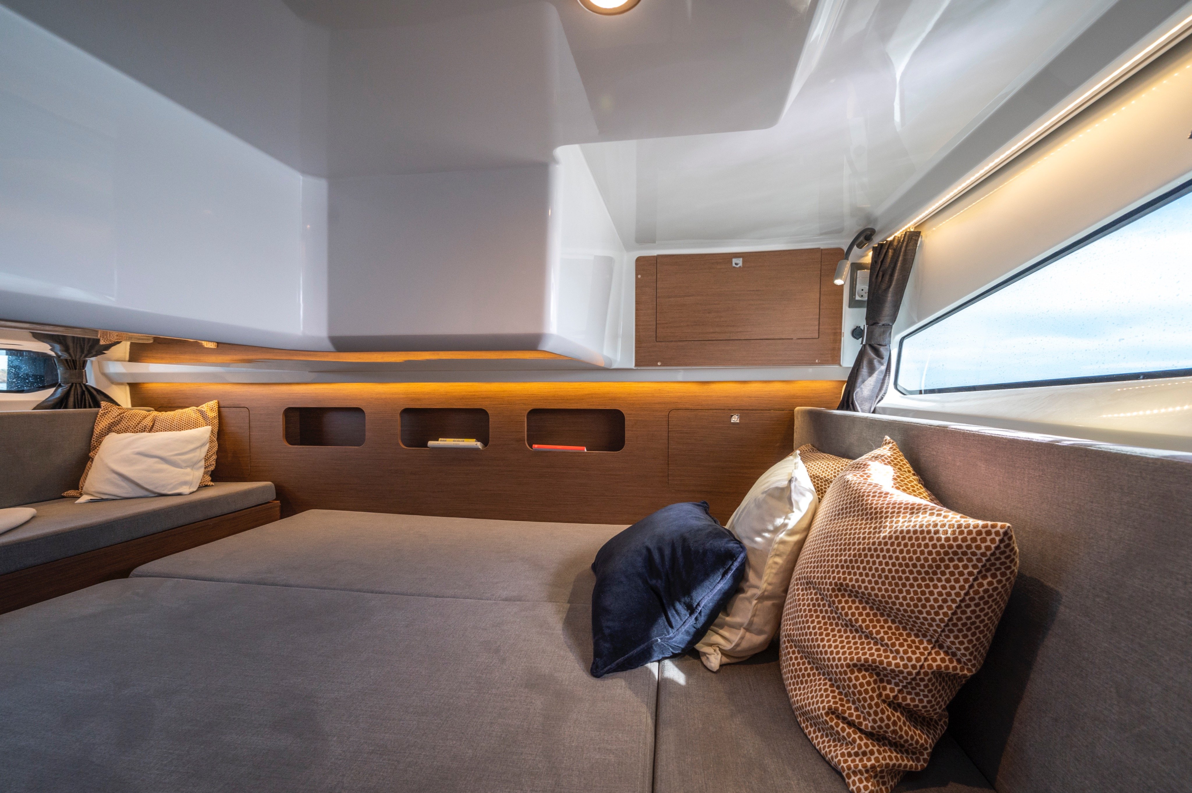 Her sleek hull and extensive glazing offer superb visibility and a welcoming interior that easily accommodates guests in two well-appointed cabins. Thoughtful layout features maximize indoor and outdoor living — from a sociable saloon and functional galley to a spacious cockpit and sun lounging areas — perfect for relaxed cruising or entertaining.